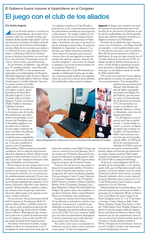 El juego con el club de los aliados Analía Argento La Casa Rosada apuesta a construir un nuevo bipartidismo: de un lado, el peronismo y del otro, el armado violeta, que integran desde aquellos más “puros” a los recientemente travestidos. El tablero de la última votación de las Sesiones Extraordinarias fue reflejo de ese escenario que seduce a La Libertad Avanza y que alimenta el karinismo. La Reforma Laboral fue el único proyecto donde el peronismo se mostró unido y votó sin fisuras. El marcador arrojó 42 a favor, 28 en contra y dos abstenciones. En esa división, el mileísmo –que sólo llega a 21 senadores propios– sumó diez radicales, tres del PRO y a los senadores que responden a los gobernadores de Neuquén (Rolando Figueroa), Salta (Gustavo Sáenz), Tucumán (Osvaldo Jaldo), Misiones (Hugo Passalacqua) y Córdoba (Martín Llaryora). La cuenta incluye a los habituales aliados y ex Juntos por el Cambio, es decir, los gobernadores de Entre Ríos (Rogelio Frigerio), Chaco (Leandro Zdero); Chubut (Ignacio Torres), Corrientes (Pablo Valdés) y Mendoza (Alfredo Cornejo). En el fondo, no se trata solo de recursos sino de la pelea electoral del año que viene, arranca este domingo con el discurso del Presidente ante la Asamblea Legislativa. La escudería de La Libertad Avanza aspira a terminar de pasar a sus filas a los gobernadores más cercanos como condición para acompañarlos en sus proyectos reeleccionistas. A los que consideran sinuosos, como el santafesino Maximiliano Pullaro, prometen plantarle candidatos. Está en juego la supervivencia electoral, admiten en estricto off the record, quienes evitan confrontar con LLA y analizan el apoyo que -aunque en descenso- mantiene el mileísmo a nivel nacional. En las vísperas de una semana clave en el Congreso, varios de esos dialoguistas compartieron una reunión vía zoom cuyos efectos buscaron controlar con un comunicado cuidadosamente redactado. El texto descartó que se trate de un armado electoral o de un bloque parlamentario opositor al Gobierno Nacional y describió como objetivo central “debatir desafíos comunes y articular visiones sobre el papel que estas jurisdicciones deben jugar en la agenda económica y política del país”. De esa reunión virtual participaron Raúl Jalil (Catamarca); Passalacqua; Rolo' Figueroa; Sáenz, Jaldo y también Carlos Sadir, que no tiene senadores propios por Jujuy e integra la liga de Provincias Unidas. Estuvo Alberto Weretilneck, que tras perder la elección se quedó sin representantes en el Congreso y busca evitar que Río Negro quede excluida de las negociaciones. Sin ánimo de levantar el perfil, el grupo delegó en Sáenz la comunicación y en el rionegrino la redacción de un texto que obvia cualquier tensión con Casa Rosada a pesar de que en las conversaciones privadas los gobernadores manifiestan preocupación y desconfianza. “Se analizó también el rol de estas provincias en el Congreso Nacional a través de sus representantes en Diputados y Senadores, así como el aporte de todos los gobiernos provinciales a la gobernabilidad de la Argentina”, se destacó. Y se informó que habrá encuentros periódicos “para sostener la sinergia entre estas provincias a favor de una agenda en temas de producción agrícola, turismo, minería, desarrollo energético”, entre otras. El armado se asemeja a un escudo protector frente los movimientos libertarios. Similar situación a la de Weretilneck protagoniza el chubutense Torres, que en algunas votaciones puede inclinar a los representantes de su provincia a favor de las reformas de Casa Rosada o debe asumir la independencia de senadores como Edith Terenzi, que votó en contra de la Ley de Glaciares. De todos modos, en el Gobierno Nacional le reconocen al chubutense su predicamento sobre diputados y senadores del PRO que se identifican en el espacio de Provincias Unidas. Torres es otro de los pocos que asume el riesgo de la exposición pública. El miércoles visitó el Senado para reunirse con los integrantes del nuevo interbloque Impulso País que integran Carlos 'Camau' Espínola (Corrientes); Alejandra Vigo (Córdoba), Edith Terenzi y Andrea Cristina (Chubut), Beatriz Ávila (Tucumán), Enrique Goerling (Misiones) y María Victoria Huala (La Pampa). El espacio tiene otros padrinos como Juan Schiaretti, Jaldo y hasta Mauricio Macri con Goerling como interlocutor. Aunque esta semana fueron funcionales a Casa Rosada se reivindican todavía como opositores 'constructivos' y advierten que analizarán su postura ley por ley y voto por voto. Espínola, que intentó unificar un espacio con la UCR y LLA en Corrientes, habló con casi todos los gobernadores dialoguistas. Todavía es prematuro pero nadie descarta una construcción electoral a futuro. “En ciertas cosas vamos a acompañar al Gobierno, en otros temas vamos a plantear correcciones”, le dijo el exregatista a Páginal12 al tiempo que enumeró una serie de iniciativas que presentarán para el desarrollo de sus provincias. El primero es una ley de biocombustibles, otro de los grandes temas que enfrenta intereses económicos y dispares posturas en el Parlamento. Por fuera de lo sabido hay más conversaciones con el Gobierno -con Diego Santilli, por ejemplo— o de los gobernadores entrerrianos. Son muchos más que lo que se publicita. Más allá de posicionamientos políticos o ideológicos, la mayoría sigue pasando por el Consejo Federal de Inversiones (CFI), un refugio donde ha habido reuniones en reserva y desde donde se gestionan recursos para opositores y dialoguistas. Nadie descarta que sea un búnker cuando la estrella de Milei pierda brillo. Tal vez sea esa la razón por la que algunos gobernadores con peluca no queman las naves con el peronismo. “Son recuperables”, admitió ante este diario Juan Manuel Abal Medina después de haber compartido una charla con Miguel Ángel Pichetto, que esta semana visitó a Cristina Fernández de Kirchner en San José 11