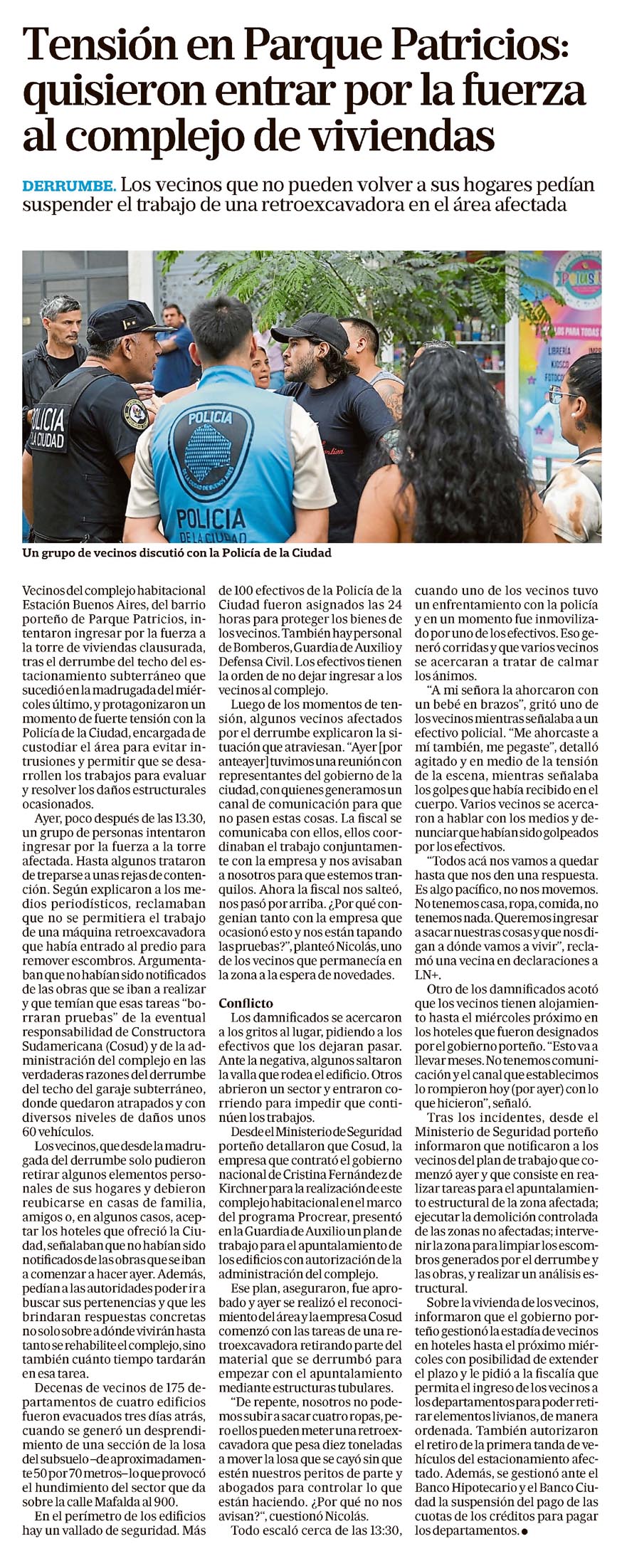 Tensión en Parque Patricios: quisieron entrar por la fuerza al complejo de viviendas DERRUMBE. Los vecinos que no pueden volver a sus hogares pedían suspender el trabajo de una retroexcavadora en el área afectada Un grupo de vecinos discutió con la Policía de la Ciudad Vecinos del complejo habitacional Estación Buenos Aires, del barrio porteño de Parque Patricios, intentaron ingresar por la fuerza a la torre de viviendas clausurada, tras el derrumbe del techo del estacionamiento subterráneo que sucedió en la madrugada del miércoles último, y protagonizaron un momento de fuerte tensión con la Policía de la Ciudad, encargada de custodiar el área para evitar intrusiones y permitir que se desarrollen los trabajos para evaluar y resolver los daños estructurales ocasionados. Ayer, poco después de las 13.30, un grupo de personas intentaron ingresar por la fuerza a la torre afectada. Hasta algunos trataron de treparse a unas rejas de contención. Según explicaron a los medios periodísticos, reclamaban que no se permitiera el trabajo de una máquina retroexcavadora que había entrado al predio para remover escombros. Argumentaban que no habían sido notificados de las obras que se iban a realizar y que temían que esas tareas "borraran pruebas" de la eventual responsabilidad de Constructora Sudamericana (Cosud) y de la administración del complejo en las verdaderas razones del derrumbe del techo del garaje subterráneo, donde quedaron atrapados y con diversos niveles de daños unos 60 vehículos. Los vecinos, que desde la madrugada del derrumbe solo pudieron retirar algunos elementos personales de sus hogares y debieron reubicarse en casas de familia, amigos o, en algunos casos, aceptar los hoteles que ofreció la Ciudad, señalaban que no habían sido notificados de las obras que se iba a comenzar a hacer ayer. Además, pedían a las autoridades poder ir a buscar sus pertenencias y que les brindaran respuestas concretas no solo sobre a dónde vivirán hasta tanto se rehabilite el complejo, sino también cuánto tiempo tardarán en esa tarea. Decenas de vecinos de 175 departamentos de cuatro edificios fueron evacuados tres días atrás, cuando se generó un desprendimiento de una sección de la losa del subsuelo -de aproximadamente 50 por 70 metros- lo que provocó el hundimiento del sector que da sobre la calle Mafalda al 900. En el perímetro de los edificios hay un vallado de seguridad. Más de 100 efectivos de la Policía de la Ciudad fueron asignados las 24 horas para proteger los bienes de los vecinos. También hay personal de Bomberos, Guardia de Auxilio y Defensa Civil. Los efectivos tienen la orden de no dejar ingresar a los vecinos al complejo. Luego de los momentos de tensión, algunos vecinos afectados por el derrumbe explicaron la situación que atraviesan. "Ayer [por anteayer] tuvimos una reunión con representantes del gobierno de la ciudad, con quienes generamos un canal de comunicación para que no pasen estas cosas. La fiscal se comunicaba con ellos, ellos coordinaban el trabajo conjuntamente con la empresa y nos avisaban a nosotros para que estemos tranquilos. Ahora la fiscal nos salteó, nos pasó por arriba. ¿Por qué con-genian tanto con la empresa que ocasionó esto y nos están tapando las pruebas?", planteó Nicolás, uno de los vecinos que permanecía en la zona a la espera de novedades. Conflicto Los damnificados se acercaron a los gritos al lugar, pidiendo a los efectivos que los dejaran pasar. Ante la negativa, algunos saltaron la valla que rodea el edificio. Otros abrieron un sector y entraron corriendo para impedir que continúen los trabajos. Desde el Ministerio de Seguridad porteño detallaron que Cosud, la empresa que contrató el gobierno nacional de Cristina Fernández de Kirchner para la realización de este complejo habitacional en el marco del programa Procrear, presentó en la Guardia de Auxilio un plan de trabajo para el apuntalamiento de los edificios con autorización de la administración del complejo. Ese plan, aseguraron, fue aprobado y ayer se realizó el reconocimiento del área y la empresa Cosud comenzó con las tareas de una retroexcavadora retirando parte del material que se derrumbó para empezar con el apuntalamiento mediante estructuras tubulares. "De repente, nosotros no podemos subir a sacar cuatro ropas, pero ellos pueden meter una retroexcavadora que pesa diez toneladas a mover la losa que se cayó sin que estén nuestros peritos de parte y abogados para controlar lo que están haciendo. ¿Por qué no nos avisan?", cuestionó Nicolás. Todo escaló cerca de las 13:30, cuando uno de los vecinos tuvo un enfrentamiento con la policía y en un momento fue inmovilizado por uno de los efectivos. Eso generó corridas y que varios vecinos se acercaran a tratar de calmar los ánimos. "A mi señora la ahorcaron con un bebé en brazos", gritó uno de los vecinos mientras señalaba a un efectivo policial. "Me ahorcaste a mí también, me pegaste", detalló agitado y en medio de la tensión de la escena, mientras señalaba los golpes que había recibido en el cuerpo. Varios vecinos se acercaron a hablar con los medios y denunciaron que habían sido golpeados por los efectivos. "Todos acá nos vamos a quedar hasta que nos den una respuesta. Es algo pacífico, no nos movemos. No tenemos casa, ropa, comida, no tenemos nada. Queremos ingresar a sacar nuestras cosas y que nos digan a dónde vamos a vivir", reclamó una vecina en declaraciones a LN+. Otro de los damnificados acotó que los vecinos tienen alojamiento hasta el miércoles próximo en los hoteles que fueron designados por el gobierno porteño. "Esto va a llevar meses. No tenemos comunicación y el canal que establecimos lo rompieron hoy (por ayer) con lo que hicieron", señaló. Tras los incidentes, desde el Ministerio de Seguridad porteño informaron que notificaron a los vecinos del plan de trabajo que comenzó ayer y que consiste en realizar tareas para el apuntalamiento e