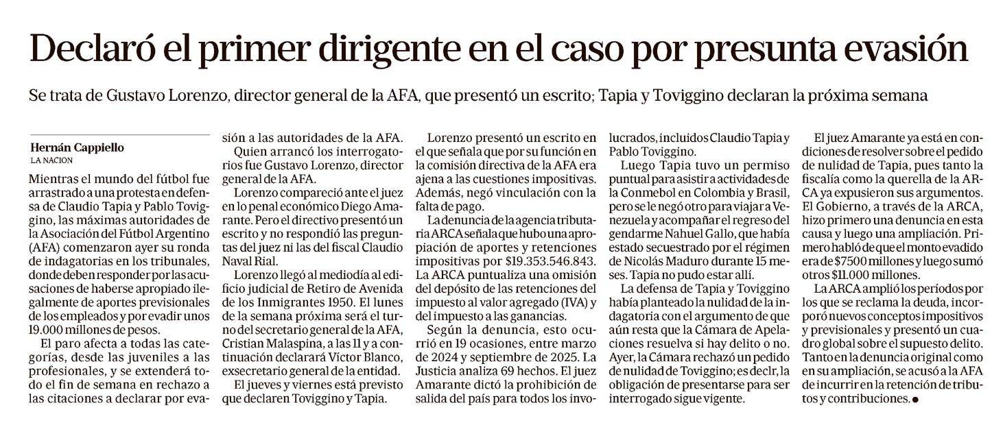 Declaró el primer dirigente en el caso por presunta evasión Hernán Cappiello Se trata de Gustavo Lorenzo, director general de la AFA, que presentó un escrito; Tapia y Toviggino declaran la próxima semana. Hernán Cappiello LANACION Mientras el mundo del fútbol fue arrastrado a una protesta en defensa de Claudio Tapia y Pablo Toviggino, las máximas autoridades de la Asociación del Fútbol Argentino (AFA) comenzaron ayer su ronda de indagatorias en los tribunales, donde deben responder por las acusaciones de haberse apropiado ilegalmente de aportes previsionales de los empleados y por evadir unos 19.000 millones de pesos. El paro afecta a todas las categorías, desde las juveniles a las profesionales, y se extenderá todo el fin de semana en rechazo a las citaciones a declarar por evasión a las autoridades de la AFA. Quien arrancó los interrogatorios fue Gustavo Lorenzo, director general de la AFA. Lorenzo compareció ante el juez en lo penal económico Diego Amarante. Pero el directivo presentó un escrito y no respondió las preguntas del juez ni las del fiscal Claudio Naval Rial. Lorenzo llegó al mediodía al edificio judicial de Retiro de Avenida de los Inmigrantes 1950. El lunes de la semana próxima será el turno del secretario general de la AFA, Cristian Malaspina, a las 11 y a continuación declarará Víctor Blanco, exsecretario general de la entidad. El jueves y viernes está previsto que declaren Toviggino y Tapia. Lorenzo presentó un escrito en el que señala que por su función en la comisión directiva de la AFA era ajena a las cuestiones impositivas. Además, negó vinculación con la falta de pago. La denuncia de la agencia tributaria ARCA señala que hubo una apropiación de aportes y retenciones impositivas por $19.353.546.843. La ARCA puntualiza una omisión del depósito de las retenciones del impuesto al valor agregado (IVA) y del impuesto a las ganancias. Según la denuncia, esto ocurrió en 19 ocasiones, entre marzo de 2024 y septiembre de 2025. La Justicia analiza 69 hechos. El juez Amarante dictó la prohibición de salida del país para todos los involucrados, incluidos Claudio Tapia y Pablo Toviggino. Luego Tapia tuvo un permiso puntual para asistir a actividades de la Conmebol en Colombia y Brasil, pero se le negó otro para viajar a Venezuela y acompañar el regreso de Gendarme Nahuel Gallo, que había estado secuestrado por el régimen de Nicolás Maduro durante 15 meses. Tapia no pudo estar allí. La defensa de Tapia y Toviggino había planteado la nulidad de la indagatoria con el argumento de que aún resta que la Cámara de Apelaciones resuelva si hay delito o no. Ayer, la Cámara rechazó un pedido de nulidad de Toviggino; es decir, la obligación de presentarse para ser interrogado sigue vigente. El juez Amarante ya está en condiciones de resolver sobre el pedido de nulidad de Tapia, pues tanto la fiscalía como la querella de la ARCA ya expusieron sus argumentos. El Gobierno, a través de la ARCA, hizo primero una denuncia en esta causa y luego una ampliación. Primero habló de que el monto evadido era de $7500 millones y luego sumó otros $11.000 millones. La ARCA amplió los períodos por los que se reclama la deuda, incorporó nuevos conceptos impositivos y previsionales y presentó un cuadro global sobre el supuesto delito. Tanto en la denuncia original como en su ampliación, se acusó a la AFA de incurrir en la retención de tributos y contribuciones. Menciones: Gustavo Lorenzo, Claudio Tapia, Pablo Toviggino, AFA, Diego Amarante, Naval Rial, Cristian Malaspina, Víctor Blanco, ARCA, Nicolás Maduro, Nahuel Gallo, Cámara de Apelaciones, Colombia, Brasil, Venezuela