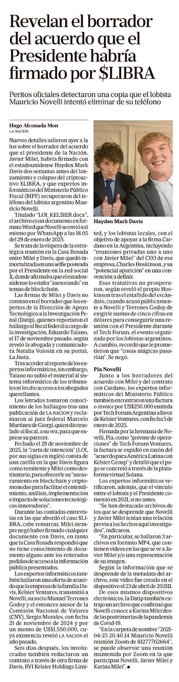 Revelan el borrador del acuerdo que el Presidente habría firmado por $LIBRA Hugo Alconada Mon Peritos oficiales detectaron una copia que el lobista Mauricio Novelli intentó eliminar de su teléfono. Hugo Alconada Mon LA NACION Nuevos detalles salieron ayer a la luz sobre el borrador del acuerdo que el presidente de la Nación, Javier Milei, habría firmado con el estadounidense Hayden Mark Davis dos semanas antes del lanzamiento y colapso del criptoactivo $LIBRA, y que expertos informáticos del Ministerio Público Fiscal (MPF) recuperaron del teléfono del lobista argentino Mauricio Novelli. Titulado “LOI KELSIER.docx”, el archivo es un documento en formato Word que Novelli se envió así mismo por WhatsApp a las 18.05 del 29 de enero de 2025. Se trata de la víspera de la estratégica reunión en la Casa Rosada entre Milei y Davis, que quedó inmortalizada en una selfie posteada por el Presidente en la red social X, donde afirmaba que el estadounidense lo estaba "asesorando" en temas de blockchain. Las firmas de Milei y Davis no constan en el borrador que los expertos de la Dirección de Apoyo Tecnológico a la Investigación Penal (Datip), quienes reportaron el hallazgo al fiscal federal a cargo de la investigación, Eduardo Taiano, el 17 de noviembre pasado, según reveló la abogada y comunicadora Natalia Volosin en su portal, La Justa. Tras acceder al reporte de los expertos informáticos, sin embargo, Taiano no subió el material al sistema informático de los tribunales ni les dio acceso a los abogados querellantes. Los letrados tomaron conocimiento de los hallazgos tras una publicación de LA NACION y reclamaron al juez federal Marcelo Martínez de Giorgi, quien dio traslado al fiscal, a su vez, para que exprese su parecer. Fechado el 29 de noviembre de 2025, la "carta de intención" (LOI, por sus siglas en inglés) consta de una carilla en la que Davis figura como remitente y Milei como destinatario, para ofrecerle su "asesoramiento en blockchain y criptomonedas para facilitar el entendimiento, análisis, implementación e impacto de soluciones tecnológicas innovadoras". Durante las contadas entrevistas en las que abordó el caso $LIBRA, cabe remarcar, Milei siempre negó haber firmado cualquier documento con Davis, en tanto que la Casa Rosada respondió que no tiene conocimiento de documento alguno ante los reiterados pedidos de acceso a la información pública presentados. Los expertos informáticos también hallaron una oferta de acuerdo que la empresa de la familia Davis, Kelsier Ventures, transmitió a Novelli, su socio Manuel Terrones Godoy y el entonces asesor de la Comisión Nacional de Valores (CNV), Sergio Morales, con fecha 21 de noviembre de 2024 y por un monto de US$1.550.000, cuya existencia reveló LA NACION el año pasado. Seis días después, los involucrados también redactaron un contrato a través de otra firma de Davis, BVI Kelsier Holdings Limi- ted, y los lobistas locales, con el objetivo de apoyar a la firma Cardano en la Argentina, incluyendo "reuniones privadas uno a uno con Javier Milei" del CEO de esa empresa, Charles Hoskinson, y su "potencial aparición" en una convención a definir. Esas tratativas no prosperaron, según reveló el propio Hoskinson tras el estallido del escándalo, cuando acusó públicamente a Novelli y Terrones Godoy de exigirle sumas de cinco cifras de dólares para conseguirle una reunión con el Presidente durante el Tech Forum, el evento organizado por los lobistas argentinos. A cambio, recordó que le prometieron que "cosas mágicas pasarían". Se negó. Pía Novelli Junto a los borradores del acuerdo con Milei y del contrato con Cardano, los expertos informáticos del Ministerio Público también encontraron una factura o invoice por US$250.000 emitida por Tech Forum Argentina a favor de Kelsier Ventures, con fecha 5 de enero de 2025. Firmada por la hermana de Novelli, Pía, como "gerente de operaciones" de Tech Forum Ventures, la factura se expidió en razón del "acuerdo para América Latina con Kelsier Group" y detalló que el pago se concretó a través de la plataforma virtual Solana. Los expertos informáticos verificaron, además, que el vínculo entre el lobista y el Presidente comenzó en 2021, si no antes. "Se han destacado archivos de los que se desprende que Novelli y Javier Milei tenían una relación previa a los hechos aquí investigados", indicaron. "En particular, se hallaron 3 archivos en formato MP4, que contienen videos en los que se ve a Javier Milei y/o una representación de su imagen. Según la información que se desprende de la metadata del archivo, este video fue creado en el dispositivo el 23 de abril de 2021. De esos mismos dispositivos electrónicos, la Datip también extrajo un archivo que confirmó que Novelli conoce a Karina Milei desde las postrimerías de la pandemia de Covid-19. "En la carpeta de nombre "2021-04-25 20.40.14 Mauricio Novelli reunión Zoom de 81277762664", se puede observar una reunión mantenida por Zoom en la que participan Novelli, Javier Milei y Karina Milei". Menciones: Javier Milei, Hayden Mark Davis, Mauricio Novelli, Eduardo Taiano, Natalia Volosin, Marcelo Martínez de Giorgi, Pía Novelli, Manuel Terrones Godoy, Sergio Morales, Charles Hoskinson, Karina Milei, Ministerio Público Fiscal (MPF), Dirección de Apoyo Tecnológico a la Investigación Penal (Datip), Comisión Nacional de Valores (CNV), $LIBRA, Cardano, Tech Forum Argentina, Kelsier Ventures, BVI Kelsier Holdings Limi- ted, WhatsApp, X (red social), Solana, Covid-19, Zoom, LA NACION, La Justa