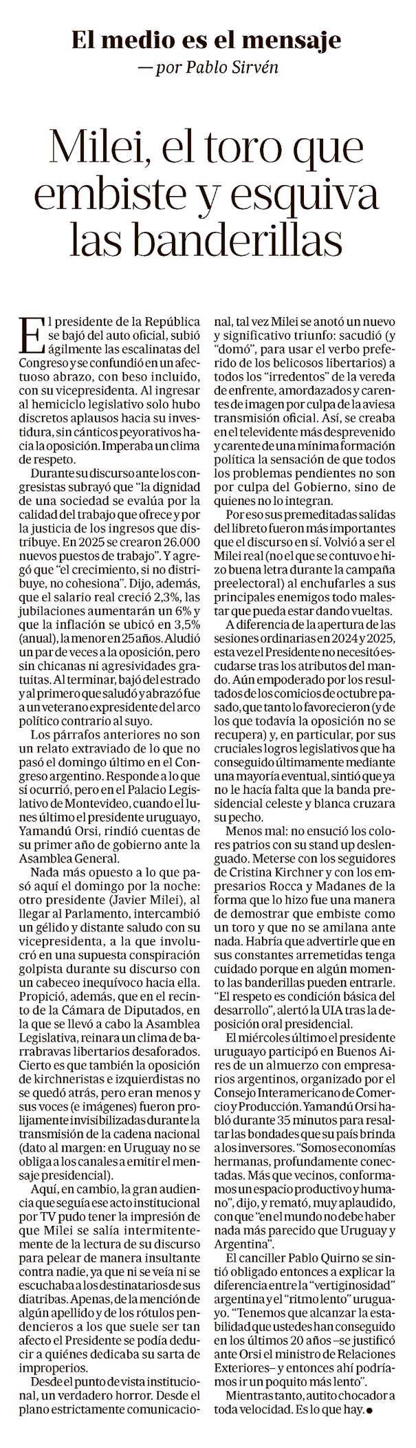 Milei, el toro que embiste y esquiva las banderillas Pablo Sirvén El presidente de la República se bajó del auto oficial, subió ágilmente las escalinatas del Congreso y se confundió en un afectuoso abrazo, con beso incluido, con su vicepresidenta. Al ingresar al hemiciclo legislativo solo hubo discretos aplausos hacia su investidura, sin cánticos peyorativos hacia la oposición. Imperaba un clima de respeto. Durante su discurso ante los congresistas subrayó que “la dignidad de una sociedad se evalúa por la calidad del trabajo que ofrece y por la justicia de los ingresos que distribuye. En 2025 se crearon 26.000 nuevos puestos de trabajo”. Y agregó que “el crecimiento, si no distribuye, no cohesiona”. Dijo, además, que el salario real creció 2,3%, las jubilaciones aumentarán un 6% y que la inflación se ubicó en 3,5% (anual), la menor en 25 años. Aludió un par de veces a la oposición, pero sin chicanas ni agresividades gratuitas. Al terminar, bajó del estrado y al primero que saludó y abrazó fue a un veterano expresidente del arco político contrario al suyo. Los párrafos anteriores no son un relato extraviado de lo que no pasó el domingo último en el Congreso argentino. Responde a lo que sí ocurrió, pero en el Palacio Legislativo de Montevideo, cuando el lunes último el presidente uruguayo, Yamandú Orsi, rindió cuentas de su primer año de gobierno ante la Asamblea General. Nada más opuesto a lo que pasó aquí el domingo por la noche: otro presidente (Javier Milei), al llegar al Parlamento, intercambió un gélido y distante saludo con su vicepresidenta, a la que involucró en una supuesta conspiración golpista durante su discurso con un cabeceo inequívoco hacia ella. Propició, además, que en el recinto de la Cámara de Diputados, en la que se llevó a cabo la Asamblea Legislativa, reinara un clima de "barrabravas libertarios" desaforados. Cierto es que también la oposición de "kirchneristas" e "izquierdistas" no se quedó atrás, pero eran menos y sus voces (e imágenes) fueron prolijamente invisibilizadas durante la transmisión de la cadena nacional (dato al margen: en Uruguay no se obliga a los canales a emitir el mensaje presidencial). Aquí, en cambio, la gran audiencia que seguía ese acto institucional por TV pudo tener la impresión de que Milei se salía intermitentemente de la lectura de su discurso para pelear de manera insultante contra nadie, ya que ni se veía ni se escuchaba a los destinatarios de sus diatribas. Apenas, de la mención de algún apellido y de los rótulos "pendencieros" a los que suele ser tan afecto el Presidente se podía deducir a quiénes dedicaba su sarta de improperios. Desde el punto de vista institucional, un verdadero horror. Desde el plano estrictamente comunicacional, tal vez Milei se anotó un nuevo y significativo triunfo: sacudió (y "domó", para usar el verbo preferido de los belicosos libertarios) a todos los "irredentos" de la vereda de enfrente, amordazados y carentes de imagen por culpa de la aviesa transmisión oficial. Así, se creaba en el televidente más desprevenido y carente de una mínima formación política la sensación de que todos los problemas pendientes no son por culpa del Gobierno, sino de quienes no lo integran. Pues esos sus premeditadas salidas del libreto fueron más importantes que el discurso en sí. Volvió a ser el Milei real (no el que se contuvo e hizo buena letra durante la campaña preelectoral) al enchufarles a sus principales enemigos todo malestar que pueda estar dando vueltas. A diferencia de la apertura de las sesiones ordinarias en 2024 y 2025, esta vez el Presidente no necesitó escudarse tras los atributos del mando. Aún empoderado por los resultados de los comicios de octubre pasado, que tanto lo favorecieron (y de los que todavía la oposición no se recupera) y, en particular, por sus cruciales logros legislativos que ha conseguido últimamente mediante una mayoría eventual, sintió que ya no le hacía falta que la banda presidencial celeste y blanca cruzara su pecho. Menos mal: no ensució los "colores patrios" con su "stand up" deslenguado. Meterse con los seguidores de Cristina Kirchner y con los empresarios Rocca y Madanes de la forma que lo hizo fue una manera de demostrar que embiste como un toro y que no se amilana ante nada. Habría que advertirle que en sus constantes arremetidas tenga cuidado porque en algún momento las banderillas pueden entrarle. "El respeto es condición básica del desarrollo", alertó la UIA tras la deposición oral presidencial. El miércoles último el presidente uruguayo participó en Buenos Aires de un almuerzo con empresarios argentinos, organizado por el Consejo Interamericano de Comercio y Producción. Yamandú Orsi habló durante 35 minutos para resaltar las bondades que su país brinda a los inversores. "Somos economías hermanas, profundamente conectadas. Más que vecinos, conformamos un espacio productivo y humano", dijo, y remató, muy aplaudido, con que "en el mundo no debe haber nada más parecido que Uruguay y Argentina". El canciller Pablo Quirno se sintió obligado entonces a explicar la diferencia entre la "vertiginosidad" argentina y el "ritmo lento" uruguayo. "Tenemos que alcanzar la estabilidad que ustedes han conseguido en los últimos 20 años -se justificó ante Orsi el ministro de Relaciones Exteriores- y entonces ahí podríamos ir un poquito más lento". Mientras tanto, autito chocador a toda velocidad. Es lo que hay. Menciones: Javier Milei, Yamandú Orsi, Pablo Quirno, Cristina Kirchner, Rocca, Madanes, UIA, Congreso argentino, Palacio Legislativo de Montevideo, Asamblea General, Cámara de Diputados