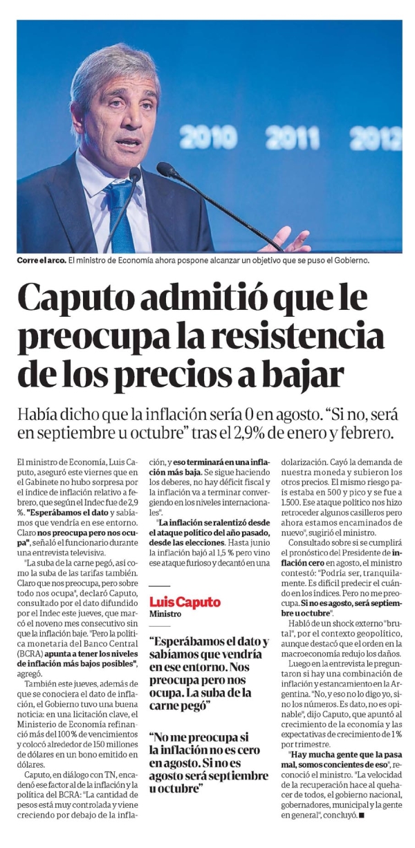 Caputo admitió que le preocupa la resistencia de los precios a bajar Corre el arco. El ministro de Economía ahora pospone alcanzar un objetivo que se puso el Gobierno. Caputo admitió que le preocupa la resistencia de los precios a bajar. Había dicho que la inflación sería 0 en agosto. "Si no, será en septiembre u octubre" tras el 2,9% de enero y febrero. El ministro de Economía, Luis Caputo, aseguró este viernes que en el Gabinete no hubo sorpresa por el índice de inflación relativo a febrero, que según el Indec fue de 2,9 %."Esperábamos el dato y sabíamos que vendría en ese entorno. Claro nos preocupa pero nos ocupa", señaló el funcionario durante una entrevista televisiva. "La suba de la carne pegó, así como la suba de las tarifas también. Claro que nos preocupa, pero sobre todo nos ocupa", declaró Caputo, consultado por el dato difundido por el Indec este jueves, que marcó el noveno mes consecutivo sin que la inflación baje. "Pero la política monetaria del Banco Central (BCRA) apunta a tener los niveles de inflación más bajos posibles", agregó. También este jueves, además de que se conociera el dato de inflación, el Gobierno tuvo una buena noticia: en una licitación clave, el Ministerio de Economía refinanció más del 100% de vencimientos y colocó alrededor de 150 millones de dólares en un bono emitido en dólares. Caputo, en diálogo con TN, encadenó ese factor al de la inflación y la política del BCRA: "La cantidad de pesos está muy controlada y viene creciendo por debajo de la infla-ción, y eso terminará en una inflación más baja. Se sigue haciendo los deberes, no hay déficit fiscal y la inflación va a terminar convergiendo en los niveles internacionales". "La inflación se ralentizó desde el ataque político del año pasado, desde las elecciones. Hasta junio la inflación bajó al 1,5 % pero vino ese ataque furioso y decantó en una Luis Caputo Ministro "Esperábamos el dato y sabíamos que vendría en ese entorno. Nos preocupa pero nos ocupa. La suba de la carne pegó" "No me preocupa si la inflación no es cero en agosto. Si no es agosto será septiembre u octubre" dolarización. Cayó la demanda de nuestra moneda y subieron los otros precios. El mismo riesgo país estaba en 500 y pico y se fue a 1.500. Ese ataque político nos hizo retroceder algunos casilleros pero ahora estamos encaminados de nuevo", sugirió el ministro. Consultado sobre si se cumplirá el pronóstico del Presidente de inflación cero en agosto, el ministro contestó: "Podría ser, tranquilamente. Es difícil predecir el cuándo en los índices. Pero no me preocupa. Si no es agosto, será septiembre u octubre". Habló de un shock externo "brutal", por el contexto geopolítico, aunque destacó que el orden en la macroeconomía redujo los daños. Luego en la entrevista le preguntaron si hay una combinación de inflación y estancamiento en la Argentina."No, y eso no lo digo yo, sino los números. Es dato, no es opinable", dijo Caputo, que apuntó al crecimiento de la economía y las expectativas de crecimiento de 1% por trimestre. "Hay mucha gente que la pasa mal, somos concientes de eso", reconoció el ministro. "La velocidad de la recuperación hace al quehacer de todos, el gobierno nacional, gobernadores, municipal y la gente en general", concluyó. Menciones: Ceco1 cfinanE cnot