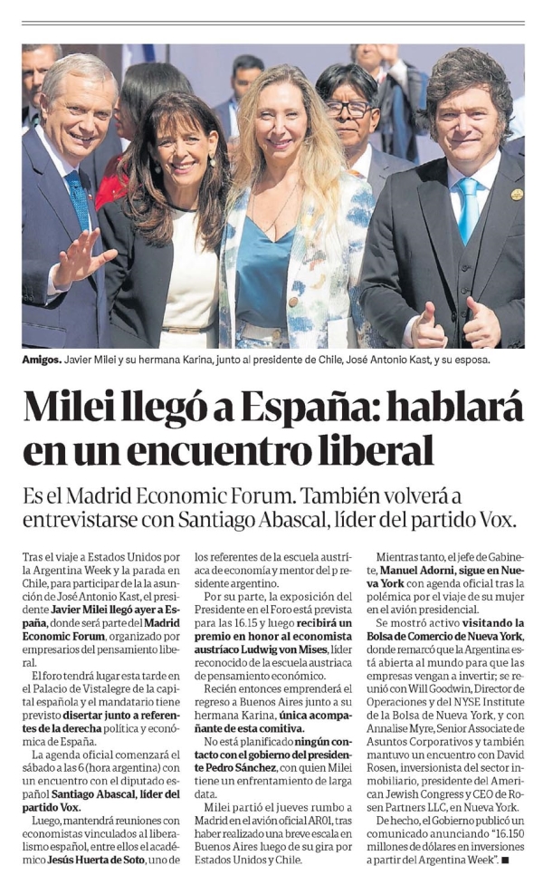 Milei llegó a España: hablará en un encuentro liberal Amigos. Javier Milei y su hermana Karina, junto al presidente de Chile, José Antonio Kast, y su esposa. Milei llegó a España: hablará en un encuentro liberal Es el Madrid Economic Forum. También volverá a entrevistarse con Santiago Abascal, líder del partido Vox. Tras el viaje a Estados Unidos por la Argentina Week y la parada en Chile, para participar de la asunción de José Antonio Kast, el presidente Javier Milei llegó ayer a España, donde será parte del Madrid Economic Forum, organizado por empresarios del pensamiento liberal. El foro tendrá lugar esta tarde en el Palacio de Vistalegre de la capital española y el mandatario tiene previsto disertar junto a referentes de la derecha política y económica de España. La agenda oficial comenzará el sábado a las 6 (hora argentina) con un encuentro con el diputado español Santiago Abascal, líder del partido Vox. Luego, mantendrá reuniones con economistas vinculados al liberalismo español, entre ellos el académico Jesús Huerta de Soto, uno de los referentes de la escuela austriaca de economía y mentor del presidente argentino. Por su parte, la exposición del Presidente en el Foro está prevista para las 16.15 y luego recibirá un premio en honor al economista austriaco Ludwig von Mises, líder reconocido de la escuela austriaca de pensamiento económico. Recién entonces emprenderá el regreso a Buenos Aires junto a su hermana Karina, única acompañante de esta comitiva. No está planificado ningún contacto con el gobierno del presidente Pedro Sánchez, con quien Milei tiene un enfrentamiento de larga data. Milei partió el jueves rumbo a Madrid en el avión oficial AROL, tras haber realizado una breve escala en Buenos Aires luego de su gira por Estados Unidos y Chile. Mientras tanto, el jefe de Gabinete, Manuel Adorni, sigue en Nueva York con agenda oficial tras la polémica por el viaje de su mujer en el avión presidencial. Se mostró activo visitando la Bolsa de Comercio de Nueva York, donde remarcó que la Argentina está abierta al mundo para que las empresas vengan a invertir; se reunió con Will Goodwin, Director de Operaciones y del NYSE Institute de la Bolsa de Nueva York, y con Annalise Myre, Senior Associate de Asuntos Corporativos y también mantuvo un encuentro con David Rosen, inversionista del sector inmobiliario, presidente del American Jewish Congress y CEO de Rosen Partners LLC, en Nueva York. De hecho, el Gobierno publicó un comunicado anunciando "16.150 millones de dólares en inversiones a partir del Argentina Week". Menciones: cpol1 ejesapp