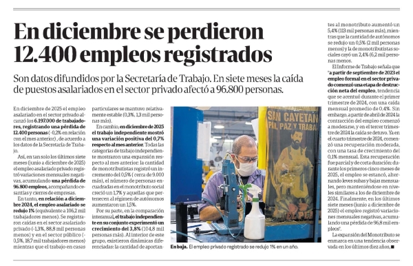 En diciembre se perdieron 12.400 empleos registrados Son datos difundidos por la Secretaría de Trabajo. En siete meses la caída de puestos asalariados en el sector privado afectó a 96.800 personas. En diciembre de 2025 el empleo asalariado en el sector privado alcanzó los 6.197.000 de trabajadores, registrando una pérdida de 12.400 personas (-0,2% en relación con el mes anterior), de acuerdo a los datos de la Secretaría de Trabajo. Así, en tan solo los últimos seis meses (junio a diciembre de 2025) el empleo asalariado privado registró variaciones mensuales negativas, acumulando una pérdida de 96.800 empleos, acompañando cesantías y cierres de empresas. En tanto, en relación a diciembre 2024, el empleo asalariado se redujo 1% (equivalente a 106,2 mil trabajadores menos). Se registraron caídas en el sector asalariado privado (-1,3%, 88,8 mil personas menos) y en el sector público (-0,5%, 18,7 mil trabajadores menos) mientras que el trabajo en casas particulares se mantuvo relativamente estable (0,3%, 1,3 mil personas más). En cambio, en diciembre de 2025 el trabajo independiente mostró una variación positiva del 0,7% respecto al mes anterior. Todas las categorías de trabajo independiente mostraron una expansión respecto al mes anterior: la cantidad de monotributistas registró un incremento del 0,5% (cerca de 9.000 más), el número de personas encuadradas en el monotributo social creció un 1,7% y aquellas que pertenecen al régimen de autónomos aumentaron un 1,5%. Por su parte, en la comparación interanual, el trabajo independiente en su conjunto experimentó un crecimiento del 3,8% (104,8 mil personas más). Al interior de este grupo, existieron dinámicas diferenciadas: la cantidad de aportantes al monotributo aumentó un 5,4% (113 mil personas más), mientras que la cantidad de autónomos se redujo un 0,5% (2 mil personas menos) y la de monotributistas sociales cayó un 2,4% (6,2 mil personas menos. El Informe de Trabajo señala que "a partir de septiembre de 2023 el empleo formal en el sector privado comenzó una etapa de destrucción neta del empleo, tendencia que se acentuó durante el primer trimestre de 2024, con una caída mensual promedio de 0,4%. Sin embargo, a partir de abril de 2024 la contracción del empleo comenzó a moderarse, y en el tercer trimestre de 2024 la caída se detuvo. Ya en el cuarto trimestre de 2024, comenzó una recuperación moderada, con una tasa de crecimiento del 0,1% mensual. Esta recuperación fue parcial y de corta duración: durante los primeros cinco meses de 2025, el empleo se estancó, alternando leves subas y bajas mensuales, pero manteniéndose en niveles similares a los de diciembre de 2024. Finalmente, en los últimos siete meses (junio a diciembre de 2025) el empleo registró variaciones mensuales negativas, acumulando una pérdida de 96,8 mil empleos". La expansión del Monotributo se enmarca en una tendencia observada en los últimos diez años. En baja. El empleo privado registrado se redujo 1% en un año. Menciones: Ceco1 cfinanE ejesapp