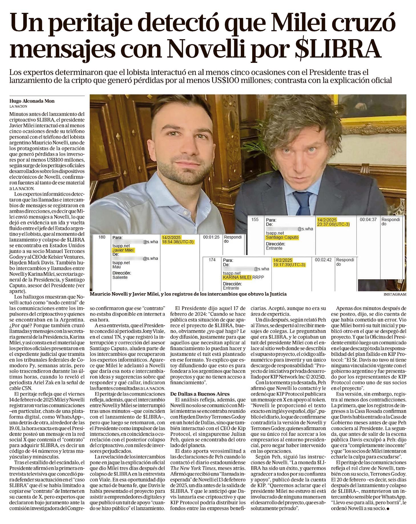 Un peritaje detectó que Milei cruzó mensajes con Novelli por $LIBRA Hugo Alconada Mon Los expertos determinaron que el lobista interactuó en al menos cinco ocasiones con el Presidente tras el lanzamiento de la cripto que generó pérdidas por al menos US$100 millones; contrasta con la explicación oficial Hugo Alconada Mon LA NACION Minutos antes del lanzamiento del criptoactivo $LIBRA, el presidente Javier Milei interactuó en al menos cinco ocasiones desde su teléfono personal con el teléfono del lobista argentino Mauricio Novelli, uno de los protagonistas de la operación que generó pérdidas a los inversores por al menos US$100 millones, según surge de los peritajes oficiales desarrollados sobre los dispositivos electrónicos de Novelli, confirmaron fuentes al tanto de ese material a LA NACION. Los expertos informáticos detectaron que las llamadas e intercambios de mensajes se registraron en ambas direcciones, es decir, que Milei envió mensajes a Novelli, lo que dejó en evidencia un ida y vuelta fluido entre el jefe del Estado argentino y el lobista, que al momento del lanzamiento y colapso de $LIBRA se encontraba en Estados Unidos junto a su socio Manuel Terrones Godoy y al CEO de Kelsier Ventures, Hayden Mark Davis. También hubo intercambios y llamados entre Novelli y Karina Milei, secretaria general de la Presidencia, y Santiago Caputo, asesor del Presidente (ver aparte). Los hallazgos muestran que Novelli actuó como "nodo central" de las comunicaciones entre los impulsores del criptoactivo y quienes se encontraban en la Argentina. ¿Por qué? Porque también cruzó llamadas y mensajes con la secretaria general de la Presidencia, Karina Milei, y así consta en el material que los peritos oficiales presentaron en el expediente judicial que tramita en los tribunales federales de Comodoro Py, semanas atrás, pero lo trascendieron durante las últimas horas, cuando lo reveló el periodista Ariel Zak en la señal de cable C5N. El peritaje refleja que el viernes 14 de febrero de 2025 Milei y Novelli registraron varias comunicaciones –en particular, chats de una plataforma digital, como WhatsApp–, una detrás de otra, alrededor de las 19.01, la hora exacta en que el Presidente posteó un mensaje en la red social X que contenía el "contrato" para adquirir $LIBRA, es decir un código de 44 números y letras mayúsculas y minúsculas. Tras el estallido del escándalo, el Presidente afirmó en la primera entrevista televisiva que concedió para defender su actuación en el "caso $LIBRA" que él se había limitado a copiar ese "contrato" de Internet en su cuenta de X, pero expertos que declararon bajo juramento ante la comisión investigadora del Congre- so confirmaron que ese "contrato" no estaba disponible en internet a esa hora. A esa entrevista, que el Presidente concedió al periodista Jony Viale, en el canal TN, y que registró la interrupción y corrección del asesor Santiago Caputo, aluden parte de los intercambios que recuperaron los expertos informáticos. Aparece que Milei le adelantó a Novelli que daría esa nota e intercambiaron ideas y sugerencias sobre qué responder y qué callar, indicaron las fuentes consultadas a LA NACION. El peritaje de las comunicaciones refleja, además, que el intercambio entre Novelli y Milei se interrumpió tras unos minutos –que coinciden con el lanzamiento de $LIBRA–, pero que luego se retomaron, con el Presidente como impulsor de las interacciones, en coincidencia o correlación con el posterior colapso del criptoactivo, con miles de inversores perjudicados. La revelación de los intercambios pone en jaque la explicación oficial que dio Milei tres días después del colapso de $LIBRA en la entrevista con Viale. En esa oportunidad dijo que actuó de buena fe, que Davis le había presentado el proyecto para asistir a emprendedores digitales y que publicó un tuit de apoyo "cuando se hizo público" el lanzamiento. El Presidente dijo aquel 17 de febrero de 2024: "Cuando se hace pública esta situación de que aparece el proyecto de $LIBRA, bueno, obviamente ¿yo qué hago? Lo doy difusión, justamente para que aquellos que necesitan aplicar a financiamiento lo puedan hacer y justamente el tuit está planteado en ese formato. Yo explico que estoy difundiendo que esto es para fondear a los argentinos que hacen proyectos y que no tienen acceso a financiamiento". De Dallas a Buenos Aires El análisis refleja, además, que Novelli no solo se comunicó con Milei mientras se encontraba reunido con Hayden Davis y Terrones Godoy en un hotel de Dallas, sino que también interactuó con el CEO de Kip Protocol, el singapurense Julian Peh, quien se encontraba del otro lado del planeta. El dato aporta verosimilitud a las declaraciones de Peh cuando lo contactó el diario estadounidense The New York Times, meses atrás. Afirmó que recibió una "llamada inesperada" de Novelli el 13 de febrero de 2025, un día antes de la salida de $LIBRA. Y que le anticipó que Davis lanzaría ese criptoactivo y que KIP Protocol podría distribuir los fondos entre las empresas benefi- ciarias. Aceptó, aunque no era su área de experticia. Un día después, según relató Peh a Times, se despertó al recibir mensajes de colegas. Le preguntaban qué era $LIBRA, y le copiaban un tuit del presidente Milei con el enlace al sitio web donde se describía el supuesto proyecto, el código alfanumérico para invertir y un único descargo de responsabilidad: "Proyecto de iniciativa privada desarrollado por KIP Network Inc © 2025. Con la tormenta ya desatada, Peh afirmó que Novelli lo contactó y le ordenó que KIP Protocol publicara un mensaje en X en apoyo al token. "Novelli le proporcionó el texto exacto en inglés y español, dijo", publicó el diario, lo que de confirmarse contradiría la versión de Novelli y Terrones Godoy, quienes afirmaron que su único rol fue acercar a los empresarios al entorno presidencial, pero negar haber intervenido en las operaciones