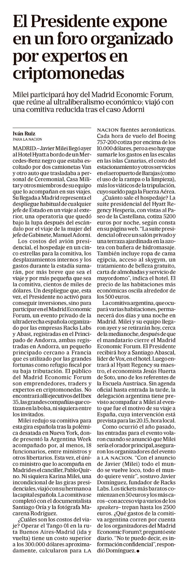 El Presidente expone en un foro organizado por expertos en criptomonedas Iván Ruiz Milei participará hoy del Madrid Economic Forum, que reúne al ultraliberalismo económico; viajó con una comitiva reducida tras el caso Adorni. Iván Ruiz PARA LA NACION MADRID.- Javier Milei llegó ayer al Hotel Hyatt a bordo de un Mercedes-Benz negro que estaba escoltado por dos camionetas Van y otro auto que trasladaba a personal de Ceremonial, Casa Militar y otros miembros de su equipo que lo acompañan en sus viajes. Su llegada a Madrid representa el despliegue habitual de cualquier jefe de Estado en un viaje al exterior, una operatoria que quedó bajo la lupa después del escándalo por el viaje de la mujer del jefe de Gabinete, Manuel Adorni. Los costos del avión presidencial, el hospedaje en un cinco estrellas para la comitiva, los desplazamientos internos y los gastos durante la estadía sumarán, por más breve que sea el viaje y por más pequeña que sea la comitiva, cientos de miles de dólares. Un despliegue que, esta vez, el Presidente no activó para conseguir inversiones, sino para participar en el Madrid Economic Forum, un evento privado de la ultraderecha española organizado por las empresas Racks Labs y Abast, registradas en el Principado de Andorra, ambas registradas en Andorra, un pequeño principado cercano a Francia que es utilizado por las grandes fortunas como refugio fiscal por su baja tributación. El público del Madrid Economic Forum son emprendedores, traders y expertos en criptomonedas. No encontrará allí ejecutivos del Ibex 35, las grandes compañías que cotizan en la bolsa, ni siquiera entre los invitados. Milei redujo su comitiva para esta gira española tras la polémica desatada en Nueva York, donde presentó la Argentina Week, acompañado por, al menos, 18 funcionarios, entre ministros y otros libertarios. Esta vez, el único ministro que lo acompaña en Madrid es el canciller, Pablo Quirno. Nisiquiera Karina Milei, una incondicional de las giras presidenciales, viajó con su hermano a la capital española. La comitiva se completó con el documentalista Santiago Oría y la fotógrafa Macarena Rodríguez. ¿Cuáles son los costos del viaje? Operar el Tango 01 en la ruta Buenos Aires-Madrid (ida y vuelta) tiene un costo superior a los 300.000 dólares aproximadamente, calcularon para LA NACION fuentes aeronáuticas. Cada hora de vuelo del Boeing 757-200 cotiza por encima de los 10.000 dólares, pero a eso hay que sumarle los gastos en las escalas en las islas Canarias, el costo de estacionamiento y otros servicios en el aeropuerto de Barajas (como el uso de la rampa o la limpieza), más los viáticos de la tripulación, cuyo sueldo paga la Fuerza Aérea. ¿Cuánto sale el hospedaje? La suite presidencial del Hyatt Regency Hesperia, con vistas al Paseo de la Castellana, cotiza 5200 euros por noche, según consta en su página web. "La suite presidencial ofrece un salón privado y una terraza ajardinada en la azotea con bañera de hidromasaje. También incluye ropa de cama egipcia, acceso al skygym, un tratamiento de belleza gratuito, carta de almohadas y servicio de mayordomo", indica el hotel. El precio de las habitaciones más económicas oscila alrededor de los 500 euros. La comitiva argentina, que ocupará varias habitaciones, permanecerá dos días y una noche en Madrid. Milei y su equipo llegaron ayer y se retirarán hoy, cerca de la medianoche, después de que el mandatario cierre el Madrid Economic Forum. El Presidente recibirá hoy a Santiago Abascal, líder de Vox, en el hotel. Luego entrará al Hyatt Regency su maestro, el economista Jesús Huerta de Soto, uno de los referentes de la Escuela Austríaca. Sin agenda oficial hasta entrada la tarde, la delegación argentina tiene previsto acompañar a Milei al evento que fue el motivo de su viaje a España, cuya intervención está prevista para las 20.15, hora local. Como ocurrió el año pasado, las entradas para el evento volaron cuando se anunció que Milei sería el orador principal, aseguraron los organizadores del evento a LA NACION. "Con el anuncio de Javier (Milei) todo el mundo se vuelve loco, todo el mundo quiere venir", sostuvo Javier Domínguez, fundador de Racks Labs. Los tickets más baratos comienzan en 50 euros y los más caros -con acceso vip a varios de los speakers- trepan hasta los 2500 euros. ¿Qué gastos de la comitiva argentina corren por cuenta de los organizadores del Madrid Economic Forum?, preguntó este diario. "No te puedo decir, es información confidencial", respondió Domínguez. Menciones: cpol1 cnot