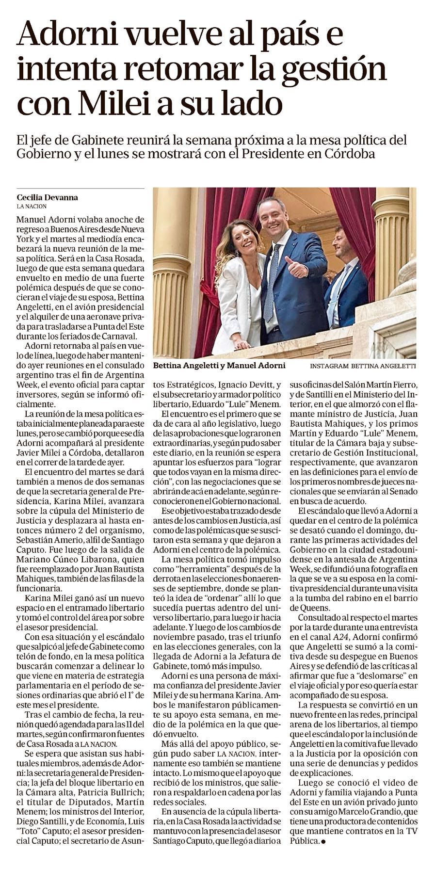 Adorni vuelve al país e intenta retomar la gestión con Milei a su lado Cecilia Devanna El jefe de Gabinete reunirá la semana próxima a la mesa política del Gobierno y el lunes se mostrará con el Presidente en Córdoba Manuel Adorni volaba anoche de regreso a Buenos Aires desde Nueva York y el martes al mediodía encabezará la nueva reunión de la mesa política. Será en la Casa Rosada, luego de que esta semana quedara envuelto en medio de una fuerte polémica después de que se conocieran el viaje de su esposa, Bettina Angeletti, en el avión presidencial y el alquiler de una aeronave privada para trasladarse a Punta del Este durante los feriados de Carnaval. Adorni retornaba al país en vuelo de línea, luego de haber mantenido ayer reuniones en el consulado argentino tras el fin de Argentina Week, el evento oficial para captar inversores, según se informó oficialmente. La reunión de la mesa política estaba inicialmente planeada para este lunes, pero se cambió porque ese día Adorni acompañará al presidente Javier Milei a Córdoba, detallaron en el correr de la tarde de ayer. El encuentro del martes se dará también a menos de dos semanas de que la secretaria general de Presidencia, Karina Milei, avanzara sobre la cúpula del Ministerio de Justicia y desplazara al hasta entonces número 2 del organismo, Sebastián Amerio, alfil de Santiago Caputo. Fue luego de la salida de Mariano Cúneo Libarona, quien fue reemplazado por Juan Bautista Mahiques, también de las filas del funcionaria. Karina Milei ganó así un nuevo espacio en el entramado libertario y tomó el control del área por sobre el asesor presidencial. Con esa situación y el escándalo que salpicó al jefe de Gabinete como telón de fondo, en la mesa política buscarán comenzar a delinear lo que viene en materia de estrategia parlamentaria en el período de sesiones ordinarias que abrió el 1 de este mes el presidente. Tras el cambio de fecha, la reunión quedó agendada para las 11 del martes, según confirmaron fuentes de Casa Rosada a LA NACION. Se espera que asistan sus habituales miembros, además de Adorni: la secretaria general de Presidencia; la jefa del bloque libertario en la Cámara alta, Patricia Bullrich; el titular de Diputados, Martín Menem; los ministros del Interior, Diego Santilli, y de Economía, Luis "Toto" Caputo; el asesor presidencial Caputo; el secretario de Asuntos Estratégicos, Ignacio Devitt, y el subsecretario y armador político libertario, Eduardo "Lule" Menem. El encuentro es el primero que se da de cara al año legislativo, luego de las aprobaciones que lograron extraordinarias, y según pudo saber este diario, en la reunión se espera apuntar los esfuerzos para "lograr que todos vayan en la misma dirección", con las negociaciones que se abrirán de acá en adelante, según reconocieron en el Gobierno nacional. Ese objetivo estaba trazado desde antes de los cambios en Justicia, así como de las polémicas que se suscitaron esta semana y que dejaron a Adorni en el centro de la polémica. La mesa política tomó impulso como "herramienta" después de la derrota en las elecciones bonaerenses de septiembre, donde se planteó la idea de "ordenar" allí lo que sucedía puertas adentro del universo libertario, para luego ir hacia adelante. Y luego de los cambios de noviembre pasado, tras el triunfo en las elecciones generales, con la llegada de Adorni a la Jefatura de Gabinete, tomó más impulso. Adorni es una persona de máxima confianza del presidente Javier Milei y de su hermana Karina. Ambos le manifestaron públicamente su apoyo esta semana, en medio de la polémica en la que quedó envuelto. Más allá del apoyo público, según pudo saber LA NACION, internamente eso también se mantiene intacto. Lo mismo que el apoyo que recibió de los ministros, que salieron a respaldarlo en cadena por las redes sociales. En ausencia de la cúpula libertaria, en la Casa Rosada la actividad se mantuvo con la presencia del asesor Santiago Caputo, que llegó a diario a sus oficinas del Salón Martín Fierro, y de Santilli en el Ministerio del Interior, en el que almorzó con el flamante ministro de Justicia, Juan Bautista Mahiques, y los primos Martín y Eduardo "Lule" Menem, titular de la Cámara baja y subsecretario de Gestión Institucional, respectivamente, que avanzaron en las definiciones para el envío de los primeros nombres de jueces nacionales que se enviarán al Senado en busca de acuerdo. El escándalo que llevó a Adorni a quedar en el centro de la polémica se desató cuando el domingo, durante las primeras actividades del Gobierno en la ciudad estadounidense en la antesala de Argentina Week, se difundió una fotografía de la que se ve a su esposa en la comitiva presidencial durante una visita a la tumba del rabino en el barrio de Queens. Consultado al respecto el martes por la tarde durante una entrevista en el canal A24, Adorni confirmó que Angeletti se sumó a la comitiva desde su despegue en Buenos Aires y se defendió de las críticas al firmar que fue a "deslomarse" en el viaje oficial y por eso quería estar acompañado de su esposa. La respuesta se convirtió en un nuevo frente en las redes, principal arena de los libertarios, al tiempo que el escándalo por la inclusión de Angeletti en la comitiva fue llevado a la Justicia por la oposición con una serie de denuncias y pedidos de explicaciones. Luego se conoció el video de Adorni y familia viajando a Punta del Este en un avión privado junto con su amigo Marcelo Grandio, que tiene una productora de contenidos que mantiene contratos en la TV Pública. Menciones: cpol1