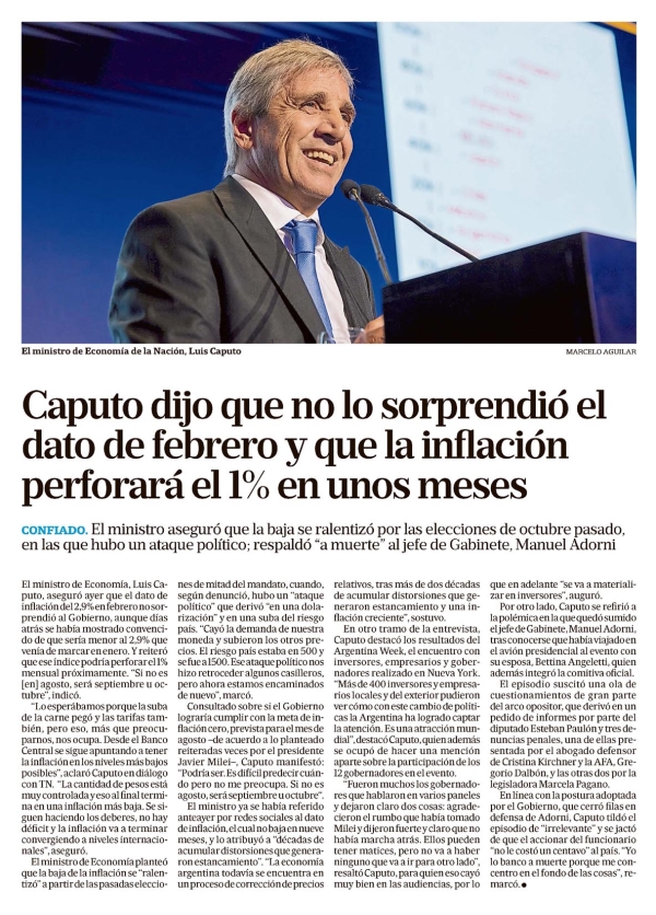 Caputo dijo que no lo sorprendió el dato de febrero y que la inflación perforará el 1% en unos meses MARCELO AGUILAR CONFIADO. El ministro aseguró que la baja se ralentizó por las elecciones de octubre pasado, en las que hubo un ataque político; respaldó "a muerte" al jefe de Gabinete, Manuel Adorni. El ministro de Economía, Luis Caputo, aseguró ayer que el dato de inflación del 2,9% en febrero nosorprendió al Gobierno, aunque días atrás se había mostrado convencido de que sería menor al 2,9% que venía de marcar en enero. Y reiteró que ese índice podría perforar el 1% mensual próximamente. "Si no es [en] agosto, será septiembre u octubre", indicó. "Lo esperábamos porque la suba de la carne pegó y las tarifas también, pero eso, más que preocuparnos, nos ocupa. Desde el Banco Central se sigue apuntando a tener la inflación en los niveles más bajos posibles", aclaró Caputo en diálogo con TN. "La cantidad de pesos está muy controlada y eso al final termina en una inflación más baja. Se siguen haciendo los deberes, no hay déficit y la inflación va a terminar convergiendo a niveles internacionales", aseguró. El ministro de Economía planteó que la baja de la inflación se "ralentizó" a partir de las pasadas elecciones de mitad del mandato, cuando, según denunció, hubo un "ataque político" que derivó "en una dolarización" y en una suba del riesgo país. "Cayó la demanda de nuestra moneda y subieron los otros precios. El riesgo país estaba en 500 y se fue a 1500. Ese ataque político nos hizo retroceder algunos casilleros, pero ahora estamos encaminados de nuevo", marcó. Consultado sobre si el Gobierno lograría cumplir con la meta de inflación cero, prevista para el mes de agosto -de acuerdo a lo planteado reiteradas veces por el presidente Javier Milei-, Caputo manifestó: "Podría ser. Es difícil predecir cuándo pero no me preocupa. Si no es en agosto, será septiembre u octubre". El ministro ya se había referido anteayer por redes sociales al dato de inflación, el cual no baja en nueve meses, y lo atribuyó a "décadas de acumular distorsiones que generaron estancamiento". "La economía argentina todavía se encuentra en un proceso de corrección de precios relativos, tras más de dos décadas de acumular distorsiones que generaron estancamiento y una inflación creciente", sostuvo. En otro tramo de la entrevista, Caputo destacó los resultados del Argentina Week, el encuentro con inversores, empresarios y gobernadores realizado en Nueva York. "Más de 400 inversores y empresarios locales y del exterior pudieron ver cómo con este cambio de políticas la Argentina ha logrado captar la atención. Es una atracción mundial", destacó Caputo, quien además se ocupó de hacer una mención aparte sobre la participación de los 12 gobernadores en el evento. "Fueron muchos los gobernadores que hablaron en varios paneles y dejaron claro dos cosas: agradecieron el rumbo que había tomado Milei y dijeron fuerte y claro que no había marcha atrás. Ellos pueden tener matices, pero no va a haber ninguno que va a ir para otro lado", resaltó Caputo, para quien eso cayó muy bien en las audiencias, por lo que en adelante "se va a materializar en inversores", auguró. Por otro lado, Caputo se refirió a la polémica en la que quedó sumido el jefe de Gabinete, Manuel Adorni, tras conocerse que había viajado en el avión presidencial al evento con su esposa, Bettina Angeletti, quien además integró la comitiva oficial. El episodio suscitó una ola de cuestionamientos de gran parte del arco opositor, que derivó en un pedido de informes por parte del diputado Esteban Paulón y tres denuncias penales, una de ellas presentada por el abogado defensor de Cristina Kirchner y la AFA, Gregorio Dalbón, y las otras dos por la legisladora Marcela Pagano. En línea con la postura adoptada por el Gobierno, que cerró filas en defensa de Adorni, Caputo tildó el episodio de "irrelevante" y se jactó de que el accionar del funcionario "no le costó un centavo" al país. "Yo lo banco a muerte porque me concentro en el fondo de las cosas", remarcó. Menciones: Ceco1 cfinanE ejesapp cnot