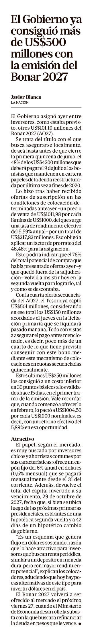 El Gobierno ya consiguió más de US$500 millones con la emisión del Bonar 2027 Javier Blanco El Gobierno asignó ayer entre inversores, como estaba previsto, otros US$101,10 millones del Bonar 2027 (AO27). Se trata del título con el que busca asegurarse localmente, de acá hasta antes de que cierre la primera quincena de junio, el 48% de los US$4200 millones que deberá pagar el 9 de julio a los bonistas que mantienen en cartera papeles de la deuda reestructurada por última vez a fines de 2020. Lo hizo tras haber recibido ofertas de suscripción en las condiciones de colocación determinadas anteayer -un precio de venta de US$1011,98 por cada lámina de US$1000, del que surge una tasa de rendimiento efectivo del 5,59% anual- por un total de US$217,82 millones. Eso obligó a aplicar un factor de prorrateo del 46,46% para la asignación. Esto podría indicar que el 76% del total potencial de compra que había presentado ofertas ayer -y que quedó fuera de la adjudicación- volvió a insistir hoy en la segunda vuelta para lograrlo, tal y como se descontaba. Con la cuarta oferta secuenciada del AO27, el Tesoro ya captó US$501 millones, considerando en ese total los US$150 millones acordados el jueves en la licitación primaria que se liquidará pasado mañana. Todo con vistas a asegurar el pago antes mencionado, es decir, poco más de un cuarto de lo que tiene previsto conseguir con este bono mediante este mecanismo de colocaciones en cuotas secuenciadas quincenalmente. Estos últimos US$250 millones los consiguió a un costo inferior en 30 puntos básicos a los validados hace 15 días, en el primer tramo de la emisión. Vale recordar que, cuando comenzó a ofrecerlo en febrero, lo pactó a US$1004,50 por cada US$1000 nominales, es decir, con un retorno efectivo del 5,89% en esa oportunidad. Atractivo El papel, según el mercado, es muy buscado por inversores chicos y ahorristas comunes por sus características: ofrece un cupón fijo del 6% anual en dólares (0,5% mensual) que se pagará mensualmente desde el 31 de corriente. Además, devuelve el total del capital invertido a su vencimiento, 29 de octubre de 2027, fecha que, si bien se ubica luego de las próximas primarias presidenciales, está antes de una hipotética segunda vuelta y a 42 días de un hipotético cambio de gobierno. "Es un esquema que genera flujo en dólares sostenido, razón por lo que lo hace atractivo para inversores que buscan renta periódica, similar a un depósito en moneda dura, pero con mayor rendimiento potencial", explican los colocadores, aduciendo que hoy hay pocas alternativas de este tipo para invertir dólares en el país. El Bonar 2027 volverá a ser ofrecido al mercado el próximo viernes 27, cuando el Ministerio de Economía desarrolle la subasta con la que buscará refinanciar la deuda en pesos que le vence. Menciones: Ceco1 cfinanE