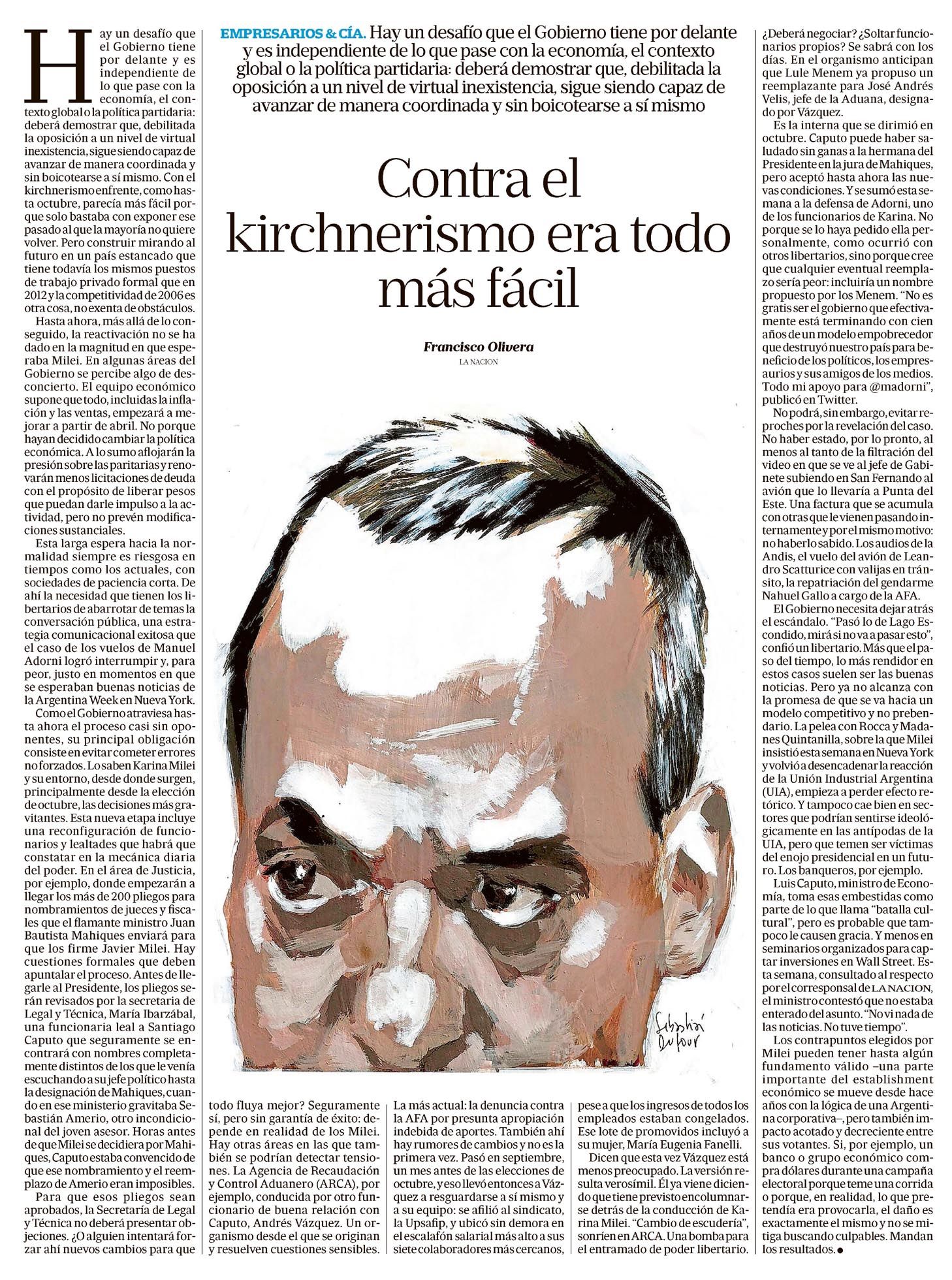 Contra el kirchnerismo era todo más fácil Francisco Olivera EMPRESARIOS & CÍA. Hay un desafío que el Gobierno tiene por delante y es independiente de lo que pase con la economía, el contexto global o la política partidaria: deberá demostrar que, debilitada la oposición a un nivel de virtual inexistencia, sigue siendo capaz de avanzar de manera coordinada y sin boicotearse a sí mismo. Con el kirchnerismo enfrente, como hasta octubre, parecía más fácil porque solo bastaba con exponer el pasado al que la mayoría no quiere volver. Pero construir mirando al futuro en un país estancado que tiene todavía los mismos puestos de trabajo privado formal que en 2012 y la competitividad de 2006 es otra cosa, no exenta de obstáculos. Hasta ahora, más allá de lo conseguido, la reactivación no se ha dado en la magnitud en que esperaba Milei. En algunas áreas del Gobierno se percibe algo de desconcierto. El equipo económico supone que todo, incluidas la inflación y las ventas, empezará a mejorar a partir de abril. No porque hayan decidido cambiar la política económica. A lo sumo aflojarán la presión sobre las paritarias y renovarán menos licitaciones de deuda con el propósito de liberar pesos que puedan darle impulso a la actividad, pero no prevén modificaciones sustanciales. Esta larga espera hacia la normalidad siempre es riesgosa en tiempos como los actuales, con sociedades de paciencia corta. De ahí la necesidad que tienen los libertarios de abarrotar de temas la conversación pública, una estrategia comunicacional exitosa que, el caso de los vuelos de Manuel Adorni, logró interrumpir y, por peor, justo en momentos en que se esperaban buenas noticias de la Argentina Week en Nueva York. Como el Gobierno atraviesa hasta ahora el proceso casi sin oponentes, su principal obligación consiste en evitar cometer errores forzados. Lo saben Karina Milei y su entorno, desde donde surgen, principalmente desde la elección de octubre, las decisiones más gravitantes. Esta nueva etapa incluye una reconfiguración de funcionarios y lealtades que habrá que constatar en la mecánica diaria del poder. En el área de Justicia, por ejemplo, donde empezarán a llegar los más de 200 pliegos para nombramientos de jueces y fiscales que el flamante ministro Juan Bautista Mahiques enviará para que los firme Javier Milei. Hay cuestiones formales que debe puntalar el proceso. Antes de llegarle al Presidente, los pliegos serán revisados por la secretaría de Legal y Técnica, María Ibarzábal, una funcionaria leal a Santiago Caputo que seguramente se encontrará con nombres completamente distintos de los que le venía escuchando a su jefe político hasta la designación de Mahiques, cuando en ese ministerio gravitaba Sebastián Amerio, otro incondicional del joven asesor. Horas antes de que Milei se decidiera por Mahiques, Caputo estaba convencido de que ese nombramiento y el reemplazo de Amerio eran imposibles. Para que esos pliegos sean aprobados, la Secretaría de Legal y Técnica no deberá presentar objeciones. ¿O alguien intentará forzar ahí nuevos cambios para que todo fluya mejor? Seguramente sí, pero sin garantía de éxito: depende en realidad de los Milei. Hay otras áreas en las que también se podrían detectar tensiones. La Agencia de Recaudación y Control Aduanero (ARCA), por ejemplo, conducida por otro funcionario de buena relación con Caputo, Andrés Vázquez. Un organismo desde el que se origina y resuelven cuestiones sensibles. La más actual: la denuncia contra la AFA por presunta apropiación indebida de aportes. También ahí hay rumores de cambios y no es la primera vez. Pasó en septiembre, un mes antes de las elecciones de octubre, y eso llevó entonces a Vázquez a resguardarse a sí mismo y a su equipo: se afilió al sindicato, la Upsafip, y ubicó sin demora en el escalafón salarial más alto a sus siete colaboradores más cercanos, pese a que los ingresos de todos los empleados estaban congelados. Ese lote de promovidos incluyó a su mujer, María Eugenia Fanelli. Dicen que esta vez Vázquez está menos preocupado. La versión resulta verosímil. Él ya viene diciendo que tiene previsto encolumnarse detrás de la conducción de Karina Milei. “Cambio de escudería”, sonríen en ARCA. Una bomba para el entramado de poder libertario. ¿Deberá negociar? ¿Soltar funcionarios propios? Se sabrá con los días. En el organismo anticipan que Lule Menem ya propuso un reemplazante para José Andrés Velis, jefe de la Aduana, designado por Vázquez. Es la interna que se dirimió en octubre. Caputo puede haber saludado sin ganas a la hermana del Presidente en la jura de Mahiques, pero aceptó hasta ahora las nuevas condiciones. Y se sumó esta semana a la defensa de Adorni, uno de los funcionarios de Karina. No porque se lo haya pedido ella personalmente, como otros libertarios, sino porque cree que cualquier eventual reemplazo sería peor: incluiría un nombre propuesto por los Menem. “No es gratis ser el gobierno que efectivamente está terminando con cien años de un modelo empobrecedor que destruyó nuestro país para beneficiar a los políticos, los empresarios y sus amigos de los medios. Todo mi apoyo para @madorni”, publicó en Twitter. No podrá, sin embargo, evitar reproches por la revelación del caso. No haber estado, por lo pronto, al menos al tanto de la filtración del video en que se ve al jefe de Gabinete subiendo en San Fernando a un avión que lo llevaría a Punta del Este. Una factura que se acumula con otras que le vienen pasando internamente y por el mismo motivo: no haberlo sabido. Los audios de la Andis, el vuelo del avión de Leandro Scatturice con valijas en tránsito, la repatriación del gendarme Nahuel Gallo a cargo de la AFA. El Gobierno necesita dejar atrás el escándalo. “Pasó lo de Lago Escondido, mirá si no va a pasar esto”, confió un libertario. Más que el paso del tiempo, lo más rendidor en estos casos suelen ser l