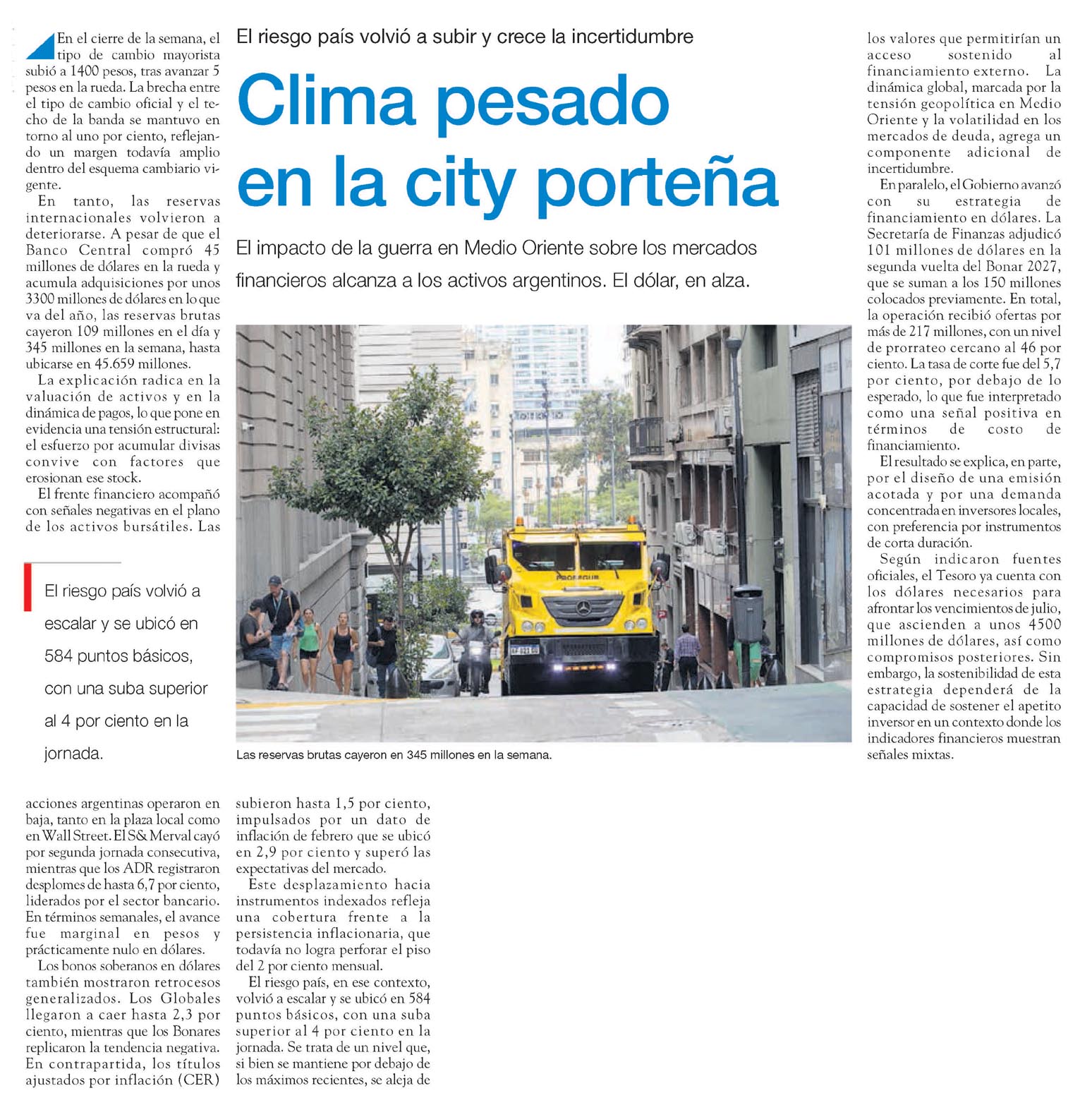 Clima pesado en la city porteña El riesgo país volvió a subir y crece la incertidumbre. El impacto de la guerra en Medio Oriente sobre los mercados financieros alcanza a los activos argentinos. El dólar, en alza. En el cierre de la semana, el tipo de cambio mayorista subió a 1400 pesos, tras avanzar 5 pesos en la rueda. La brecha entre el tipo de cambio oficial y el techo de la banda se mantuvo en torno al uno por ciento, reflejando un margen todavía amplio dentro del esquema cambiario vigente. En tanto, las reservas internacionales volvieron a deteriorarse. A pesar de que el Banco Central compró 45 millones de dólares en la rueda y acumula adquisiciones por unos 3300 millones de dólares en lo que va del año, las reservas brutas cayeron 109 millones en el día y 345 millones en la semana, hasta ubicarse en 45.659 millones. La explicación radica en la valuación de activos y en la dinámica de pagos, lo que pone en evidencia una tensión estructural: el esfuerzo por acumular divisas convive con factores que erosionan ese stock. El frente financiero acompañó con señales negativas en el plano de los activos bursátiles. El riesgo país volvió a escalar y se ubicó en 584 puntos básicos, con una suba superior al 4 por ciento en la jornada. Las acciones argentinas operaron a la baja, tanto en la plaza local como en Wall Street. El S&P Merval cayó por segunda jornada consecutiva, mientras que los ADR registraron desplomes de hasta 6,7 por ciento, liderados por el sector bancario. En términos semanales, el avance fue marginal en pesos y prácticamente nulo en dólares. Los bonos soberanos en dólares también mostraron retrocesos generalizados. Los Globales llegaron a caer hasta 2,3 por ciento, mientras que los Bonar replicaron la tendencia negativa. En contrapartida, los títulos ajustados por inflación (CER) subieron hasta 1,5 por ciento, impulsados por un dato de inflación de febrero que se ubicó en 2,9 por ciento y superó las expectativas del mercado. Este desplazamiento hacia instrumentos indexados refleja una cobertura frente a la persistencia inflacionaria, que todavía no logra perforar el piso del 2 por ciento mensual. El riesgo país, en ese contexto, volvió a escalar y se ubicó en 584 puntos básicos, con una suba superior al 4 por ciento en la jornada. Se trata de un nivel que, si bien se mantiene por debajo de los máximos recientes, se aleja de los valores que permitirían un acceso sostenido al financiamiento externo. La dinámica global, marcada por la tensión geopolítica en Medio Oriente y la volatilidad en los mercados de deuda, agrega un componente adicional de incertidumbre. En paralelo, el Gobierno avanzó con su estrategia de financiamiento en dólares. La Secretaría de Finanzas adjudicó 101 millones de dólares en la segunda vuelta del Bonar 2027, que se suman a los 150 millones colocados previamente. En total, la operación recibió ofertas por más de 217 millones, con un nivel de prorrateo cercano al 46 por ciento. La tasa de corte fue del 5,7 por ciento, por debajo de lo esperado, lo que fue interpretado como una señal positiva en términos de costo de financiamiento. El resultado se explica, en parte, por el diseño de una emisión acotada y por una demanda concentrada en inversores locales, con preferencia por instrumentos de corta duración. Según indicaron fuentes oficiales, el Tesoro ya cuenta con los dólares necesarios para afrontar los vencimientos de julio, que ascienden a unos 4500 millones de dólares, así como compromisos posteriores. Sin embargo, la sostenibilidad de esta estrategia dependerá de la capacidad de sostener el apetito inversor en un contexto donde los indicadores financieros muestran señales mixtas. Las reservas brutas cayeron en 345 millones en la semana. Menciones: Ceco1 cfinanE
