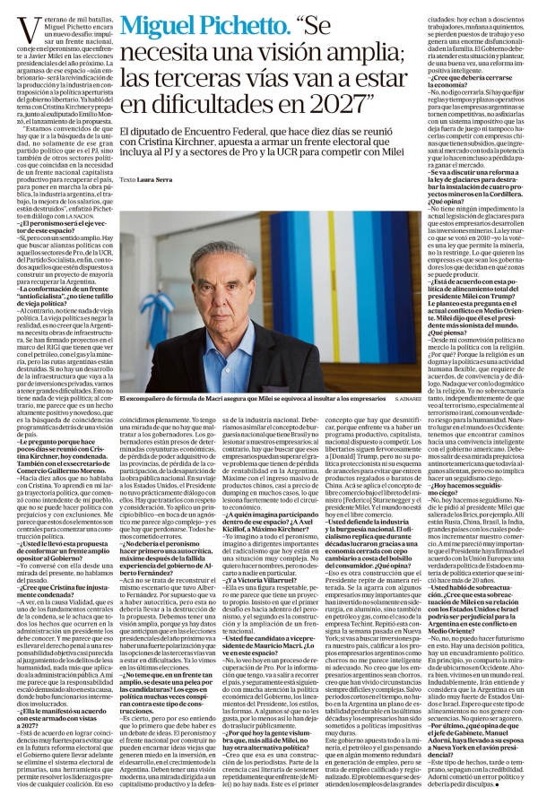 Miguel Pichetto: "Se necesita una visión amplia; las terceras vías van a estar en dificultades en 2027" Laura Serra El diputado de Encuentro Federal, que hace diez días se reunió con Cristina Kirchner, apuesta a armar un frente electoral que incluya al PJ y a sectores de Pro y la UCR para competir con Milei Texto Laura Serra El excompañero de fórmula de Macri asegura que Milei se equivoca al insultar a los empresarios Miguel Pichetto encara un nuevo desafío: impulsar un frente nacional, con eje en el peronismo, que enfrente a Javier Milei en las elecciones presidenciales del año próximo. La largamasa de ese espacio –aún embrionario– será la reivindicación de la producción y la industria en contraposición a la política aperturista del gobierno libertario. Yahabló de este tema con Cristina Kirchner y prepara, junto al exdiputado Emilio Monzó, el lanzamiento de la propuesta. “Estamos convencidos de que hay que ir a la búsqueda de la unidad, no solamente de ese gran partido político que es el PJ, sino también de otros sectores políticos que coincidan en la necesidad de un frente nacional capitalista productivo para recuperar el país, para poner en marcha la obra pública, la industria argentina, el trabajo, la mejora de los salarios, que están destruidos”, enfatizó Pichetto en diálogo CON LA NACION. —¿El peronismo será el eje vector de este espacio? —Sí, pero con un sentido amplio. Hay que buscar alianzas políticas con aquellos sectores de Pro, de la UCR, del Partido Socialista, en fin, con todos aquellos que estén dispuestos a construir un proyecto de mayoría para recuperar la Argentina. —La conformación de un frente “antioficialista”, ¿no tiene tufo a vieja política? —Al contrario, no tiene nada de vieja política. La vieja política es negar la realidad, es no creer que la Argentina necesita obras de infraestructura. Se han firmado proyectos en el marco del RIGI que tienen que ver con el petróleo, con el gas y la minería, pero las rutas argentinas están destruidas. Si no hay un desarrollo de la infraestructura que vaya a la par de inversiones privadas, vamos a tener grandes dificultades. Esto no tiene nada de vieja política; al contrario, me parece que es un hecho altamente positivo y novedoso, que es la búsqueda de coincidencias programáticas detrás de una visión de país. —Le pregunto porque hace pocos días se reunió con Cristina Kirchner, hoy condenada. También con el exsecretario de Comercio Guillermo Moreno. —Hacía diez años que no hablaba con Cristina. Yo aprendí en mi larga trayectoria política, que comenzó como intendente de mi pueblo, que no se puede hacer política con prejuicios y con exclusiones. Me parece que estos dos elementos son centrales para comenzar una construcción política. —¿Usted le llevó esta propuesta de conformar un frenteamplista opositor al Gobierno? —Yo conversé con ella desde una mirada del presente, no hablamos del pasado. —¿Cree que Cristina fue injustamente condenada? —A ver, en la causa Vialidad, que es uno de los fundamentos centrales de la condena, se le achaca que todos los hechos que ocurren en la administración un presidente los debe conocer. Y me parece que es solo llevar el derecho penal a una responsabilidad objetiva casi parecida al juzgamiento de los delitos de lesa humanidad, nada más que aplicado a la administración pública. A mí me parece que la responsabilidad escaló demasiado alto en esta causa, donde hubo funcionarios intermedios involucrados. —¿Ella le manifestó su acuerdo con este armado con vistas a 2027? —Está de acuerdo en lograr coincidencias muy fuertes para evitar que en la futura reforma electoral que el Gobierno quiere llevar adelante se elimine el sistema electoral de primarias, una herramienta que permite resolver los liderazgos previos de cualquier coalición. En eso coincidimos plenamente. Yo tengo una mirada de que no hay que maltratar a los gobernadores. Los gobernadores están presos de determinadas coyunturas económicas, de pérdida de poder adquisitivo de las provincias, de pérdida de la coparticipación, de la desaparición de la obra pública nacional. En su viaje a los Estados Unidos, el Presidente no tuvo prácticamente diálogo con ellos. Hay que tratarlos con respeto y consideración. Yo aplico un principio bíblico –en boca de un agnóstico– me parece algo complejo– y es que hay que perdonarse. Todos hemos cometido errores. —¿No debería el peronismo hacer primero una autocrítica, máxime después de la fallida experiencia del gobierno de Alberto Fernández? —Acá no se trata de reconstruir el mismo escenario que tuvo Alberto Fernández. Por supuesto que va a haber autocrítica, pero esta no debería llevar a la destrucción de la propuesta. Debemos tener una visión amplia, porque ya hay datos que anticipan que en las elecciones presidenciales del año próximo va a haber una fuerte polarización y que las opciones de las terceras vías van a estar en dificultades. Ya lo vimos en las últimas elecciones. —¿No teme que, en un frente tan amplio, se desate una pelea por las candidaturas? Los egos en política muchas veces conspiran contra este tipo de construcciones. —Es cierto, pero por eso entiendo que lo primero que debe haber es un debate de ideas. El peronismo y el frente nacional por construir no pueden encarnar ideas viejas que generen miedo en la inversión, en el desarrollo, en el crecimiento de la Argentina. Deben tener una visión moderna, una mirada dirigida a un capitalismo productivo y la defensa de la industria nacional. El oficialismo replica que durante décadas lucraron gracias a una economía cerrada con cepos, cambio a costa del bolsillo del consumidor. ¿Qué opina? —Eso es otra construcción que el Presidente repite de manera reiterada. Se la agarra con algunos empresarios muy importantes que han invertido no solamente en siderurgia, en aluminio, sino también en petróleo 
