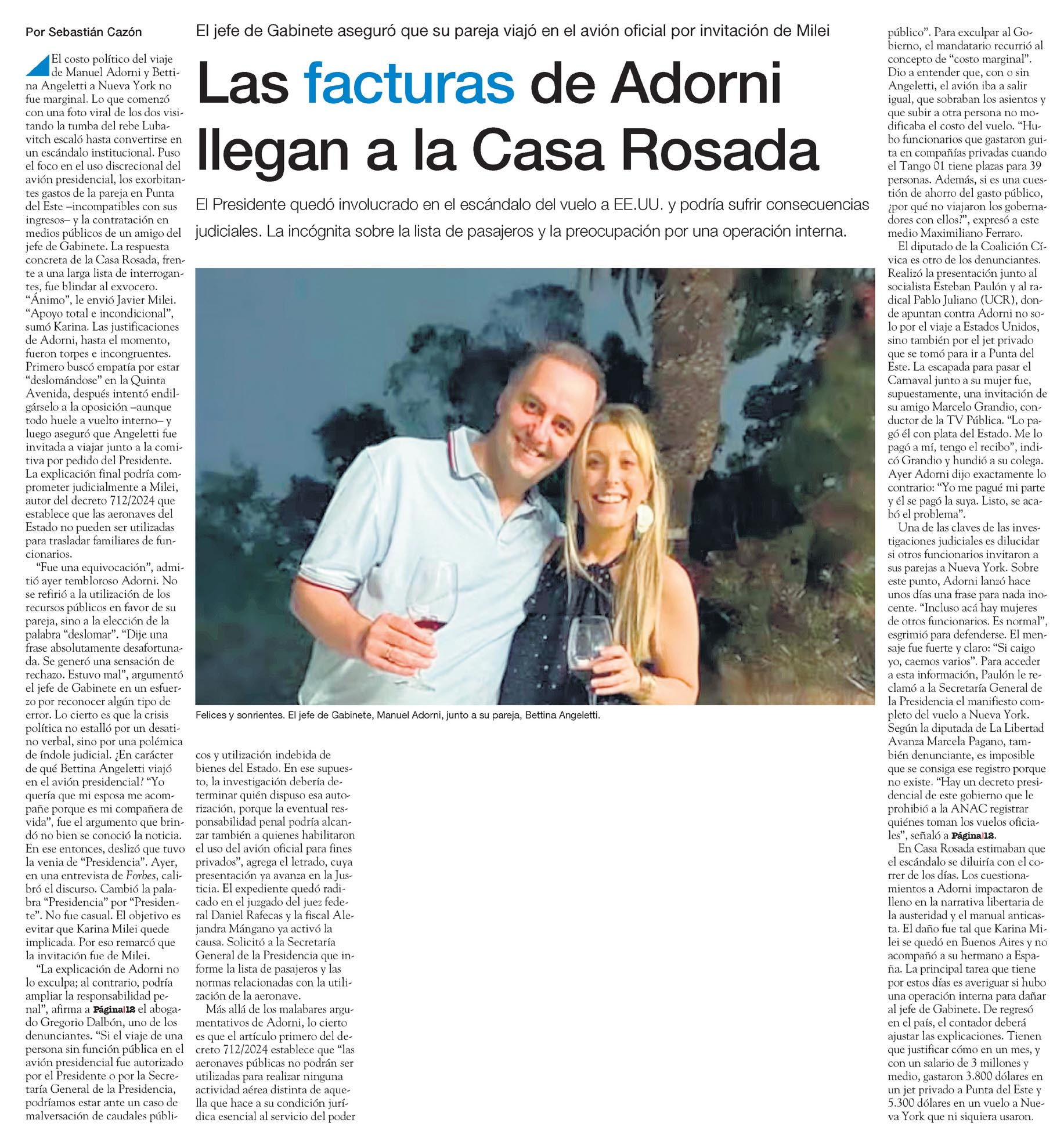 Las facturas de Adorni llegan a la Casa Rosada Sebastián Cazón El jefe de Gabinete aseguró que su pareja viajó en el avión oficial por invitación de Milei Las facturas de Adorni llegan a la Casa Rosada El costo político del viaje de Manuel Adorni y Bettina Angeletti a Nueva York no fue marginal. Lo que comenzó con una foto viral de los dos visitando la tumba del rebe Lubavitch escaló hasta convertirse en un escándalo institucional. Puso el foco en el uso discrecional del avión presidencial, los exorbitantes gastos de la pareja en Punta del Este -incompatibles con sus ingresos- y la contratación en medios públicos de un amigo del jefe de Gabinete. La respuesta concreta de la Casa Rosada, frente a una larga lista de interrogantes, fue blindar al exvocero. "Ánimo", le envió Javier Milei. "Apoyo total e incondicional", sumó Karina. Las justificaciones de Adorni, hasta el momento, fueron torpes e incongruentes. Primero buscó empatía por estar "deslomándose" en la Quinta Avenida, después intentó endilgárselo a la oposición -aunque todo huele a vuelto interno- y luego aseguró que Angeletti fue invitada a viajar junto a la comitiva por pedido del Presidente. La explicación final podría comprometer judicialmente a Milei, autor del decreto 712/2024 que establece que las aeronaves del Estado no pueden ser utilizadas para trasladar familiares de funcionarios. "Fue una equivocación", admitió ayer tembloroso Adorni. No se refirió a la utilización de los recursos públicos en favor de su pareja, sino a la elección de la palabra "deslomar". "Dije una frase absolutamente desafortunada. Se generó una sensación de rechazo. Estuvo mal", argumentó el jefe de Gabinete en un esfuerzo por reconocer algún tipo de error. Lo cierto es que la crisis política no estalló por un desatino verbal, sino por una polémica de índole judicial. ¿En carácter de qué Bettina Angeletti viajó en el avión presidencial? "Yo quería que mi esposa me acompañe porque es mi compañera de vida", fue el argumento que brindó no bien se conoció la noticia. En ese entonces, deslizó que tuvo la venia de "Presidencia". Ayer, en una entrevista de Forbes, calibró el discurso. Cambió la palabra "Presidencia" por "Presidente". No fue casual. El objetivo es evitar que Karina Milei quede implicada. Por eso remarcó que la invitación fue de Milei. "La explicación de Adorni no exculpa; al contrario, podría ampliar la responsabilidad penal", afirma a Página12 el abogado Gregorio Dalbón, uno de los denunciantes. "Si el viaje de una persona sin función pública en el avión presidencial fue autorizado por el Presidente o por la Secretaría General de la Presidencia, podríamos estar ante un caso de malversación de caudales públicos y utilización indebida de bienes del Estado. En ese supuesto, la investigación debería determinar quién dispuso esa autorización, porque la eventual responsabilidad penal podría alcanzar también a quienes habilitaron el uso del avión oficial para fines privados", agrega el letrado, cuya presentación ya avanza en la Justicia. El expediente quedó radicado en el juzgado del juez federal Daniel Rafecas y la fiscal Alejandra Mángano ya activó la causa. Solicitó a la Secretaría General de la Presidencia que informe la lista de pasajeros y las normas relacionadas con la utilización de la aeronave. Felices y sonrientes. El jefe de Gabinete, Manuel Adorni, junto a su pareja, Bettina Angeletti. Más allá de los malabares argumentativos de Adorni, lo cierto es que el artículo primero del decreto 712/2024 establece que "las aeronaves públicas no podrán ser utilizadas para realizar ninguna actividad aérea distinta de aquella que hace a su condición jurídica esencial al servicio del poder público". Para exculpar al Gobierno, el mandatario recurrió al concepto de "costo marginal". Dio a entender que, con o sin Angeletti, el avión iba a salir igual, que sobraban los asientos y que subir a otra persona no modificaba el costo del vuelo. "Hubo funcionarios que gastaron guita en compañías privadas cuando el Tango 01 tiene plazas para 39 personas. Además, si es una cuestión de ahorro del gasto público, ¿por qué no viajaron los gobernadores con ellos?", expresó a este medio Maximiliano Ferraro. El diputado de la Coalición Cívica es otro de los denunciantes. Realizó la presentación junto al socialista Esteban Paulón y al radical Pablo Juliano (UCR), donde apuntan contra Adorni no solo por el viaje a Estados Unidos, sino también por el jet privado que se tomó para ir a Punta del Este. La escapada para pasar el Carnaval junto a su mujer fue, supuestamente, una invitación de su amigo Marcelo Grandio, conductor de la TV Pública. "Lo pagó él con plata del Estado. Me lo pagó a mí, tengo el recibo", indicó Grandio y hundió a su colega. Ayer Adorni dijo exactamente lo contrario: "Yo me pagué mi parte y él se pagó la suya. Listo, se acabó el problema". Una de las claves de las investigaciones judiciales es dilucidar si otros funcionarios invitaron a sus parejas a Nueva York. Sobre este punto, Adorni lanzó hace unos días una frase para nada inocente. "Incluso acá hay mujeres de otros funcionarios. Es normal", esgrimió para defenderse. El mensaje fue fuerte y claro: "Si caigo, caemos varios". Para acceder a esta información, Paulón le reclamó a la Secretaría General de la Presidencia el manifiesto completo del vuelo a Nueva York. Según la diputada de La Libertad Avanza Marcela Pagano, también denunciante, es imposible que se consiga ese registro porque no existe. "Hay un decreto presidencial de este gobierno que le prohibió a la ANAC registrar quiénes toman los vuelos oficiales", señaló a Página12. En Casa Rosada estimaban que el escándalo se diluiría con el correr de los días. Los cuestionamientos a Adorni impactaron de lleno en la narrativa libertaria de la austeridad y el manual anticasta. El daño fue tal que Karina Milei se qued