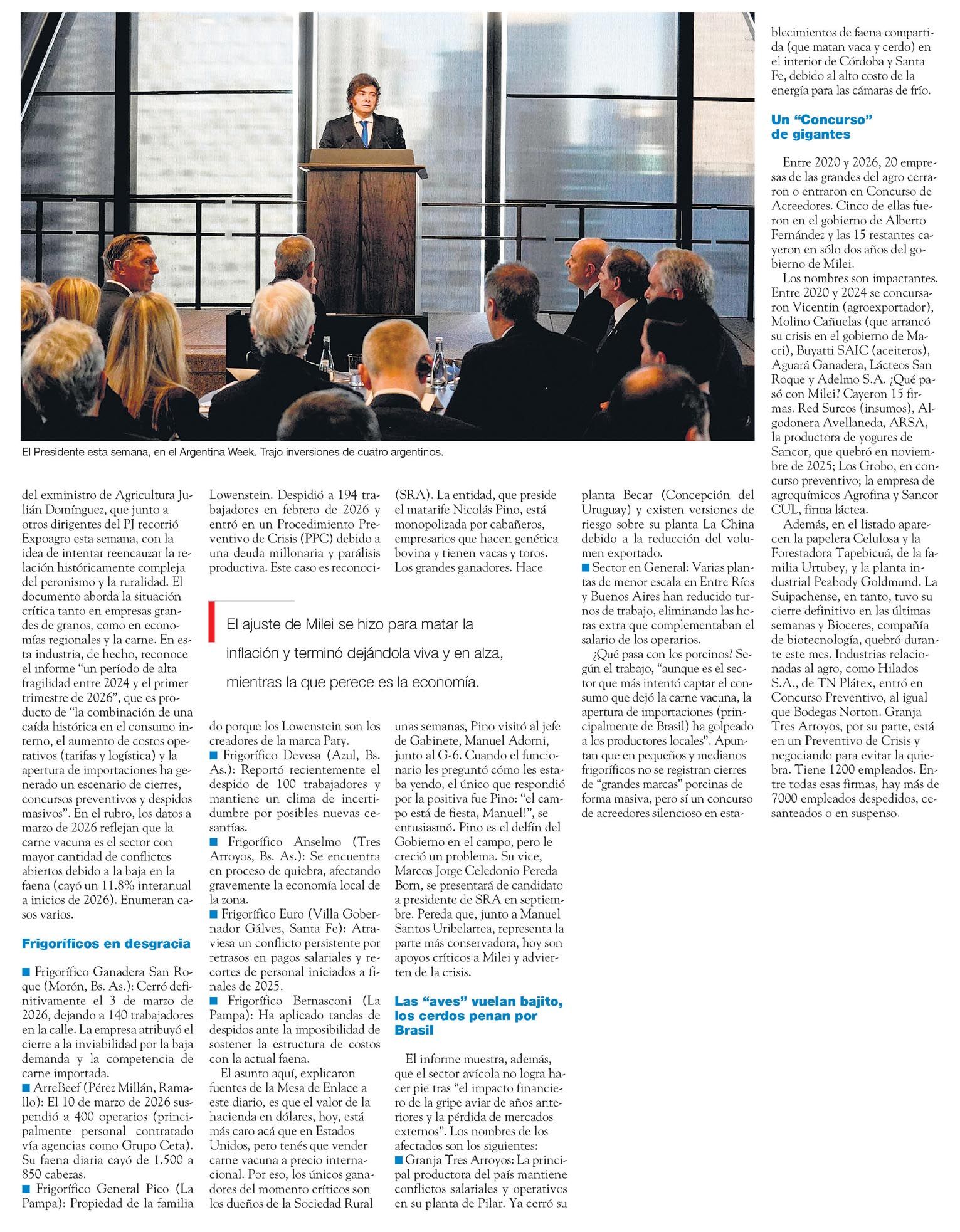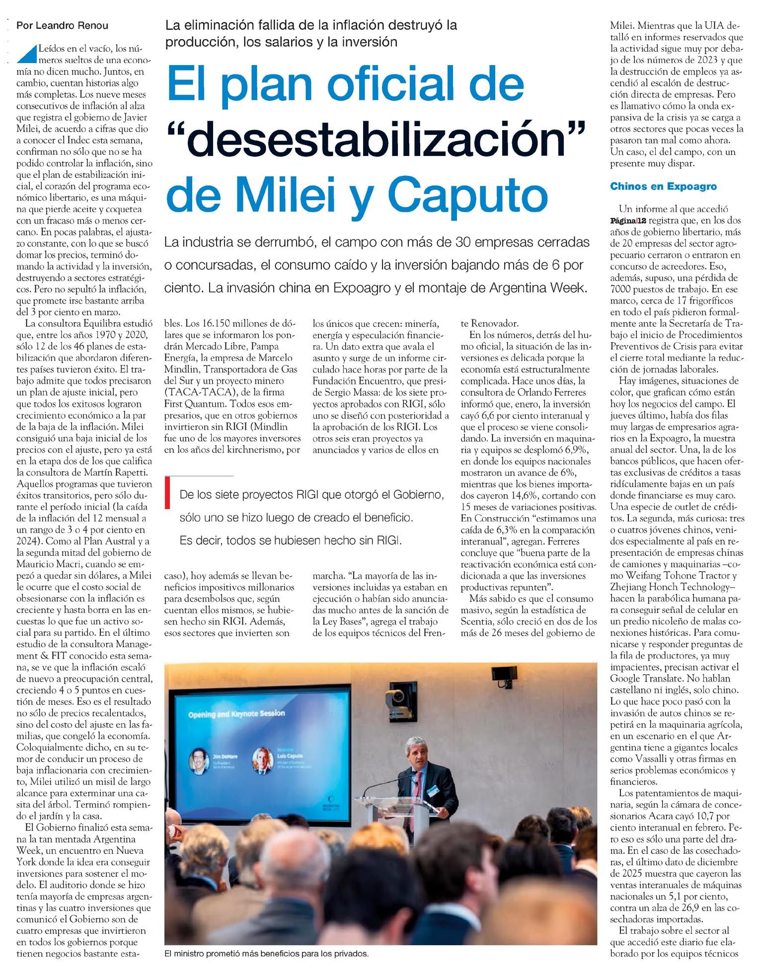 El plan oficial de "desestabilización" de Milei y Caputo Leandro Renou La eliminación fallida de la inflación destruyó la producción, los salarios y la inversión. Leídos en el vacío, los números sueltos de una economía no dicen mucho. Juntos, en cambio, cuentan historias algo más completas. Los nueve meses consecutivos de inflación al alza que registra el gobierno de Javier Milei, de acuerdo a cifras que dio a conocer el Indec esta semana, confirman no sólo que no se ha podido controlar la inflación, sino que el plan de estabilización inicial, el corazón del programa económico libertario, es una máquina que pierde aceite y coquetea con un fracaso más o menos cercano. En pocas palabras, el ajuste constante, con lo que se buscó domar los precios, terminó domando la actividad y la inversión, destruyendo a sectores estratégies. Pero no sepultó la inflación, que promete irse bastante arriba del 3 por ciento en marzo. La consultora Equilibra estudió que, entre los años 1970 y 2020, sólo 12 de los 46 planes de estabilización que abordaron diferentes países tuvieron éxito. El trabajo admite que todos precisaron un plan de ajuste inicial, pero que todos los exitosos lograron crecimiento económico a la par de la baja de la inflación. Milei consiguió una baja inicial de los precios con el ajuste, pero ya está en la etapa dos de los que califica la consultora de Martín Rapetti. Aquellos programas que tuvieron éxitos transitorios, pero sólo durante el período inicial (la caída de la inflación del 12 mensual a un rango de 3 o 4 por ciento en 2024). Como al Plan Austral y a la segunda mitad del gobierno de Mauricio Macri, cuando se empezó a quedar sin dólares, a Milei le ocurre que el costo social de obsesionarse con la inflación es creciente y hasta borra en las encuestas lo que fue un activo social para su partido. En el último estudio de la consultora Management & FIT conocido esta semana, se ve que la inflación escaló de nuevo a preocupación central, creciendo 4 o 5 puntos en cuestión de meses. Eso es el resultado no sólo de precios recalentados, sino del costo del ajuste en las familias, que congeló la economía. Coloquialmente dicho, en su temor de conducir un proceso de baja inflacionaria con crecimiento, Milei utilizó un misil de largo alcance para exterminar una casita del árbol. Terminó rompiendo el jardín y la casa. El Gobierno finalizó esta semana la tan mentada Argentina Week, un encuentro en Nueva York donde la idea era conseguir inversiones para sostener el modelo. El auditorio donde se hizo tenía mayoría de empresas argentinas y las cuatro inversiones que comunicó el Gobierno son de cuatro empresas que invirtieron en todos los gobiernos porque tienen negocios bastante esta-bles. Los 16.150 millones de dólares que se informaron los pondrán Mercado Libre, Pampa Energía, la empresa de Marcelo Mindlin, Transportadora de Gas del Sur y un proyecto minero (TACA-TACA), de la firma First Quantum. Todos esos empresarios, que en otros gobiernos invirtieron sin RIGI (Mindlin fue uno de los mayores inversores en los años del kirchnerismo, por caso), hoy además se llevan beneficios impositivos millonarios para desembolsos que, según cuentan ellos mismos, se hubiesen hecho sin RIGI. Además, esos sectores que invierten son los únicos que crecen: minería, energía y especulación financiera. Un dato extra que avala el asunto y surge de un informe circulado hace horas por parte de la Fundación Encuentro, que preside Sergio Massa: de los siete proyectos aprobados con RIGI, sólo uno se diseñó con posterioridad a la aprobación de los RIGI. Los otros seis eran proyectos anunciados y varios de ellos en marcha. "La mayoría de las inversiones incluidas ya estaban en ejecución o habían sido anunciadas mucho antes de la sanción de la Ley Bases", agrega el trabajo de los equipos técnicos del Fren-te Renovador. En los números, detrás del humo oficial, la situación de las inversiones es delicada porque la economía está estructuralmente complicada. Hace unos días, la consultora de Orlando Ferreres informó que, enero, la inversión cayó 6,6 porciento interanual y que el proceso se viene consolidando. La inversión en maquinaria y equipos se desplomó 6,9%, en donde los equipos nacionales mostraron un avance de 6%, mientras que los bienes importados cayeron 14,6%, cortando con 15 meses de variaciones positivas. En Construcción "estimamos una caída de 6,3% en la comparación interanual", agregan. Ferreres concluye que "buena parte de la reactivación económica está condicionada a que las inversiones productivas repunten". Más sabido es que el consumo masivo, según la estadística de Scentia, sólo creció en dos de los más de 26 meses del gobierno de Milei. Mientras que la UIA detalló en informes reservados que la actividad sigue muy por debajo de los números de 2023 y que la destrucción de empleos ya ascendió al escalón de destrucción directa de empresas. Pero es llamativo cómo la onda expansiva de la crisis ya se carga a otros sectores que pocas veces la pasaron tan mal como ahora. Un caso, el del campo, con un presente muy dispar. Chinos en Expoagro Un informe al que accedió Página12 registra que, en los dos años de gobierno libertario, más de 20 empresas del sector agropecuario cerraron o entraron en concurso de acreedores. Eso, además, supuso, una pérdida de 7000 puestos de trabajo. En ese marco, cerca de 17 frigoríficos en todo el país pidieron formalmente ante la Secretaría de Trabajo el inicio de Procedimientos Preventivos de Crisis para evitar el cierre total mediante la reducción de jornadas laborales. Hay imágenes, situaciones de color, que grafican cómo está hoy los negocios del campo. El jueves último, había dos filas muy largas de empresarios agrarios en la Expoagro, la muestra anual del sector. Una, la de los bancos públicos, que hacen ofertas exclusivas de créditos a tasas ridículamente b