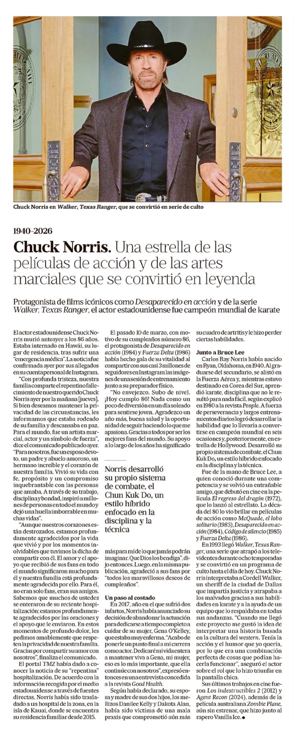 Chuck Norris. Una estrella de las películas de acción y de las artes marciales que se convirtió en leyenda 1940-2026 Chuck Norris en Walker, Texas Ranger, que se convirtió en serie de culto Protagonista de films icónicos como Desaparecido en acción y de la serie Walker, Texas Ranger, el actor estadounidense fue campeón mundial de karate El actor estadounidense Chuck Norris murió anteayer a los 86 años. Estaba internado en Hawái, su lugar de residencia, tras sufrir una "emergencia médica". La noticia fue confirmada ayer por sus allegados en su cuenta personal de Instagram. "Con profunda tristeza, nuestra familia comparte el repentino fallecimiento de nuestro querido Chuck Norris ayer por la mañana [jueves]. Si bien deseamos mantener la privacidad de las circunstancias, le informamos que estaba rodeado de su familia y descansaba en paz. Para el mundo, fue un artista marcial, actor y un símbolo de fuerza", dice el comunicado publicado ayer. "Para nosotros, fue un esposo devoto, un padre y abuelo amoroso, un hermano increíble y el corazón de nuestra familia. Vivió su vida con fe, propósito y un compromiso inquebrantable con las personas que amaba. A través de su trabajo, disciplina y bondad, inspiró a millones de personas en todo el mundo y dejó una huella imborrable en muchas vidas". "Aunque nuestros corazones están destrozados, estamos profundamente agradecidos por la vida que vivió y por los momentos inolvidables que tuvimos la dicha de compartir con él. El amor y el apoyo que recibió de sus fans en todo el mundo significaron mucho para él y nuestra familia está profundamente agradecida por ello. Para él, no eran solo fans, eran sus amigos. Sabemos que muchos de ustedes se enteraron de su reciente hospitalización; estamos profundamente agradecidos por las oraciones y el apoyo que le enviaron. En estos momentos de profundo dolor, le pedimos amablemente que respeten la privacidad de nuestra familia. Gracias por compartir su amor con nosotros", finaliza el comunicado. El portal TMZ había dado a conocer la noticia de su "repentina" hospitalización. De acuerdo con la información recogida por el medio estadounidense a través de fuentes directas, Norris había sido trasladado a un hospital de la zona, en la isla de Kauai, donde se encuentra su residencia familiar desde 2015. El pasado 10 de marzo, con motivo de su cumpleaños número 86, el protagonista de Desaparecido en acción (1984) y Fuerza Delta (1986) había hecho gala de su vitalidad al compartir con sus casi 3 millones de seguidores en Instagram las imágenes de una sesión de entrenamiento junto a su preparador físico. "No envejezco. Subo de nivel. ¡Hoy cumplo 86! Nada como un poco de diversión en un día soleado para sentirse joven. Agradezco un año más, buena salud y la oportunidad de seguir haciendo lo que me apasiona. Gracias a todos por ser los mejores fans del mundo. Su apoyo a lo largo de los años ha significado más para mí de lo que jamás podrán imaginar. Que Dios los bendiga", dijo entonces. Luego, en la misma publicación, agradeció a sus fans por "todos los maravillosos deseos de cumpleaños". Un paso al costado En 2017, año en el que sufrió dos infartos, Norris había anunciado su decisión de abandonar la actuación para dedicarse a tiempo completo a cuidar de su mujer, Gena O'Kelley, que estaba muy enferma. "Acabo de ponerle un punto final a mi carrera como actor. Dedicaré mi vida entera a mantener viva a Gena, mi mujer, eso es lo más importante, que ella continúe con nosotros", expresó entonces en una entrevista concedida a la revista Good Health. Según había declarado, su esposa y madre de sus dos hijos, los mellizos Danilee Kelly y Dakota Alan, había sido víctima de una mala praxis que comprometió aún más su cuadro de artritis y le hizo perder ciertas habilidades. Junto a Bruce Lee Carlos Ray Norris había nacido en Ryan, Oklahoma, en 1940. Al graduarse del secundario, se alistó en la Fuerza Aérea y, mientras estuvo destinado en Corea del Sur, aprendió karate, disciplina que no le resultó para nada fácil, según explicó en 1980 a la revista People. A fuerza de perseverancia y largos entrenamientos diarios logró desarrollar la habilidad que lo llevaría a convertirse en campeón mundial en seis ocasiones y, posteriormente, en estrella de Hollywood. Desarrolló su propio sistema de combate, el Chun Kuk Do, un estilo híbrido enfocado en la disciplina y la técnica. Fue de la mano de Bruce Lee, a quien conoció durante una competencia y se volvió un entrañable amigo, que debutó en cine en la película El regreso del dragón (1972), que lo lanzó al estrellato. La década del 80 lo vio brillar en películas de acción como McQuade, el lobo solitario (1983), Desaparecido en acción (1984), Código de silencio (1985) y Fuerza Delta (1986). En 1993 llegó Walker, Texas Ranger, una serie que atrapó a los televidentes durante ocho temporadas y se convirtió en un programa de culto hasta el día de hoy. Chuck Norris interpretaba a Cordell Walker, un sheriff de la ciudad de Dallas que impartía justicia y atrapaba a los malvados gracias a sus habilidades en karate y a la ayuda de un equipo que lo respaldaba en todas sus andanzas. "Cuando me llegó este proyecto me gustó la idea de interpretar una historia basada en la cultura del western. Tenía la acción y el humor que yo quería, por lo que era una combinación perfecta de cosas que podían hacerla funcionar", aseguró el actor sobre el rol que lo hizo triunfar en la pantalla chica. Sus últimos trabajos en cine fueron Los indestructibles 2 (2012) y Agent Recon (2024), además de la película australiana Zombie Plane, aún sin estrenar, que hizo junto a rapero Vanilla Ice. Norris desarrolló su propio sistema de combate, el Chun Kuk Do, un estilo híbrido enfocado en la disciplina y la técnica. Menciones: cnot
