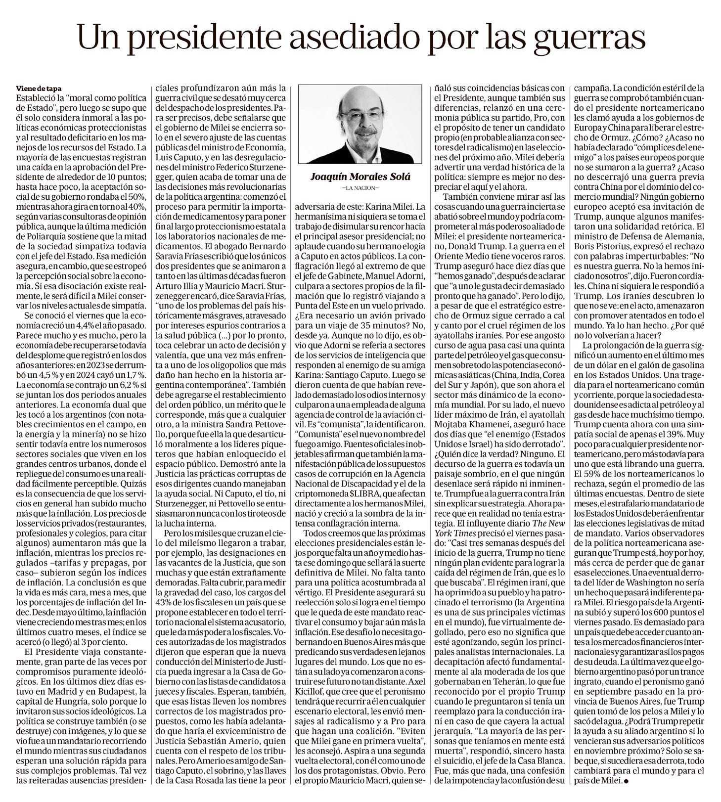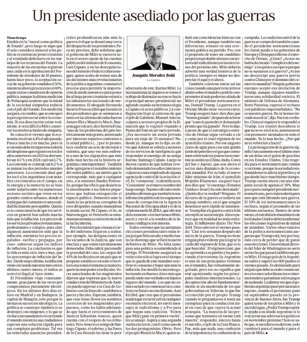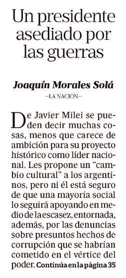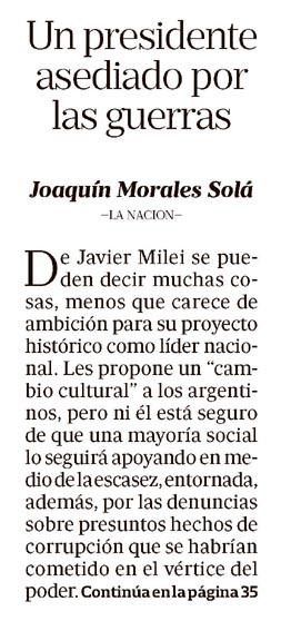 Un presidente asediado por las guerras Joaquín Morales Solá De Javier Milei se pueden decir muchas cosas, menos que carece de ambición para su proyecto histórico como líder nacional. Les propone un “cambio cultural” a los argentinos, pero ni él está seguro de que una mayoría social lo seguirá apoyando en medio de la escasez, entornada, además, por las denuncias sobre presuntos hechos de corrupción que se habrían cometido en el vértice del poder. Continúa en la página 35. Viene de tapa. Estableció la “moral como política de Estado”, pero luego se supo que él solo considera inmoral a las políticas económicas proteccionistas y al resultado deficitario en los manejos de los recursos del Estado. La mayoría de las encuestas registra una caída en la aprobación del Presidente de alrededor de 10 puntos; hasta hace poco, la aceptación social de su gobierno rondaba el 50%, mientras ahora gira en torno al 40%, según varias consultoras de opinión pública, aunque la última medición de Poliarquía sostiene que la mitad de la sociedad simpatiza todavía con el jefe de Estado. Esa medición asegura, en cambio, que se estropeó la percepción social sobre la economía. Si esa disociación existe realmente, le será difícil a Milei conservar los niveles actuales de simpatía. Se conoció el viernes que la economía creció un 4,4% el año pasado. Parece mucho y es mucho, pero la economía debe recuperarse todavía del desplome que registró en los dos años anteriores: en 2023 se derrumbó un 4,5% y en 2024 cayó un 1,7%. La economía se contrajo un 6,2% si se juntan los dos periodos anuales anteriores. La economía dual que les tocó a los argentinos (con notables crecimientos en el campo, la energía y la minería) no se hizo sentir todavía entre los numerosos sectores sociales que viven en los grandes centros urbanos, donde el despliegue del consumo es una realidad fácilmente perceptible. Quizá es la consecuencia de que los servicios en general han subido mucho más que la inflación. Los precios de servicios privados (restaurantes, profesionales y colegios, para citar algunos) aumentaron más que la inflación, mientras los precios regulados —tarifas y prepagas, por caso— subieron según los índices de inflación. La conclusión es que la vida es más cara, mes a mes, que los porcentajes de inflación del Indec. Desde mayo último, la inflación viene creciendo mes tras mes; en los últimos cuatro meses, el índice se acercó (o llegó) al 3 por ciento. El Presidente viaja constantemente, gran parte de las veces por compromisos puramente ideológicos. En los últimos diez días estuvo en Madrid y en Budapest, la capital de Hungría, solo porque lo invitaron sus socios ideológicos. La política se construye también (o se destruye) con imágenes, y lo que se vio fue a un mandatario recorriendo el mundo mientras sus ciudadanos esperan una solución rápida para sus complejos problemas. Tal vez las reiteradas ausencias presidenciales profundizaron aún más la guerra civil que se desató muy cerca del despacho de los presidentes. Para ser precisos, debe señalarse que el gobierno de Milei se encierra solo en el severo ajuste de las cuentas públicas del ministro de Economía, Luis Caputo, y en las desregulaciones del ministro Federico Sturzenegger, quien acaba de tomar una de las decisiones más revolucionarias de la política argentina: comenzó el proceso para permitir la importación de medicamentos y para poner fin al largo proteccionismo estatal de los laboratorios nacionales de medicamentos. El abogado Bernardo Saravia Frías escribió que los únicos dos presidentes que se animaron tanto en las últimas décadas fueron Arturo Illia y Mauricio Macri. Sturzenegger encaró, dice Saravia Frías, “uno de los problemas del país históricamente más graves, atravesado por intereses espurios contrarios a la salud pública (...) por lo pronto, toca celebrar un acto de decisión y valentía, que una vez más enfrenta a uno de los oligopolios que más daño han hecho en la historia argentina contemporánea”. También debe agregarse el restablecimiento del orden público, un mérito que le corresponde, más que a cualquiera, a la ministra Sandra Pettovello, porque fue ella la que desarticuló moralmente a los líderes piqueteros que habían enloquecido el espacio público. Demostró ante la Justicia las prácticas corruptas de esos dirigentes cuando manejaba la ayuda social. Ni Caputo, el tío, ni Sturzenegger, ni Pettovello se entusiasmastonunca con los tiroteos de la lucha interna. Pero los misiles que cruzan el cielo del mileísmo llegaron a trabar, por ejemplo, las designaciones de las vacantes de la Justicia, que son muchas y que están extrañamente demoradas. Falta cubrir, para medir la gravedad del caso, los cargos del 43% de los fiscales en un país que se propone establecer en todo el territorio nacional el sistema acusatorio, que le da más poder a los fiscales. Voces autorizadas de los magistrados dijeron que esperan que la nueva conducción del Ministerio de Justicia pueda ingresar a la Casa de Gobierno con las listas de candidatos a jueces y fiscales. Esperan, también, que esas listas lleven los nombres correctos de los magistrados propuestos, como les había adelantado que haría el exviceministro de Justicia Sebastián Amerio, quien cuenta con el respeto de los tribunales. Pero Amerio es amigo de Santiago Caputo, el sobrino, y las llaves de la Casa Rosada las tiene la peor adversaria de este: Karina Milei. La "hermanísima" ni siquiera se toma el trabajo de disimular su rencor hacia el principal asesor presidencial; no aplaude cuando su hermano elogia a Caputo en actos públicos. La conflagración llegó al extremo de que el jefe de Gabinete, Manuel Adorni, culpara a sectores propios de la filmación que lo registró viajando a Punta del Este en un vuelo privado. ¿Era necesario un avión privado para un viaje de 35 minutos? No, desde ya. Aun