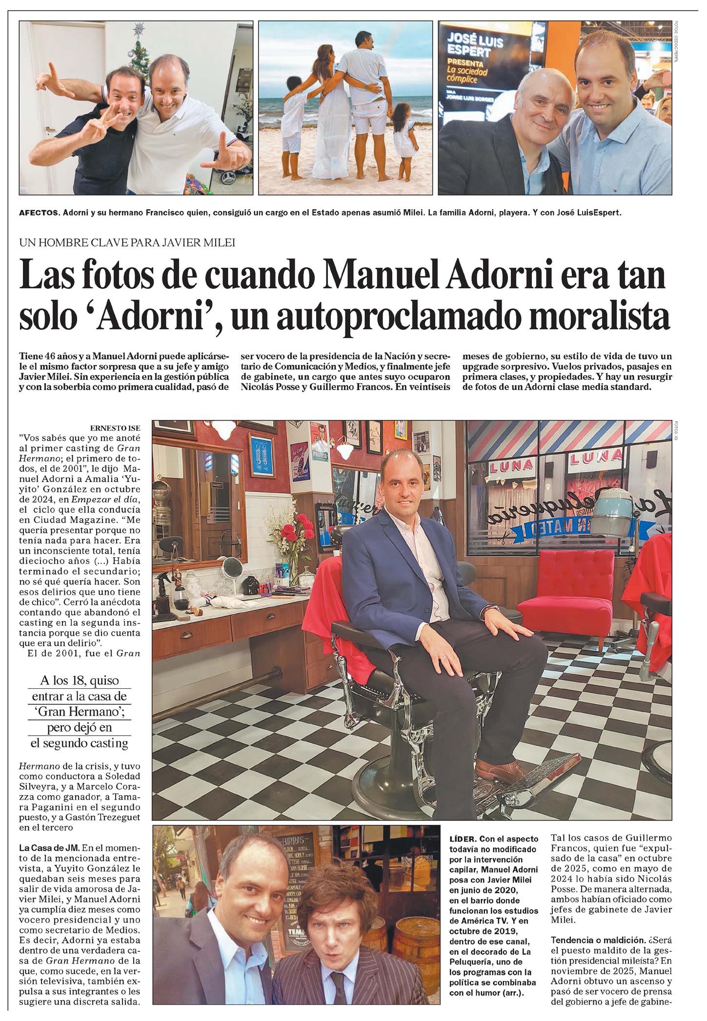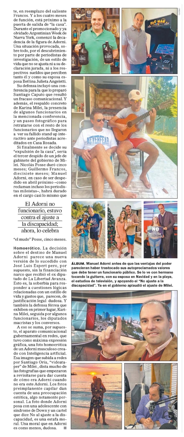 Las fotos de cuando Manuel Adorni era tan solo 'Adorni', un autoproclamado moralista Tiene 46 años y a Manuel Adorni puede aplicársele el mismo factor sorpresa que a su jefe y amigo Javier Milei. Sin experiencia en la gestión pública y con la soberbia como primera cualidad, pasó de ser vocero de la presidencia de la Nación y secretario de Comunicación y Medios, y finalmente jefe de gabinete, un cargo que antes suyo ocuparon Nicolás Posse y Guillermo Francos. En veintiséis meses de gobierno, su estilo de vida tuvo un upgrade sorpresivo. Vuelos privados, pasajes en primera clases, y propiedades. Y hay un resurgir de fotos de un Adorni clase media standard. ERNESTO ISE "Vos sabés que yo me anoté al primer casting de Gran Hermano; el primero de todos, el de 2001", le dijo Manuel Adorni a Amalia "Yuyito" González en octubre de 2024, en Empezar el día, el ciclo que ella conducía en Ciudad Magazine. "Me quería presentar porque no tenía nada para hacer. Era un inconsciente total, tenía dieciocho años (...) Había terminado el secundario; no sé qué quería hacer. Son esos delirios que uno tiene chico". Cerró la anécdota contando que abandonó el casting en la segunda instancia porque se dio cuenta que era un delirio". El de 2001, fue el Gran A los 18, quiso entrar a la casa de 'Gran Hermano'; pero dejó en el segundo casting Hermano de la crisis, y tuvo como conductora a Soledad Silveyra, y a Marcelo Corazza como ganador, a Tamara Paganini en el segundo puesto, y a Gastón Trezeguet en el tercero. La Casa de JM. En el momento de la mencionada entrevista, a Yuyito González le quedaban seis meses para salir de vida amorosa de Javier Milei, y Manuel Adorni a cumplía diez meses como vocero presidencial y uno como secretario de Medios. Es decir, Adorni ya estaba dentro de una verdadera casa de Gran Hermano de la que, como sucede, en la ver- sión televisiva, también expulsa a sus integrantes o le sugiere una discreta salida. LÍDER. Con el aspecto todavía no modificado por la intervención capilar, Manuel Adorni posa con Javier Milei en junio de 2020, en el barrio donde funcionan los estudios de América TV. Y en octubre de 2019, dentro de ese canal, en el decorado de La Peluquería, uno de los programas con la política se combinaba con el humor (arr.). Tal los casos de Guillermo Francos, quien fue "expulsado de la casa" en octubre de 2025, como en mayo de 2024 lo había sido Nicolás Posse. De manera alternada, ambos habían oficiado como jefes de gabinete de Javier Milei. Tendencia o maldición. ¿Será el puesto maldito de la ges- tión presidencial mileísta? En noviembre de 2025, Manuel Adorni obtuvo un ascenso y pasó de ser vocero de prensa del gobierno a jefe de gabinete, en reemplazo del saliente Francos. Y a los cuatro meses de función, está próximo a la puerta de salida de "la casa". Durante el promocionado y olvidado Argentinian Week de Nueva York, comenzó la decadencia de la figura de Adorni. Una situación provocada, sobre todo, por el descubrimiento por parte de periodistas de investigación, de un estilo de vida que no se ajusta ni a su declaración jurada, ni a los respectivos sueldos que percibe tanto él y como su esposa. Su defensa incluyó una conferencia para la que lo preparó Santiago Caputo, que resultó un fracaso comunicacional. Y además, el respaldo concreto de Karina Milei, la presencia de algunos funcionarios en la mencionada conferencia, y un paseo fotográfico para retratarse con el resto de los funcionarios que no llegaron a ver su fallido stand up interactivo ante periodistas acreditados en Casa Rosada. Si finalmente se decide su "expulsión de la casa", sería el tercer despido de un jefe de gabinete del gobierno de Milei. Nicolás Posse duró cinco meses; Guillermo Francos, diecisiete meses; Manuel Adorni, en caso de ser despedido en abril próximo -como reclaman incluso los periodistas mileístas-, habrá durado en el cargo casi lo mismo que El Adorni funcionario, estuvo contra el ajuste a la discapacidad; ahora, lo celebra "el mudo" Posse, cinco meses. Homoerótico. La decisión sobre el destino de Manuel Adorni parece una nueva versión de lo sucedido con José Luis Espert pero, por supuesto, sin la financiación arco que recibió el ex diputado de La Libertad Avanza. Esto es, la soberbia para responder a cuestiones lógicas relacionadas con un estilo de vida y gastos que, parecen, tener justificación legal dudosa. Y también la defensa férrea que exhiben en primer lugar, Karina Milei, seguida por algunos funcionarios, los diputados acristas y los conversos. A eso se suma, por supuesto, el aparato comunicacional gubernamental en redes, que tuvo como máxima expresión gráfica, una foto homoerótica de un Adorni musculoso creado con Inteligencia artificial. Esa imagen que subida a redes por Santiago Oría, "videafaper" de Milei, dista mucho de las fotografías que empezaron a revisitarse para dar cuenta de cómo era Adorni cuando no era este Adorni. Los foto reimplanente capilar da cuenta de una preocupación estética, algo netamente personal. La foto donde Adorni posa con una adolescente con síndrome de Down y un cartel que dice No al ajuste a la discapacidad, es una estafa moral. Una moral que en Adorni es como menos, dudosa. ÁLBUM. Manuel Adorni antes de que las ventajas del poder parecieran haber trastocado sus autoproclamados valores que debe tener un funcionario público. Se lo ve con hermano jocando la guitarra, con su esposa en Navidad y en la playa, en estudios de televisión, y apoyando el "No ajuste a la discapacidad". Ya en el gobierno aplaudió el ajuste de Milei. Menciones: cpol1 cnot
