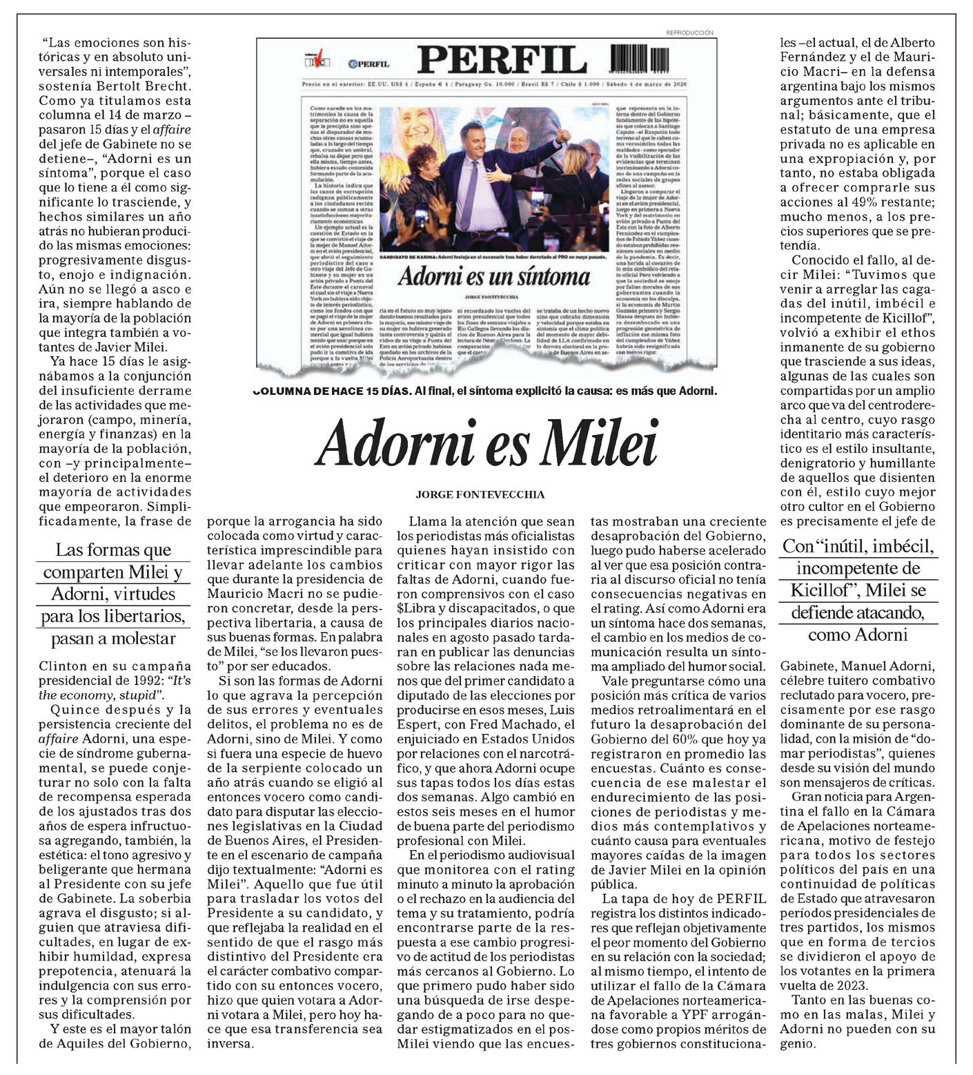 Adorni es Milei JORGE FONTEVECCHIA "Las emociones son históricas y en absoluto universales ni intemporales", sostenía Bertolt Brecht. Como ya titulamos esta columna el 14 de marzo - pasaron 15 días y el affair el jefe de Gabinete no se detiene-, "Adorni es un síntoma", porque el caso que lo tiene a él como significante lo trasciende, y hechos similares un año atrás no hubieran producido las mismas emociones: progresivamente disgusto, enojo e indignación. Aún no se llegó a asco, siempre hablando de la mayoría de la población que integra también a votantes de Javier Milei. Ya hace 15 días le asignábamos a la conjunción el insuficiente derrame de las actividades que mejoraron (campo, minería, energía y finanzas) en la mayoría de la población, con -y principalmente- el deterioro en la enorme mayoría de actividades que empeoraron. Simplificadamente, la frase de Las formas que comparten Milei y Adorni, virtudes para los libertarios, pasan a molestar Clinton en su campaña presidencial de 1992: "It's the economy, stupid". Quince después y la persistencia creciente del affaire Adorni, una especie de síndrome gubernamental, se puede conjeturar no solo con la falta de recompensa esperada de los ajustados tras dos años de espera infructuosa agregando, también, la estética: el tono agresivo y beligerante que hermana al Presidente con su jefe de Gabinete. La soberbia agrava el disgusto; si alguien que atraviesa dificultades, en lugar de exhibir humildad, expresa prepotencia, atenuará la indulgencia con sus errores y la comprensión por sus dificultades. Y este es el mayor talón de Aquiles del Gobierno, (PERFIL) Adorni es un síntoma "COLUMNA DE HACE 15 DÍAS. Al final, el síntoma explicitó la causa: es más que Adorni. Adorni es Milei JORGE FONTEVECCHIA porque la arrogancia ha sido colocada como virtud y característica imprescindible para llevar adelante los cambios que durante la presidencia de Mauricio Macri no se pudieron concretar, desde la perspectiva libertaria, a causa de sus buenas formas. En palabra de Milei, "se los llevaron puesto" por ser educados. Si son las formas de Adorni lo que agrava la percepción de sus errores y eventuales delitos, el problema no es de Adorni, sino de Milei. Y como si fuera una especie de huevo de la serpiente colocado un año atrás cuando se eligió al entonces vocero como candidato para disputar las elecciones legislativas en la Ciudad de Buenos Aires, el Presidente en el escenario de campaña dijo textualmente: "Adorni es Milei". Aquello que fue útil para trasladar los votos del Presidente a su candidato, y que reflejaba la realidad en el sentido de que el rasgo más distintivo del Presidente era el carácter combativo compartido con su entonces vocero, hizo que quien votara a Adorni votara a Milei, pero hoy hace que esa transferencia sea inversa. Llama la atención que sean los periodistas más oficialistas quienes hayan insistido con criticar con mayor rigor las faltas de Adorni, cuando fueron comprensivos con el caso $Libra y discapacitados, o que los principales diarios nacionales en agosto pasado tardaran en publicar las denuncias sobre las relaciones nada menos que del primer candidato a diputado de las elecciones por producirse en esos meses, Luis Espert, con Fred Machado, exenjuiciado en Estados Unidos por relaciones con el narcotráfico, y que ahora Adorni ocupa sus tapas todos los días estas dos semanas. Algo cambió en estos seis meses en el humor de buena parte del periodismo profesional con Milei. En el periodismo audiovisual que monitorea con el rating minuto a minuto la aprobación o el rechazo en la audiencia y su tratamiento, podría encontrarse parte de la respuesta a ese cambio progresivo de actitud de los periodistas más cercanos al Gobierno. Lo que primero pudo haber sido una búsqueda de irse despegando de a poco para no quedar estigmatizados en el pos- Milei viendo que las encuestas mostraban una creciente desaprobación del Gobierno, luego pudo haberse acelerado al ver que esa posición contraria al discurso oficial no tenía consecuencias negativas en el rating. Así como Adorni era un síntoma hace dos semanas, el cambio en los medios de comunicación resulta un síntoma ampliado del humor social. Vale preguntarse cómo una posición más crítica de varios medios retroalimentará en el futuro la desaprobación del Gobierno del 60% que hoy ya registraron en promedio las encuestas. Cuánto es consecuencia de ese malestar el endurecimiento de las posiciones de periodistas y medios más contemplativos y cuánto causa para eventuales mayores caídas de la imagen de Javier Milei en la opinión pública. La tapa de hoy de PERFIL registra los distintos indicadores que reflejan objetivamente el peor momento del Gobierno en su relación con la sociedad; al mismo tiempo, el intento de utilizar el fallo de la Cámara de Apelaciones norteamericana favorable a YPF arrogándose como propios méritos de tres gobiernos constituciona- les -el actual, el de Alberto Fernández y el de Mauricio Macri- en la defensa argentina bajo los mismos argumentos ante el tribunal; básicamente, que el estatuto de una empresa privada no es aplicable en una expropiación y, por tanto, no estaba obligada a ofrecer comprarle sus acciones al 49% restante; mucho menos, a los precios superiores que se pretendía. Conocido el fallo, al decir Milei: "Tuvimos que venir a arreglar las cagadas del inútil, imbécil e incompetente de Kicillof", volvió a exhibir el ethos inmanente de su gobierno que trasciende a sus ideas, algunas de las cuales son compartidas por un amplio arco que va del centroderecha al centro, cuyo rasgo identitario más característico es el estilo insultante, denigratorio y humillante de aquellos que disienten con él, estilo cuyo mejor otro cultor en el Gobierno es precisamente el jefe de Con "inútil, imbécil, incompetente de Kicillof", Milei se defiende atacando, como Adorni Gabinete, Manuel Adorni, célebre tuitero c