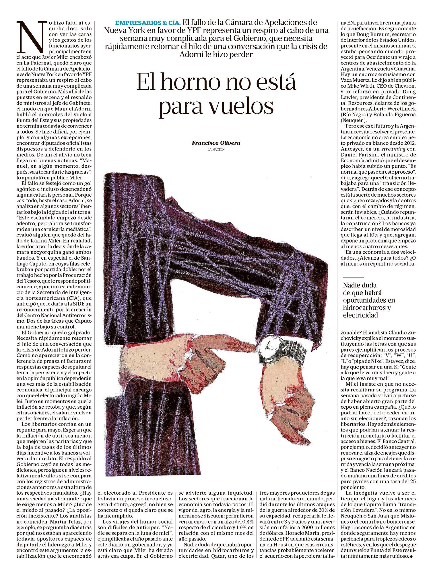 El horno no está para vuelos Francisco Olivera Ocho hizo falta ni escucharlos: solo con ver las caras y los gestos de los funcionarios ayer, principalmente en el acto que Javier Milei encabezó en La Paternal, quedó claro que el fallo de la Cámara de Apelaciones de Nueva York en favor de YPF representaba un respiro al cabo de una semana muy complicada para el Gobierno. Más allá de las puestas en escena y el respaldo de ministros al jefe de Gabinete, el modo en que Manuel Adorni habló el miércoles del vuelo a Punta del Este y sus propiedades no termina todavía de convencer a todos. Se hizo difícil, por ejemplo, y con algunas excepciones, encontrar diputados oficialistas dispuestos a defenderlo en los medios. De ahí el alivio no bien llegaron buenas noticias. "Manuel, en algún momento, después, va a tocar darte las gracias", lo apuntaló en público Milei. El fallo se festejó como un gol agónico e incluso desencadenó alguna catarsis personal. Porque casi todo, hasta el caso Adorni, se analiza en algunos sectores libertarios bajo la lógica de la interna. "Este escándalo empezó desde adentro, pero ahora se transformó en una carnicería mediática", evaluó alguien que quedó del lado de Karina Milei. En realidad, la euforia por la decisión de la cámara neoyorquina ganó ambos bandos. Y en especial el de Santiago Caputo, en cuyas filas celebraban por partida doble: por el trabajo hecho por la Procuración del Tesoro, que le responde políticamente, y por un reciente anuncio de la Secretaría de Inteligencia norteamericana (CIA), que anticipó que le daría a la SIDE u reconocimiento por la creación del Centro Nacional Antiterrorismo. Dos de las áreas que Caputo mantiene bajo su control. El Gobierno quedó golpeado. Necesita rápidamente retomar el hilo de una conversación que la crisis de Adorni le hizo perder. Como no aparecieron en la conferencia de prensa ni facturas ni respuestas capaces de sepultar el tema, la persistencia y el impacto en la opinión pública dependerán una vez más de la estabilización económica, el principal encargo con que el electorado ungió a Milei. Justo en momentos en que la inflación se retoba y que, según cifras oficiales, el salario vuelve a perder frente a la inflación. Los libertarios confían en un repunte para mayo. Esperan que la inflación de abril sea menor, que mejoren las paritarias y que la baja de tasas de los últimos días incentive a los bancos a volver a dar crédito. El respaldo al Gobierno cayó en todas las mediciones, pero sigue en niveles relativamente altos si se compara con los registros de administraciones anteriores a esta altura de sus respectivos mandatos. ¿Hay una sociedad más tolerante o que le exige menos a Milei? ¿Incide el miedo al pasado? ¿La oposición inexistente? Los analistas no coinciden. Martín Tetaz, por ejemplo, se preguntaba días atrás por qué no estaban apareciendo todavía opositores capaces de disputarle el liderazgo a Milei y encontró este argumento: la estabilización que le encomendó el electorado al Presidente es todavía un proceso inconcluso. Será distinto, agregó, no bien se concrete o si queda claro que se ha incumplido. Los virajes del humor social son difíciles de anticipar. "Nadie se para en la luna de miel", ejemplificaba el año pasado ante este diario un gobernador, y ya está claro que Milei ha dejado atrás esa etapa. En el Gobierno se advierte alguna inquietud. Los sectores que traccionan la economía son todavía pocos. El rigor del agro, la energía y la minería no se discuten: permitieron "cerrar enero" con un alza del 0,4% respecto de diciembre y 1,9% en relación con el mismo mes del año pasado. Nadie duda de que habrá oportunidades en hidrocarburos y electricidad. Qatar, uno de los tres mayores productores de gas natural licuado en el mundo, perdió durante los últimos ataques de la guerra alrededor de 20% de su capacidad: recuperarla le llevará entre 3 y 5 años y una inversión no inferior a 2600 millones de dólares. Horacio Marín, presidente de YPF, adelantó esta semana en Houston que esas circunstancias probablemente aceleren el acuerdo con la petrolera italiana ENI para invertir en una planta de licuefacción. Es seguramente lo que Doug Burgum, secretario de Interior de los Estados Unidos, presente en el mismo seminario, estaba pensando cuando proyectó para Occidente un viraje a centros de abastecimiento de la Argentina, Venezuela y Guayana. Hay un enorme entusiasmo con Vaca Muerta. Lo dijo ahí en público Mike Wirth, CEO de Chevron, y lo reforzó en privado Doug Lawler, presidente de Continental Resources, delante de los gobernadores Alberto Weretilneck (Río Negro) y Rolando Figueroa (Neuquén). Pero ese es el futuro y la Argentina necesita resolver el presente. La economía no crea empleo neto privado en blanco desde 2012. Anteayer, en un streaming con Daniel Parisini, el ministro de Economía admitió que el desempleo había subido un punto. "Es normal que pase en este proceso", dijo, y agregó que el Gobierno trabajaba para una "transición llevadera". Detrás de ese concepto está la suerte de muchos sectores que siguen rezagados y la de otros que, con el cambio de régimen, serán inviables. ¿Cuándo repuntarán el comercio, la industria, la construcción? Los bancos ya describen un nivel de morosidad que llega al 10% y que, agregan, expone un problema que empezó al menos cuatro meses antes. Es una economía a dos velocidades. ¿Alcanza para todos? ¿O al menos un equilibrio social razonable? El analista Claudio Zuchovicky explica el momento sustituyendo las letras con que sus pares ejemplifican los procesos de recuperación: "V", "W", "U", "L" o "pipa de Nike". Esta vez, dice, hay que pensar en una K: "Gente a la que le va muy bien y gente a la que le va muy mal". Milei insiste en que no necesita recalibrar su programa. La semana pasada volvió a jactarse de haber abierto gran parte del cepo en plena campaña. ¿Qué lo podría