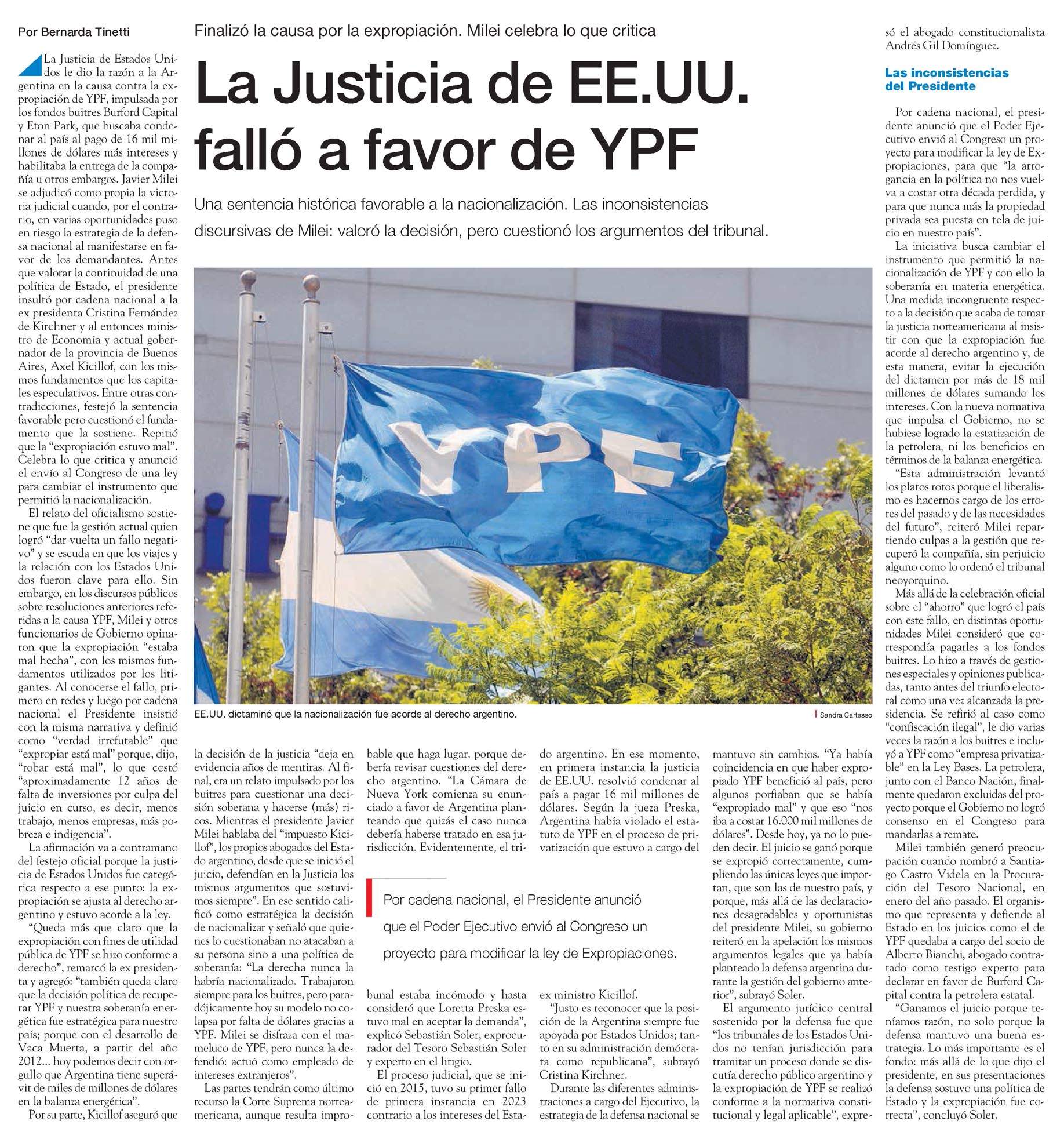 La Justicia de EE.UU. falló a favor de YPF Una sentencia histórica favorable a la nacionalización. Las inconsistencias discursivas de Milei: valoró la decisión, pero cuestionó los argumentos del tribunal. Por Bernarda Tinetti @La Justicia de Estados Unidos le dio la razón a la Argentina en la causa contra la expropiación de YPF, impulsada por los fondos buitres Burford Capital y Eton Park, que buscaba condenar al país al pago de 16 mil millones de dólares más intereses y habilitaba la entrega de la compañía u otros embargos. Javier Milei se adjudicó como propia la victoria judicial cuando, por el contrario, en varias oportunidades puso en riesgo la estrategia de la defensa nacional al manifestarse en favor de los demandantes. Antes que valorar la continuidad de una política de Estado, el presidente insultó por cadena nacional a la ex presidenta Cristina Fernández de Kirchner y al entonces ministro de Economía y actual gobernador de la provincia de Buenos Aires, Axel Kicillof, con los mismos fundamentos que los capitales especulativos. Entre otras contradicciones, festejó la sentencia favorable pero cuestionó el fundamento que la sostiene. Repitió que la "expropiación estuvo mal". Celebra lo que critica y anunció el envío al Congreso de una ley para cambiar el instrumento que permitió la nacionalización. El relato del oficialismo sostiene que fue la gestión actual quien logró "dar vuelta un fallo negativo" y se escuda en que los viajes y la relación con los Estados Unidos fueron clave para ello. Sin embargo, en los discursos públicos sobre resoluciones anteriores referidas a la causa YPF, Milei y otros funcionarios de Gobierno opinaron que la expropiación "estaba mal hecha", con los mismos fundamentos utilizados por los litigantes. Al conocerse el fallo, primero en redes y luego por cadena nacional el Presidente insistió con la misma narrativa y definió como "verdad irrefutable" que "expropiar está mal" porque, dijo, "robar está mal", lo que costó "aproximadamente 12 años de falta de inversiones por culpa del juicio en curso, es decir, menos trabajo, menos empresas, más pobreza e indigencia". La afirmación va a contramano del festejo oficial porque la justicia de Estados Unidos fue categórica respecto a ese punto: la expropiación se ajusta al derecho argentino y estuvo acorde a la ley. "Queda más que claro que la expropiación con fines de utilidad pública de YPF se hizo conforme a derecho", remarcó la ex presidenta y agregó: "también queda claro que la decisión política de recuperar YPF y nuestra soberanía energética fue estratégica para nuestro país; porque con el desarrollo de Vaca Muerta, a partir del año 2012... hoy podemos decir con orgullo que Argentina tiene superávit de miles de millones de dólares en la balanza energética". Por su parte, Kicillof aseguró que la decisión de la justicia "deja en evidencia años de mentiras. Al final, era un relato impulsado por los buitres para cuestionar una decisión soberana y hacerse (más) ricos. Mientras el presidente Javier Milei hablaba del "impuesto Kicillof", los propios abogados del Estado argentino, desde que se inició el juicio, defendían en la Justicia los mismos argumentos que sostuvimos siempre". En ese sentido calificó como estratégica la decisión de nacionalizar y señaló que quienes lo cuestionaban no atacaban a su persona sino a una política de soberanía: "La derecha nunca la habría nacionalizado. Trabajaron siempre para los buitres, pero paradójicamente hoy su modelo no colapsa por falta de dólares gracias a YPF. Milei se disfraza con el mameluco de YPF, pero nunca la defendió: actuó como empleado de intereses extranjeros". Las partes tendrán como último recurso la Corte Suprema norteamericana, aunque resulta improbable que haga lugar, porque debería revisar cuestiones del derecho argentino. "La Cámara de Nueva York comienza su enunciado a favor de Argentina planteando que quizás el caso nunca debería haberse tratado en esa jurisdicción. Evidentemente, el tribunal estaba incómodo y hasta consideró que Loretta Preska estuvo mal en aceptar la demanda", explicó Sebastián Soler, exprocurador del Tesoro Sebastián Soler y experto en el litigio. El proceso judicial, que se inició en 2015, tuvo su primer fallo de primera instancia en 2023 contrario a los intereses del Estado argentino. En ese momento, en primera instancia la justicia de EE.UU. resolvió condenar al país a pagar 16 mil millones de dólares. Según la jueza Preska, Argentina había violado el estatuto de YPF en el proceso de privatización que estuvo a cargo del ex ministro Kicillof. "Justo es reconocer que la posición de la Argentina siempre fue apoyada por Estados Unidos; tanto en su administración demócrata como republicana", subrayó Cristina Kirchner. Durante las diferentes administraciones a cargo del Ejecutivo, la estrategia de la defensa nacional se mantuvo sin cambios. "Ya había coincidencia en que haber expropiado YPF benefició al país, pero algunos porfiaban que se había "expropiado mal" y que eso "nos iba a costar 16.000 mil millones de dólares". Desde hoy, ya no lo pueden decir. El juicio se ganó porque se expropió correctamente, cumpliendo las únicas leyes que importan, que son las de nuestro país, y porque, más allá de las declaraciones desagradables y oportunistas del presidente Milei, su gobierno reiteró en la apelación los mismos argumentos legales que ya había planteado la defensa argentina durante la gestión del gobierno anterior", subrayó Soler. El argumento jurídico central sostenido por la defensa fue que "los tribunales de los Estados Unidos no tenían jurisdicción para tramitar un proceso donde se discutía derecho público argentino y la expropiación de YPF se realizó conforme a la normativa constitucional y legal aplicable", expre- só el abogado constitucionalista Andrés Gil Domínguez. Las inconsistencias del Presidente Por cadena nac