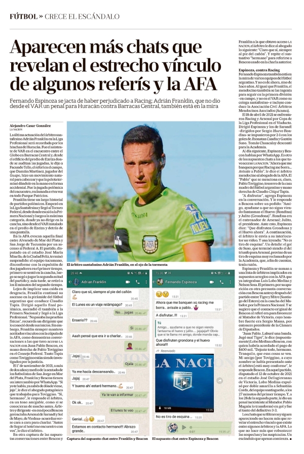 Aparecen más chats que revelan el estrecho vínculo de algunos referís y la AFA Alejandro Casar González FÚTBOL » CRECE EL ESCÁNDALO Aparecen más chats que revelan el estrecho vínculo de algunos referís y la AFA Fernando Espinoza se jacta de haber perjudicado a Racing; Adrián Franklin, que no dio desde el VAR un penal para Huracán contra Barracas Central, también está en la mira Alejandro Casar González LA NACION La última actuación del árbitro santafesino Adrián Franklin en la Liga Profesional será recordada por los hinchas de Huracán. Fue el asistente de VAR en el encuentro entre el Globo en Barracas Central y, desde el edificio del predio de Ezeiza donde se auditan las jugadas, le dijo a Facundo Tello, el referí en el campo, que Damián Martínez, jugador del Guapo, hizo un movimiento natural para cabecear y que la pelota terminó dándole en la mano en forma accidental. Fue la jugada polémica del encuentro, reclamada a viva voz en todo Parque Patricios. Franklin tiene un largo historial de partidos polémicos. Empezó en la Liga Santafesina y llegó al Torneo Federal, desde donde escaló a la Primera Nacional y luego a la máxima categoría, donde ya no dirige en la cancha, sino desde el VAR instalado en el predio de Ezeiza y detrás de una pantalla. En la AFA evocan aquella final entre Alvarado de Mar del Plata y San Jorge de Tucumán por un ascenso al Federal A. El partido, disputado en el estadio José María Minella, de la Ciudad Feliz, terminó suspendido: el equipo tucumano, disconforme con la expulsión de dos jugadores en el primer tiempo, primero se sentó en la cancha, luego se negó a jugar la segunda mitad del partido y, más tarde, se retiró a los 11 minutos del segundo tiempo. Lejos de implicar una caída en desgracia, Franklin continuó su ascenso en la pirámide del fútbol argentino que conduce Claudio Tapia. Dirigió aquella final polémica, ascendió él también a la Primera Nacional y llegó a la Liga Profesional. “No pasaba las pruebas físicas”, recuerda un dirigente que lo conoció desde sus inicios. Sin embargo, Franklin siempre mantuvo aceitados vínculos con la cúpula de la AFA, como demuestran conversaciones a las que tuvo acceso LA NACION con Juan Pablo Beacon, mano derecha de Pablo Toviggino en el Consejo Federal. Tanto Tapia como Toviggino están siendo investigados por la justicia. El 1 de noviembre de 2021, a más de dos años y medio de la sentada de los futbolistas de San Jorge en Mar del Plata, Franklin y Beacon tienen un intercambio por WhatsApp. “Si yo te hablo, ya sabés de dónde viene, jaja”, le dice el abogado patagónico que trabajaba para Toviggino. “Sí, hermano”, le responde el árbitro, en un tono amigable, como si se conocieran de mucho antes. Árbitro y dirigente –en esa época Beacon gerenció a Arsenal de Sarandí y Sol de Mayo, de Viedma– acuerdan verse cara a cara para charlar. “Antes de llegar al hotel me encuentro con vos”, le dice el árbitro. En otra captura de las supuestas conversaciones entre Beacon y Franklin a la que obtuvo acceso LA NACION, el árbitro le dice al abogado lo siguiente: “Claro que sí, siempre al pie del cañón”. Y repite el sustantivo “hermano” para referirse a Beacon, usado en la charla anterior. Espinoza, contra Racing Fernando Espinoza también está en la mira de varios equipos del fútbol argentino. Y no es de ahora, sino de hace años. Al igual que Franklin, el mendocino también se las ingenia para seguir en la primera división -en campo, y no en el VAR como su colega santafesino– e incluso conduce la Asociación Civil Árbitros Mendocinos Asociados (Acama). El 18 de abril de 2021 se enfrentaron Racing y Arsenal por Copa de la Liga Profesional en el Viaducto. Dirigió Espinoza y los de Sarandí -dirigidos por Sergio Huevo Rondina– se impusieron por 2-1 con los goles de Jhonatan Candia y Gastón Suso. Tomás Chancalay descontó para la Academia. Al día siguiente, Espinoza y Beacon hablan por WhatsApp. Es otro de los supuestos chats a los que tuvo acceso LA NACION. “Ahora que me banquen xq racing me borra... Avisale a Pablo”, le dice el árbitro mendocino al abogado de la AFA. El “Pablo” que se menciona es, claro, Pablo Toviggino, tesorero de la casa madre del fútbol argentino y mano derecha de Claudio Chiqui Tapia. “A disfrutar”, agrega Espinoza en la conversación. Y le responde Beacon sobre un pedido: “Amigo, ayudame a que no sigan viendo fantasmas el Huevo (Rondina) y Julito (Grondona)”. Rondina era el entrenador de Arsenal; Julito, el presidente. Ante esto, Espinoza dice: “Que disfruten Grondona y el Huevo ahora”. A continuación, el árbitro le envía a su interlocutor un video. Y una leyenda: “No es tiro de esquina”. Un detalle: el gol de Suso, que terminó siendo el de triunfo para Arsenal, provino de un tiro de esquina muy reclamado por la Academia, que, a fin de cuentas, tenía razón. Espinoza y Franklin se suman a una lista de árbitros implicados en supuestos arreglos con la AFA que integraban Luis Lobo Medina y Nelson Sosa. El primero, por su aparición en otra presunta conversación con Beacon antes y después del partido entre Tigre y Mitre (Santiago del Estero) en la cancha del Matador, por la Primera Nacional. Y se sugiere que el contacto original de Beacon al referí era para favorecer al Matador de Victoria, cuyo hombre fuerte era Sergio Massa, por entonces presidente de la Cámara de Diputados. “Juan Pablo. Laburé una banda. Jugó mal Tigre”, le dice (supuestamente) Lobo Medina a Beacon, con quien habría acordado el pago de $400 mil. “Dejaste todo, hermano. Tranquilo, que esas cosas se ven. Mi amigo [por Toviggino, a cuyo nombre se había presentado ante el árbitro] está muy conforme”, le responde Beacon. En aquel partido, disputado el 12 de octubre de 2021 en el estadio José Dellagiovanna de Victoria, Lobo Medina expulsó por doble amarilla a Sebastián Corda, del equipo santiagueño,