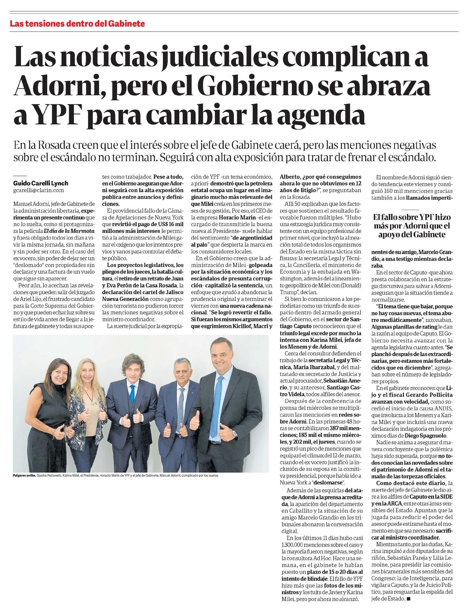 Las noticias judiciales complican a Adorni, pero el Gobierno se abraza a YPF para cambiar la agenda Guido Carelli Lynch En la Rosada creen que el interés sobre el jefe de Gabinete caerá, pero las menciones negativas sobre el escándalo no terminan. Seguirá con alta exposición para tratar de frenar el daño. Manuel Adorni, jefe de Gabinete de la administración libertaria, experimenta un presente continuo que no lo suelta, como si protagonizara la película El día de la marmota: obligado todos los días a vivir la misma jornada, sin poder ser otro. En el caso del ex vocero, sin poder dejar de ser un "deslomado" con propiedades sin declarar y una factura de un vuelo que sigue sin aparecer. Peor aún, lo acechan las revelaciones que pueden salir del juzgado de Ariel Lijo, el frustrado candidato para la Corte Suprema del Gobierno, y que pueden echar luz sobre su estilo de vida antes de llegar a la Jefatura de Gabinete y sus aportes como trabajador. Pese a todo, en el Gobierno aseguran que Adorni seguirá con la alta exposición pública, entre anuncios y definiciones. El providencial fallo de la Cámara de Apelaciones de Nueva York, que revirtió el pago de US$ 16 mil millones más intereses, le permitió a la administración de Milei ganar el oxígeno que no habían conseguido los intentos previos y vanos por controlar el debate público. Los proyectos legislativos, los tiempos de los jueces, la batalla cultural, el retiro de un retrato de Juan y Eva Perón de la Casa Rosada, la declaración del cartel de Jalisco Nueva Generación como agrupación terrorista, no pudieron torcer las menciones negativas sobre el ministro coordinador. La suerte judicial por la expropiación de YPF -un tema económico, a priori- demostró que la petrolera estatal ocupa un lugar en el imaginario mucho más relevante de lo que Milei creía en los primeros meses de su gestión. Por eso, el CEO de la empresa, Horacio Marín -el encargado de transmitirle la buena nueva al Presidente-, suele hablar del sentimiento 'de argentinidad al palo' que despierta la marca en los consumidores locales. En el Gobierno creen que la administración de Milei -golpeada por la situación económica y los escándalos de presunta corrupción- capitalizó la sentencia, un enfoque que ayudó a abandonar la prudencia original y a terminar el viernes con una nueva cadena nacional. 'Se logró revertir el fallo. Si fueran los mismos argumentos que esgrimieron Kicillof, Macri y Alberto, ¿por qué conseguimos ahora lo que no obtuvimos en 12 años de litigio?', se preguntaban en la Rosada. Allí explicaban que los factores que sostienen el resultado favorable fueron múltiples. 'Hubo una estrategia jurídica muy consistente, con un equipo profesional de primer nivel, que incluyó la alineación total de todos los organismos del Estado en la misma táctica, sin fisuras: la Secretaría Legal y Técnica, la Cancillería, el Ministerio de Economía y la embajada en Washington, además del alineamiento geopolítico de Milei con Donald Trump', decían. Si bien lo comunicaron a los periodistas como un triunfo de su espacio dentro del armado general del Gobierno, en el sector de Santiago Caputo reconocieron que el triunfo legal excede por mucho la interna con Karina Milei, jefa de los Menem y de Adorni. Cerca del consultor defienden el trabajo de la Secretaría Legal y Técnica, María Ibarzabal, y del maltratado ex secretario de Justicia, actual procurador, Sebastián Amerio, y su antecesor, Santiago Castro Videla, todos alfiles del asesor. Pulgares arriba. Sandra Pettovello, Karina Milei, el Presidente, Horacio Marín (YPF) y el jefe de Gabinete, Manuel Adorni, complicado por los vuelos. Después de la conferencia de prensa del miércoles se multiplicaron las menciones en redes sobre Adorni. En las primeras 48 horas se contabilizaron 387 mil menciones: 185 mil el mismo miércoles y 202 mil el jueves, cuando se registró un pico que equiparó el clímax del 12 de marzo, cuando el ex vocero justificó la inclusión de su esposa en la comitiva presidencial porque había ido a Nueva York a 'deslomarse'. Además de las esquirlas del ataque de Adorni a la prensa acreditada, la aparición del departamento en Caballito y la situación de su amigo Marcelo Grandío en los tribunales abonaron la conversación digital. En los últimos 11 días hubo casi 1.300.000 menciones sobre el caso; la mayoría fueron negativas, según la consultora Ad Hoc. Hace una semana, en el gabinete le habían puesto un plazo de 15 o 20 días al intento de blindaje. El fallo de YPF hizo más que las fotos de los ministros y los tuits de Javier y Karina Milei, pero por ahora no alcanzó. El nombre de Adorni siguió siendo tendencia este viernes y consiguió 160 mil menciones gracias también a los llamados impertinentes de su amigo, Marcelo Grandío, a una testigo mientras declaraba. En el sector de Caputo -que ahora resta colaboración en la estrategia discursiva para salvar a Adorni- aseguran que la situación tiende a normalizarse. 'El tema tiene que bajar porque no hay cosas nuevas; el tema aburre mediáticamente', razonaban. Algunas planillas de rating le dan la razón al equipo de Caputo. El Gobierno necesita avanzar con la agenda legislativa cuanto antes. 'Se planchó después de las extraordinarias, pero estamos más fortalecidos que en diciembre', agregaban sobre el número de legisladores propios. En el gabinete reconocen que Lijo y el fiscal Gerardo Pollicita avanzan con velocidad, como sucedió al inicio de la causa ANDIS, que involucra a los Menem y a Karina Milei y que incluirá una nueva declaración indagatoria en los próximos días de Diego Spagnuolo. Nadie se anima a asegurar de manera concluyente que la polémica haya sido superada, porque no todos conocían las novedades sobre el patrimonio de Adorni ni el tamaño de las torpezas oficiales. Como destacó este diario, la suerte del jefe de Gabinete le dio aire a los alfiles de Caputo en la SIDE y en la ARCA, en