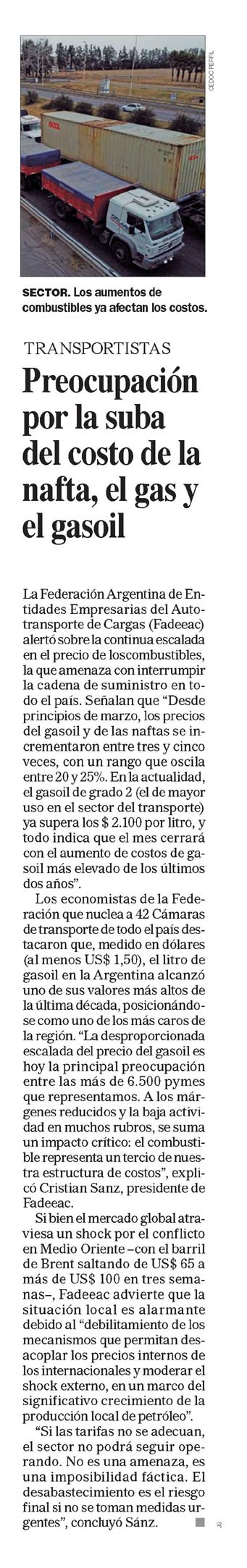 Preocupación por la suba del costo de la nafta, el gas y el gasoil SECTOR. Los aumentos de combustibles ya afectan los costos. TRANSPORTISTAS Preocupación por la suba del costo de la nafta, el gas y el gasoil La Federación Argentina de Entidades Empresarias del Autotransporte de Cargas (Fadeeac) alertó sobre la continua escalada en el precio de los combustibles, la que amenaza con interrumpir la cadena de suministro en todo el país. Señalan que "Desde principios de marzo, los precios del gasoil y de las naftas se incrementaron entre tres y cinco veces, con un rango que oscila entre 20 y 25%. En la actualidad, el gasoil de grado 2 (el de mayor uso en el sector del transporte) ya supera los $ 2.100 por litro, y todo indica que el mes cerrará con el aumento de costos de gasoil más elevado de los últimos dos años". Los economistas de la Federación que nuclea a 42 Cámaras de transporte de todo el país destacaron que, medido en dólares (al menos US$ 1,50), el litro de gasoil en la Argentina alcanzó uno de sus valores más altos de la última década, posicionándose como uno de los más caros de la región. "La desproporcionada escalada del precio del gasoil es hoy la principal preocupación entre las más de 6.500 pymes que representamos. A los márgenes reducidos y la baja actividad en muchos rubros, se suma un impacto crítico: el combustible representa un tercio de nuestra estructura de costos", explicó Cristian Sanz, presidente de Fadeeac. Si bien el mercado global atraviesa un shock por el conflicto en Medio Oriente -con el barril de Brent saltando de US$ 65 a más de US$ 100 en tres semanas-, Fadeeac advierte que la situación local es alarmante debido al "debilitamiento de los mecanismos que permitan desacoplar los precios internos de los internacionales y moderar el shock externo, en un marco del significativo crecimiento de la producción local de petróleo". "Si las tarifas no se adecuan, el sector no podrá seguir operando. No es una amenaza, es una imposibilidad fáctica. El desabastecimiento es el riesgo final si no se toman medidas urgentes", concluyó Sanz. Menciones: Ceco1 cfinanE