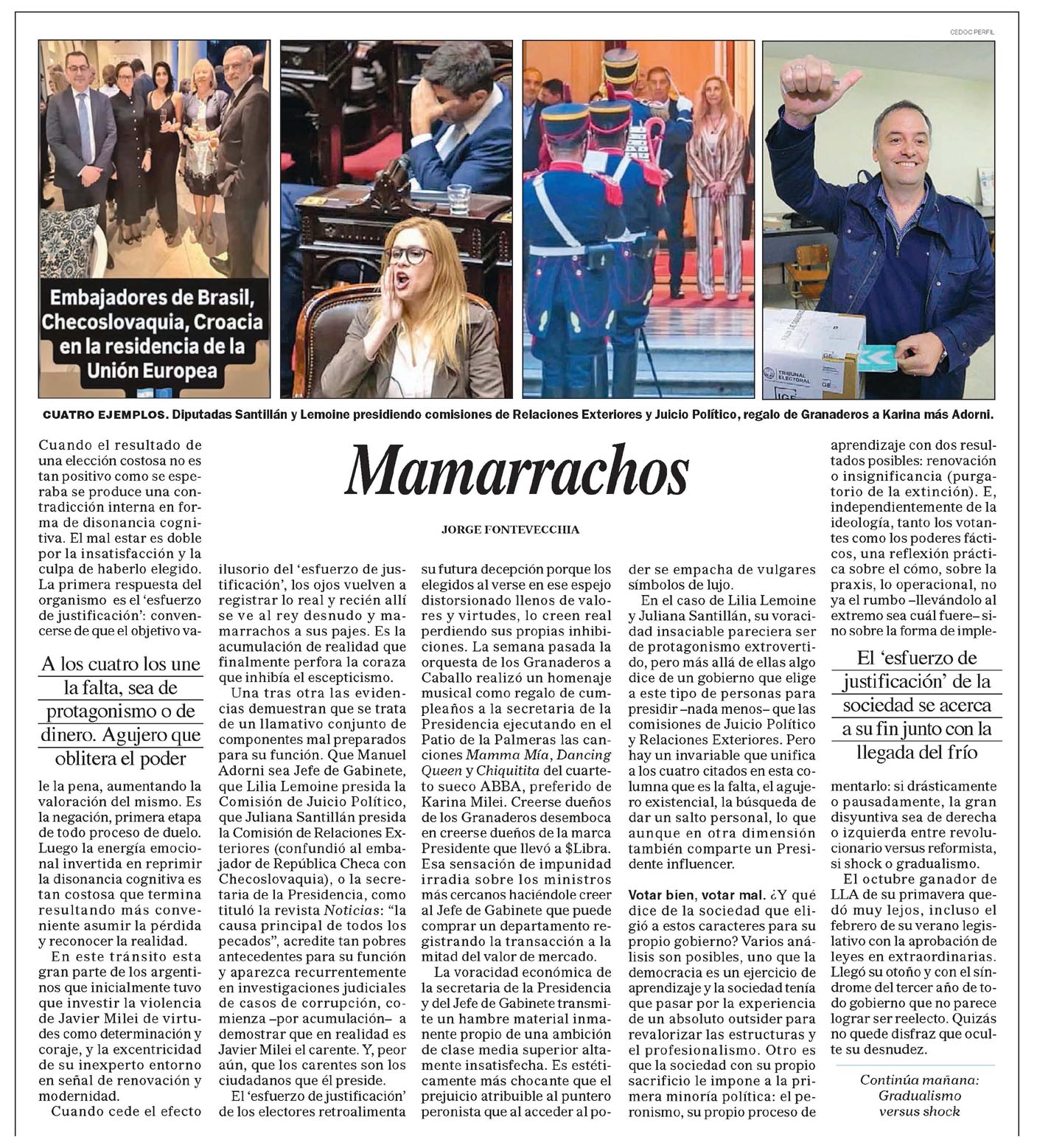 Mamarrachos JORGE FONTEVECCHIA CUATRO EJEMPLOS. Diputadas Santillán y Lemoine presidiendo comisiones de Relaciones Exteriores y Juicio Político, regalo de Granaderos a Karina más Adorni. Cuando el resultado de una elección costosa no es tan positivo como se esperaba se produce una contradicción interna en forma de disonancia cognitiva. El malestar es doble por la insatisfacción y la culpa de haberlo elegido. La primera respuesta del organismo es el “esfuerzo de justificación”: convencerse de que el objetivo va- A los cuatro los une la falta, sea de protagonismo o de dinero. Agujero que oblitera el poder le la pena, aumentando la valoración del mismo. Es la negación, primera etapa de todo proceso de duelo. Luego la energía emocional invertida en reprimir la disonancia cognitiva es tan costosa que termina resultando más conveniente asumir la pérdida y reconocer la realidad. En este tránsito están gran parte de los argentinos que inicialmente tuvo que invertir la violencia de Javier Milei de virtudes como determinación y coraje, y la excentricidad de su inexperto entorno en señal de renovación y modernidad. Cuando cede el efecto ilusorio del “esfuerzo de justificación”, los ojos vuelven a registrar lo real y recién allí se ve al rey desnudo y mamarrachos a sus pajes. Es la acumulación de realidad que finalmente perfora la coraza que inhibía el escepticismo. Una tras otra las evidencias demuestran que se trata de un llamativo conjunto de componentes mal preparados para su función. Que Manuel Adorni sea Jefe de Gabinete, que Lilia Lemoine presida la Comisión de Juicio Político, que Juliana Santillán presida la Comisión de Relaciones Exteriores (confundió al embajador de República Checa con Checoslovaquia), o la secretaria de la Presidencia, com ituló la revista Noticias: “la causa principal de todos los pecados”, acredite tan pobres antecedentes para su función y aparezca recurrentemente en investigaciones judiciales de casos de corrupción, comienza -por acumulación- a demostrar que en realidad es Javier Milei el carente. Y, peor aún, que los carentes son los ciudadanos que él preside. El “esfuerzo de justificación” de los electores retroalimenta su futura decepción porque los elegidos al verse en ese espejo distorsionado llenos de valores y virtudes, lo creen real perdiendo sus propias inhibiciones. La semana pasada la orquesta de los Granaderos a Caballo realizó un homenaje musical como regalo de cumpleaños a la secretaria de la Presidencia ejecutando en el Patio de las Palmas las canciones Mamma Mía, Dancing Queen y Chiquitita del cuarteto sueco ABBA, preferido de Karina Milei. Creerse dueño de los Granaderos desemboca en creerse dueños de la marca Presidente que llevó a $Libra. Esa sensación de impunidad irradia sobre los ministros más cercanos haciéndole creer al Jefe de Gabinete que puede comprar un departamento registrando la transacción a la mitad del valor de mercado. La voracidad económica de la secretaria de la Presidencia y del Jefe de Gabinete transmite un hambre material inmanente propio de una ambición de clase media superior altamente insatisfecha. Es estéticamente más chocante que el prejuicio atribuible al puntero peronista que al acceder al poder se empacha de vulgares símbolos de lujo. En el caso de Lilia Lemoine y Juliana Santillán, su voracidad insaciable pareciera ser de protagonismo extrovertido, pero más allá de ellas algo dice de un gobierno que elige a este tipo de personas para presidir -nada menos- que las comisiones de Juicio Político y Relaciones Exteriores. Pero hay un invariable que unifica a los cuatro citados en esta columna que es la falta, el agujero existencial, la búsqueda de dar un salto personal, lo que, aunque en otra dimensión, también comparte un Presidente influencer. Votar bien, votar mal. ¿Y qué dice de la sociedad que eligió a estos caracteres para su propio gobierno? Varios análisis son posibles, uno que la democracia es un ejercicio de aprendizaje y la sociedad tenía que pasar por la experiencia de un absoluto outsider para revalorizar las estructuras y el profesionalismo. Otro es que la sociedad con su propio sacrificio le impone a la primer minoría política: el peronismo, su propio proceso de aprendizaje con dos resultados posibles: renovación o insignificancia (purgatorio de la extinción). E, independientemente de la ideología, tanto los votantes como los poderes fácticos, una reflexión práctica sobre el cómo, sobre la praxis, lo operacional, no ya el rumbo -llevándolo al extremo sea cuál fuere- sino sobre la forma de implementarlo: si drásticamente o pausadamente, la gran disyuntiva sea de derecha o izquierda entre revolucionario versus reformista, si shock o gradualismo. El octubre ganador de LLA de su primavera quedó muy lejos, incluso en febrero de su verano legislativo con la aprobación de leyes en extraordinarias. Llegó su otoño y con el síndrome del tercer año de todo gobierno que no parece lograr ser reelecto. Quizás no quede disfraz que oculte su desnudez. Continúa mañana: Gradualism versus shock Menciones: Diputadas Santillán, Lilia Lemoine, Juliana Santillán, Manuel Adorni, Karina Milei, Javier Milei, Presidente, Granaderos, República Checa, Checoslovaquia, Unión Europea, Brasil, Croacia, LLA, peronismo