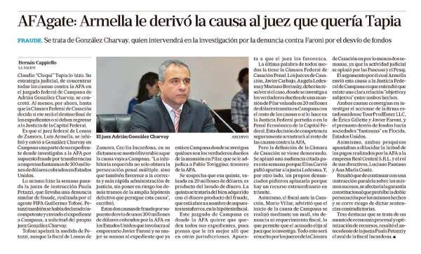 AFAgate: Armella le derivó la causa al juez que quería Tapia Hernán Cappiello FRAUDE. Se trata de González Charvay, quien intervendrá en la investigación por la denuncia contra Faroni por el desvío de fondos Hernán Cappiello LA NACION Claudio "Chiqui" Tapia lo hizo. Su estrategia judicial, de concentrar todas las causas contra la AFA en el juzgado federal de Campana de Adrián González Charvay, se concretó. Al menos, por ahora, hasta que la Cámara Federal de Casación decida si ese será el destino final de los expedientes o si deben regresar a la Justicia de la Capital Federal. Es que el juez federal de Lomas de Zamora, Luis Armella, se inhibió y envió a González Charvay en Campana una parte de su expediente donde investigaba a la AFA por supuesto fraude por transferencias a empresas fantasma de 300 millones de dólares cobrados en Estados Unidos. Lo mismo hizo la semana pasada la jueza de instrucción Paula Petazzi, que llevaba una denuncia similar de fraude, realizada por el agente FIFA Guillermo Tofoni. Petazzi también se había declarado incompetente y envió el expediente a Campana, a solicitud del propio juez González Charvay. Tofoni apelará la medida de Petazzi, aunque la fiscal de Lomas de Zamora, Cecilia Incardona, en su dictamen se mostró favorable a que la causa vaya a Campana. "La inhibitoria requerida no solo obtura la persecución penal múltiple, sino que también favorece a la correcta y más rápida administración de justicia, sin poner en riesgo los demás tramos de la amplia hipótesis delictiva que persigue esta causa", escribió. Estas dos causas de fraude por supuesto desvío de unos 300 millones de dólares cobrados por la AFA en los Estados Unidos que involucra al empresario Javier Faroni y su mujer se suman al expediente que ya El juez Adrián González Charvay ARCHIVO está en Campana donde se averigua quiénes son los verdaderos dueños de la mansión en Pilar, que se le adjudica a Pablo Toviggino, tesorero de la AFA. Se sospecha que esa quinta, valuada en 20 millones de dólares, es producto del lavado de dinero. La quinta se trataría del bien adquirido con el dinero producto del fraude, que está ahora a nombre de supuestostestaferros, en la hipótesis fiscal. Este juzgado de Campana es donde la AFA quiere que queden todos sus expedientes, pues piensa que le irá mejor allí que en otras jurisdicciones. Apuesta a que el juez los favorezca. La última palabra de todos modos la tiene la Cámara Federal de Casación Penal. Los jueces de Casación, Javier Carbajo, Angela Ledesma y Mariano Borinsky, deberán resolver si el caso, donde se investiga a los verdaderos dueños de una mansión de Pilar valuada en 20 millones de dólares tramita en Campana con el resto de las causas o si lo hace en la Justicia Federal porteña o en lo Penal Económico de la Capital Federal. Esta decisión de competencia seguramente arrastrará al resto de las causas contra la AFA. Pero la definición de la Cámara de Casación se viene demorando. Se aplazó una audiencia citada para esta semana porque Elisa Carrió pidió apartar a la jueza Ledesma. Y, por otro lado, los propios denunciados pidieron aplazarla porque hay un recurso extraordinario de trámite. Asimismo, el fiscal ante la Casación, Mario Villar, advirtió que el inicio de la causa de Campana se realizó mediante un mail, sin denuncia ni requerimiento fiscal, lo que permite que el acusado elija al juez que lo investiga. Todo esto será resuelto por los jueces de la Cámara de Casación en por lo menos dos semanas, ya que la actividad judicial se aplazó por las Pascuas y el Pesaj. El argumento por el cual Armella envió esta causa a la Justicia Federal de Campana es que entendió que existe una clara relación "objetiva y subjetiva" entre ambos hechos. Ambas causas convergían en investigar el accionar de la firma estadounidense TourProdEnter LLC, de Érica Gillette y Javier Faroni, y el presunto desvío de fondos hacia sociedades "fantasma" en Florida, Estados Unidos. Asimismo, ambas pesquisas apuntaban a dilucidar la licitud de los pagos realizados por la AFA a la empresa Real Central S.R.L. y el rol de sus directivos, Luciano Pantano y Ana María Conte. Resaltó que de continuar con una instrucción paralela sobre los mismos sucesos, se afectaría la garantía constitucional que prohíbe la doble persecución por los mismos hechos y se corre riesgo de dictar sentencias contradictorias. Tras destacar que se trata de un asunto de economía procesal y optimización de recursos, resaltó el antecedente de la jueza Paula Petazzi y el aval de la fiscal Incardona. Menciones: Adrián González Charvay, Luis Armella, Paula Petazzi, Cecilia Incardona, Javier Carbajo, Angela Ledesma, Mariano Borinsky, Elisa Carrió, Mario Villar, Érica Gillette, Javier Faroni, Luciano Pantano, Ana María Conte, AFA, Cámara Federal de Casación, Juzgado federal de Campana, Justicia de la Capital Federal, Cámara Federal, TourProdEnter LLC, Real Central S.R.L., Estados Unidos, Florida, Pilar, Campana