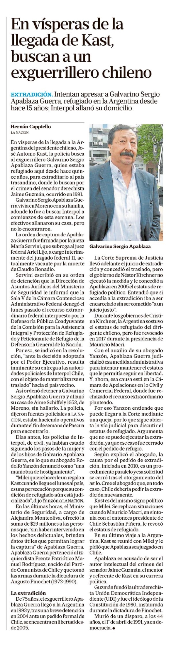 En vísperas de la llegada de Kast, buscan a un exguerrillero chileno Hernán Cappiello EXTRADICIÓN. Intentan apresar a Galvarino Sergio Apablaza Guerra, refugiado en la Argentina desde hace 15 años; Interpol allanó su domicilio. Hernán Cappiello LA NACION En vísperas de la llegada a la Argentina del presidente chileno, José Antonio Kast, la policía busca al exguerrillero Galvarino Sergio Apablaza Guerra, quien estaba "refugiado aquí desde hace quince años, para extraditarlo al país trasandino, donde lo buscan por el crimen del senador derechista Jaime Guzmán, ocurrido en 1991. Galvarino Sergio Apablaza Guerra vivía en Moreno con su familia, adonde lo fue a buscar Interpol a comienzos de esta semana. Los efectivos allanaron su casa, pero no lo encontraron. La orden de captura de Apablaza Guerra fue firmada por la jueza María Servini, que subroga al juez federal Ariel Lijo, a cargo interinamente del juzgado federal 11, actualmente vacante por la muerte de Claudio Bonadio. Servini escribió en su orden de detención que la Dirección de Asuntos Jurídicos del Ministerio de Seguridad le informó que la Sala V de la Cámara Contencioso Administrativo Federal denegó el lunes pasado el recurso extraordinario federal interpuesto por la Defensoría Pública Coadyuvante de la Comisión para la Asistencia Integral y Protección de Refugio y Peticionante de Refugio de la Defensoría General de la Nación. Por eso, se indicó en la resolución, "ante la decisión adoptada por el Poder Ejecutivo, resulta inminente su entrega a las autoridades policiales de Interpol Chile, con el objeto de materializarse su traslado" hacia el país vecino. Así ordenó detener a Galvarino Sergio Apablaza Guerra y allanó su casa de Aime Schifffely 1653, de Moreno, sin hallarlo. La policía, dijeron fuentes policiales a LA NACION, estaba haciendo operativos durante el fin de semana de Pascua para encontrarlo. Días antes, los policías de Interpol, de civil, ya habían estado siguiendo los pasos de la mujer y de los hijos de Galvario Apablaza Guerra, en lo que su abogado Rodolfo Yanzón denunció como "una maniobra de hostigamiento". "Milei quiere hacerle un regalo a Kast cuando llegue el lunes al país, es una persecución porque su condición de refugiado aún está judicializada", dijo Yanzón a LANACION. En las últimas horas, el Ministerio de Seguridad, a cargo de Alejandra Monteoliva, ofreció la suma de $29 millones a las personas que, "sin haber intervenido en los hechos delictuales, brinden datos útiles que permitan lograr la captura" de Apablaza Guerra. Apablaza Guerra perteneció al izquierdista Frente Patriótico Manuel Rodríguez, nacido del Partido Comunista de Chile y que tomó las armas durante la dictadura de Augusto Pinochet (1973-1990). La extradición De 75 años, el exguerrillero Apablaza Guerra llegó a la Argentina en 1993 y, tras una breve detención en 2004 ante un pedido formal de Chile, se encuentra en libertad desde 2005. Galvarino Sergio Apablaza La Corte Suprema de Justicia llevó adelante el juicio de extradición y concedió el traslado, pero el gobierno de Néstor Kirchner no ejecutó la medida y le concedió a Apablaza en 2005 el estatus de "refugiado político". Entendió que si accedía a la extradición iba a ser "encarcelado sin ser "cometido "a un juicio justo". Durante los gobiernos de Cristina Kirchner, la Argentina sostuvo el estatus de refugiado del dirigente chileno, pero fue revocado en 2017 durante la presidencia de Mauricio Macri. Con el auxilio de su abogado Yanzón, Apablaza Guerra judicializó esa medida administrativa para intentar mantener el estatus que le permitía seguir en libertad. Y, ahora, esa causa está en la Cámara de Apelaciones en lo Civil y Comercial Federal, donde fue rechazado el recurso extraordinario planteado. Por eso Yanzon entiende que puede llegar a la Corte mediante una queja, por lo que sigue abierta la vía judicial para discutir el estatus de refugiado. Argumenta que no se puede ejecutar la extradición, ya que ese caso fue cerrado con el pedido de refugio. Según explicó el abogado, la causa por el pedido de extradición, iniciada en 2010, es un "procedimiento paralelo y esa solicitud se cerró tras el otorgamiento de asilo". Cree el abogado que, en todo caso, Chile debería pedir la extradición nuevamente. Kast es del mismo signo político que Milei. Se replican situaciones cuando Mauricio Macri, en sintonía con el entonces presidente de Chile Sebastián Piñera, le revocó el estatus de refugiado. En su último viaje a la Argentina, Kast se reunió con Milei y le pidió que Apablaza sea juzgado en Chile. Apablaza es acusado de ser el autor intelectual del crimen del senador Jaime Guzmán, el mentor y referente de Kast en su carrera política. Guzmán fundó la ultraderechista Unión Democrática Independiente (UDI) y fue el ideólogo de la Constitución de 1980, instaurada durante la dictadura de Pinochet. Murió de un disparo, a los 44 años, el 1" de abril de 1991, ya en democracia. Menciones: Galvarino Sergio Apablaza Guerra, José Antonio Kast, Interpol, Jaime Guzmán, María Servini, Ariel Lijo, Claudio Bonadio, Néstor Kirchner, Cristina Kirchner, Mauricio Macri, Rodolfo Yanzón, Alejandra Monteoliva, Frente Patriótico Manuel Rodríguez, Partido Comunista de Chile, Augusto Pinochet, Corte Suprema de Justicia, Cámara de Apelaciones en lo Civil y Comercial Federal, Sebastián Piñera, Javier Milei, Unión Democrática Independiente (UDI)