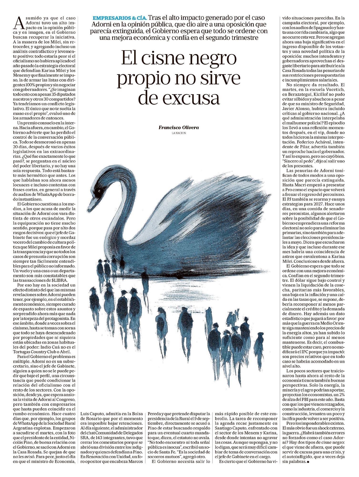 El cisne negro propio no sirve de excusa Francisco Olivera sumido ya que el caso Adorni tuvo un alto impacto en la opinión pública y en imagen, en el Gobierno buscan recuperar la iniciativa. A la manera de los Milei, sin retroceder, y agregando incluso un análisis contrafáctico y levemente positivo: todo estaría peor si el oficialismo no hubiera aplicado el año pasado la estrategia electoral que defendían Karina Milei y los Menem y que finalmente se impuso, la de armar las listas con dirigentes 100% propios y sin negociar con gobernadores. “¿Se imagina todo esto con apenas 35 diputados nuestros y otros 30 compartidos? Ya tendríamos un conflicto legislativo. El único que no te suelta la mano es el propio”, evaluó uno de los armadores de entonces. Un premio consuelo en la interna. Hacia afuera, en cambio, el Gobierno advierte que ha perdido el control de la conversación pública. Todo se desmoronó en apenas 20 días, después de varios éxitos legislativos en las extraordinarias. ¿Qué fue exactamente lo que pasó?, se preguntan en el núcleo del poder libertario, y no hay una sola respuesta. Todo está bastante más hermético que antes. Lo que hablaban son ahora menos locuaces e incluso contestan con frases cortas, en general a través de audios de WhatsApp de borrado instantáneo. El Gobierno cuestiona a los medios, a los que acusa de medir la situación de Adorni con vara distinta de otros escándalos. Pero la equiparación no tiene mucho sentido, porque pasa por alto dos rasgos decisivos: que el jefe de Gabinete fue un enérgico y mordaz vocero del cambio de cultura política que Milei proponía en favor de la transparencia y que no todos los casos de presunta corrupción son siempre tan fácilmente entendibles para el público no informado. Un vuelo y una casa o un departamento son más constatables que las transacciones de $LIBRA. Por eso hay en la sociedad un efecto distinto del que las mismas revelaciones sobre Adorni pueden tener, por ejemplo, en el establishment económico, siempre curado de espanto sobre estos asuntos y sorprendido ahora más que nada por la torpeza del protagonista. En ese ámbito, donde a veces sobra el cinismo, hasta se toman con sorna que todo se haya desencadenado por propiedades que ni siquiera están ubicadas en zonas habituales del poder: Indio Cuá no es el Tortugas Country Club o Abril. Para el Gobierno el problema es múltiple. Adorni no es un subsecretario, sino el jefe de Gabinete, alguien a quien no se le puede pedir que baje el perfil, una circunstancia que puede condicionar la relación del oficialismo con el resto de los sectores. Con la oposición, desde ya, que espera ansiosa la visita de Adorni al Congreso, pero también con empresarios que hasta pueden coincidir en el rumbo económico. Hace cuatro días que, por ejemplo, los grupos de WhatsApp de la Sociedad Rural Argentina explotan. Empezaron a sacudirse el martes, con la foto que el presidente de la entidad, Nicolás Pino, de buena relación con el Gobierno, se sacó con Adorni en la Casa Rosada. Se quejan de que no les avisó. Para peor, justo el día en que el ministro de Economía, EMPRESARIOS & CÍA. Tras el alto impacto generado por el caso Adorni en la opinión pública, que dio aire a una oposición que parecía extinguida, el Gobierno espera que todo se ordene con una mejora económica y confía en el segundo trimestre. El cisne negro propio no sirve de excusa Francisco Olivera LANACION Luis Caputo, admitía en la Bolsa de Rosario que por el momento era imposible bajar retenciones. Al día siguiente, el administrador del chat Comunidad de Delegados SRA, de 143 integrantes, tuvo que cerrar los comentarios porque se abrió una división entre los indignados y quienes defendían a Pino. En Renovación con Unidad, un foro opositor que encabeza Marcos Pereda y que pretende disputar la presidencia de la Rural el 9 de septiembre, directamente se acusó a Pino de estar buscando respaldar para un eventual cuarto mandato que, dicen, el estatuto no avala. “No todo encuentro ni toda seña pública es inocua”, escribió un socio de Santa Fe. “Es la sociedad de socorros mutuos”, agregó Otro. El Gobierno necesita salir lo más rápido posible de este embrollo. La tarea de recomponer la agenda recae justamente en Santiago Caputo, enfrentado con el sector de los Menem y Karina, desde donde intentan no agravar las cosas. Aunque supongan, y no lo digan, que será muy difícil cambiar de tema de conversación con el jefe de Gabinete en el cargo. Es cierto que el Gobierno ha vi- vido situaciones parecidas. En la campaña electoral, por ejemplo, con los audios de Spagnuolo y hasta una corrida cambiaria, algo que no ocurre esta vez. Pero se agrega ahora una baja significativa en el ingreso disponible de los votantes y una novedad política de la oposición: muchos intendentes y gobernadores aprovechan el desgastelibertario para atribuirle a la Casa Rosada todas las penurias de sus restricciones presupuestarias e incumplimientos salariales. No siempre da resultado. El martes, en la escuela Vucetich, en Berazategui, Kicillof no pudo evitar silbidos y abucheos a pesar de que su ministro de Seguridad, Javier Alonso, hubiera incluido críticas al gobierno nacional. ¿A qué administración interpelaba el malhumor policial? El episodio los llevó a una reflexión momentos después, en el vip, donde no todos hicieron la misma interpretación. Federico Achával, intendente de Pilar, advertía también un reproche hacia el gobernador. Y así lo expuso, pero no cayó bien. “Sincero al pedo”, dijo al salir uno de los presentes. Las penurias de Adorni tonifican de todos modos a una oposición que parecía extinguida. Hasta Macri empezó a presentar a Pro como el espacio que volverá a frenar el regreso del peronismo. El PJ también se rearma y ensaya estrategias para 2027. Hace unos días, en una comida de senadores peronistas, algunos alertaron sobre la posibilidad de que el Gobierno
