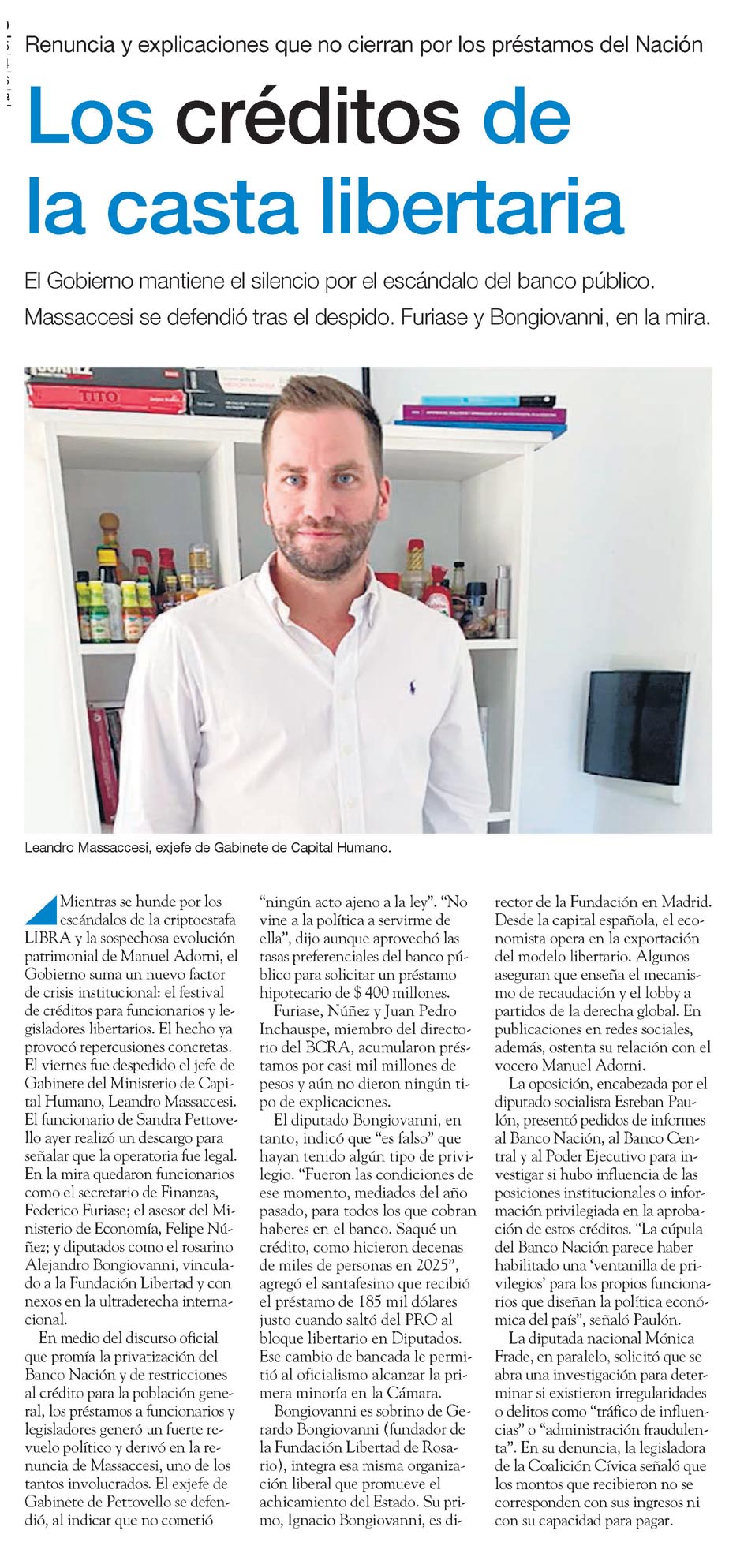 Los créditos de la casta libertaria Renuncia y explicaciones que no cierran por los préstamos del Nación Los créditos de la casta libertaria El Gobierno mantiene el silencio por el escándalo del banco público. Massaccesi se defendió tras el despido. Furiase y Bongiovanni, en la mira. Leandro Massaccesi, exjefe de Gabinete de Capital Humano. Mientras se hunde por los escándalos de la criptocstafa LIBRA y la sospechosa evolución patrimonial de Manuel Adorni, el Gobierno suma un nuevo factor de crisis institucional: el festival de créditos para funcionarios y legisladores libertarios. El hecho provocó repercusiones concretas. El viernes fue despedido el jefe de Gabinete del Ministerio de Capital Humano, Leandro Massaccesi. El funcionario de Sandra Pettovello ayer realizó un descargo para señalar que la operatoria fue legal. En la mira quedaron funcionarios como el secretario de Finanzas, Federico Furiase; el asesor del Ministerio de Economía, Felipe Núñez; y diputados como el rosarino Alejandro Bongiovanni, vinculado a la Fundación Libertad y con nexos en la ultraderecha internacional. En medio del discurso oficial que promía la privatización del Banco Nación y de restricciones al crédito para la población general, los préstamos a funcionarios y legisladores generó un fuerte revuelo político y derivó en la renuncia de Massaccesi, uno de los tantos involucrados. El exjefe de Gabinete de Pettovello se defendió, al indicar que no cometió "ningún acto ajeno a la ley". "No vine a la política a servirme de ella", dijo aunque aprovechó las tasas preferenciales del banco público para solicitar un préstamo hipotecario de $ 400 millones. Furiase, Núñez y Juan Pedro Inchauspe, miembro del directorio del BCRA, acumularon préstamos por casi mil millones de pesos y aún no dieron ningún tipo de explicaciones. El diputado Bongiovanni, en tanto, indicó que "es falso" que hayan tenido algún tipo de privilegio. "Fueron las condiciones de ese momento, mediados del año pasado, para todos los que cobran haberes en el banco. Saqué un crédito, como hicieron decenas de miles de personas en 2025", agregó el santafesino que recibió el préstamo de 185 mil dólares justo cuando saltó del PRO al bloque libertario en Diputados. Ese cambio de bancada le permitió al oficialismo alcanzar la primera minoría en la Cámara. Bongiovanni es sobrino de Gerardo Bongiovanni (fundador de la Fundación Libertad de Rosario), integra esa misma organización liberal que promueve el achicamiento del Estado. Su primo, Ignacio Bongiovanni, es director de la Fundación en Madrid. Desde la capital española, el economista opera en la exportación del modelo libertario. Algunos aseguran que enseña el mecanismo de recaudación y el lobby en partidos de la derecha global. En publicaciones en redes sociales, además, ostenta su relación con el vocero Manuel Adorni. La oposición, encabezada por el diputado socialista Esteban Paulón, presentó pedidos de informes al Banco Nación, al Banco Central y al Poder Ejecutivo para investigar si hubo influencia de las posiciones institucionales o información privilegiada en la aprobación de estos créditos. "La cúpula del Banco Nación parece haber habilitado una "ventanilla de privilegios' para los propios funcionarios que diseñan la política económica del país", señaló Paulón. La diputada nacional Mónica Frade, en paralelo, solicitó que se abra una investigación para determinar si existieron irregularidades o delitos como "tráfico de influencias" o "administración fraudulenta". En su denuncia, la legisladora de la Coalición Cívica señaló que los montos que recibieron no se corresponden con sus ingresos ni con su capacidad para pagar. Menciones: cpol2 ejesapp