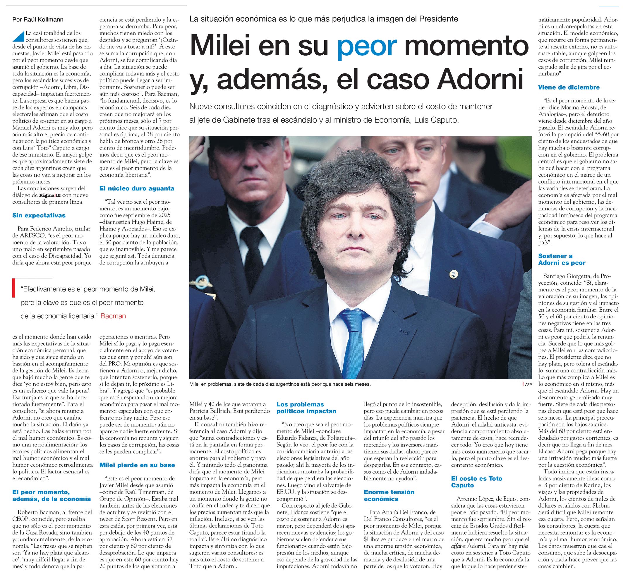 Milei en su peor momento, además, el caso Adorni Raúl Kollmann La situación económica es lo que más perjudica la imagen del Presidente Milei en su peor momento, además, el caso Adorni Nueve consultores coinciden en el diagnóstico y advierten sobre el costo de mantener al jefe de Gabinete tras el escándalo y al ministro de Economía, Luis Caputo. Milei en problemas, siete de cada diez argentinos está peor que hace seis meses. Por Raúl Kollmann La casi totalidad de los consultores sostienen que, desde el punto de vista de las encuestas, Javier Milei está pasando por el peor momento desde que asumió el gobierno. La base de toda la situación es la economía, pero los escándalos sucesivos de corrupción -Adorni, Libra, Discapacidad- impactan fuertemente. La sorpresa es que buena parte de los expertos en campañas electorales afirman que el costo político de sostener en su cargo a Manuel Adorni es muy alto, pero aún más alto el precio de continuar con la política económica con Luis "Toto" Caputo a cargo de ese ministerio. El mayor golpe es que aproximadamente siete de cada diez argentinos creen que las cosas no van a mejorar en los próximos meses. Las conclusiones surgen del diálogo de PáginaI2 con nueve consultores de primera línea. Sin expectativas Para Federico Aurelio, titular de ARESCO, "es el peor momento de la valoración. Tuvo uno malo en septiembre pasado con el caso de Discapacidad. Yo diría que ahora está peor porque ciencia se está perdiendo y la esperanza se derrumba. Para peor, muchos tienen miedo con lo despidos y se preguntan "¿Cuándo me va a tocar a mí?". A esto se suma la corrupción que, con Adorni, se fue complicando día a día. La situación se puede complicar todavía más y el costo político puede llegar a ser importante. Sostenerlo puede ser aún más costoso". Para Bacman, "lo fundamental, decisivo, es lo económico. Seis de cada diez creen que no mejorará en los próximos meses, sólo el 7 por ciento dice que su situación personal es óptima, el 38 por ciento habla de bronca y otro 26 por ciento de incertidumbre. Podemos decir que es el peor momento de Milei, pero la clave es que es el peor momento de la economía libertaria". El núcleo duro aguanta "Tal vez no sea el peor momento, es un momento bajo, como fue septiembre de 2025 -diagnostica Hugo Haime, de Haime y Asociados-. Eso se explica porque hay un núcleo duro, el 30 por ciento de la población, que es inamovible. Y me parece que seguirá así. Toda denuncia de corrupción la atribuyen a "Efectivamente es el peor momento de Milei, pero la clave es que es el peor momento de la economía libertaria." Bacman es el momento donde han caído más las expectativas de la situación económica personal, que ha sido y que sigue siendo una gestión en el acompañamiento de la gestión de Milei. Es decir, que bajó mucho la gente que te dice ‘yo no estoy bien, pero esto es un esfuerzo que vale la pena’. Esa franja es la que se ha deteriorado fuertemente". Para el consultor, "si ahora renuncia Adorni, no creo que cambie mucho la situación. El daño ya está hecho. Las balas entran por el mal humor económico. Es como una retroalimentación: los errores políticos alimentan el mal humor económico y el mal humor económico retroalimenta lo político. El factor esencial es el económico". El peor momento, además, de la economía Roberto Bacman, al frente del CEOF, coincide, pero analiza que no sólo es el peor momento de la Casa Rosada, sino también y, fundamentalmente, de la economía. "Las frases que se repiten son ‘Ya no hay plata que alcance’, ‘muy difícil llegar a fin de mes’ y todo denota que la pa- operaciones o mentiras. Pero Milei sí lo paga y lo paga esencialmente en el apoyo de votantes que eran y por ahí aún son del PRO. Mi opinión es que sostienen a Adorni o, mejor dicho, que intentan sostenerlo, porque si lo dejan ir, lo próximo es $Libra". Y agregó que "es probable que estén esperando una mejora económica para pasar el mal momento: especulan con que enfrente no hay nadie. Pero eso puede ser de momento: aún no aparece nadie fuerte enfrente. Si la economía no repunta y siguen los casos de corrupción, las cosas se les pueden complicar". Milei pierde en su base "Este es el peor momento de Javier Milei desde que asumió -coincide Raúl Timerman, de Grupo de Opinión-. Estaba mal también antes de las elecciones de octubre y se revirtió con el tweet de Scott Bessent. Pero en esta caída, por primera vez, está por debajo de los 40 puntos de aprobación. Ahora está en 37 por ciento y 60 por ciento de desaprobación. Lo que impacta es que en este 60 por ciento hay 20 puntos de los que votaron a Milei y 40 de los que votaron a Patricia Bullrich. Está perdiendo en su base". El consultor también hizo referencia al caso Adorni y dijo que "suma contradicciones y es tá en la pantalla en forma permanente. El costo político es enorme para el gobierno y para él. Y mirando todo el panorama diría que el momento de Milei impacta en la economía, pero más impacta la economía en el momento de Milei. Llegamos a un momento donde la gente no confía en el Indec y te dicen que los precios aumentan más que la inflación. Incluso, si se ven las últimas declaraciones de Toto Caputo, parece estar tirando la toalla". Este último diagnóstico impacta y sintoniza con lo que sugieren varios consultores: es más alto el costo de sostener a Toto que a Adorni. Los problemas políticos impactan "No creo que sea el peor momento de Milei -concluye Eduardo Fidanza, de Poliarquía-. Según lo veo, el peor fue con la corrida cambiaria anterior a las elecciones legislativas del año pasado; ahí la mayoría de los indicadores mostraba la probabilidad de que perdiera las elecciones. Luego vino el salvataje de EE.UU. y la situación se descomprimió". Con respecto al jefe de Gabinete, Fidanza sostiene "que el costo de sostener a Adorni es mayor, pero dependerá de si aparecen nuevas 