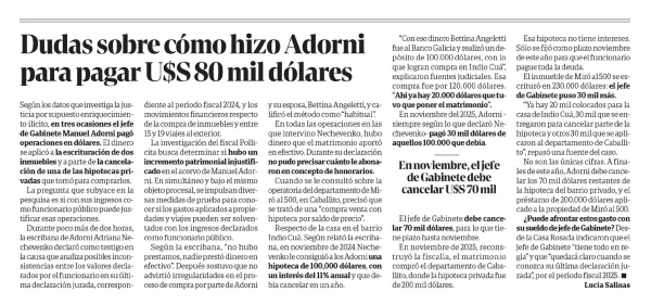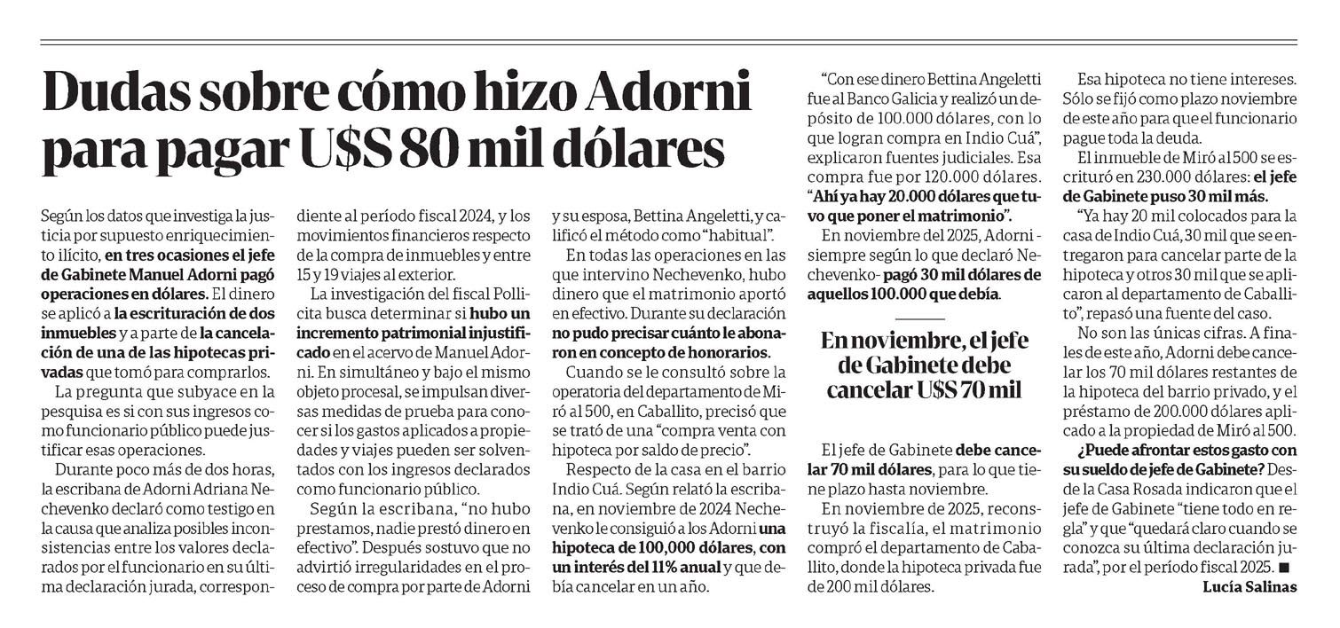 Dudas sobre cómo hizo Adorni para pagar U$S 80 mil dólares Lucía Salinas Según los datos que investiga la justicia por supuesto enriquecimiento ilícito, en tres ocasiones el jefe de Gabinete Manuel Adorni pagó operaciones en dólares. El dinero se aplicó a la escrituración de dos inmuebles y a parte de la cancelación de una de las hipotecas privadas que tomó para comprarlos. La pregunta que subyace en la pesquisa es si con sus ingresos como funcionario público puede justificar esas operaciones. Durante poco más de dos horas, la escribana de Adorni Adriana Nechevenko declaró como testigo en la causa que analiza posibles inconsistencias entre los valores declarados por el funcionario en su última declaración jurada, correspondiente al período fiscal 2024, y los movimientos financieros respecto a la compra de inmuebles y entre 15 y 19 viajes al exterior. La investigación del fiscal Pollicita busca determinar si hubo un incremento patrimonial injustificado en el acervo de Manuel Adorni. En simultáneo y bajo el mismo objeto procesal, se impulsan diversas medidas de prueba para conocer si los gastos aplicados a propiedades y viajes pueden ser solventados con los ingresos declarados como funcionario público. Según la escribana, “no hubo prestamos, nadie prestó dinero en efectivo”. Después sostuvo que no advirtió irregularidades en el proceso de compra por parte de Adorni y su esposa, Bettina Angeletti, y calificó el método como “habitual”. En todas las operaciones en las que intervino Nechevenko, hubo dinero que el matrimonio aportó en efectivo. Durante su declaración no pudo precisar cuánto le abonaron en concepto de honorarios. Cuando se le consultó sobre la operatoria del departamento de Miró al 500, en Caballito, precisó que se trató de una “compra venta con hipoteca por saldo de precio”. Respecto de la casa en el barrio Indio Cuá. Según relató la escribana, en noviembre de 2024 Nechevenko le consiguió a los Adorni una hipoteca de 100.000 dólares, con interés del 11% anual y que debía cancelar en un año. "Con ese dinero Bettina Angeletti fue al Banco Galicia y realizó un depósito de 100.000 dólares, con lo que logran compra en Indio Cuá", explicaron fuentes judiciales. Esa compra fue por 120.000 dólares. "Ahí ya hay 20.000 dólares que tuvo que poner el matrimonio". En noviembre del 2025, Adorni, siempre según lo que declaró Nechevenko, pagó 30 mil dólares de aquellos 100.000 que debía. En noviembre, el jefe de Gabinete debe cancelar U$S 70 mil. El jefe de Gabinete debe cancelar 70 mil dólares, para lo que tiene plazo hasta noviembre. En noviembre de 2025, reconstruyó la fiscalía, el matrimonio compró el departamento de Caballito, donde la hipoteca privada fue de 200 mil dólares. Esa hipoteca no tiene intereses. Sólo se fijó como plazo noviembre de este año para que el funcionario pague toda la deuda. El inmueble de Miró al 500 se escrituró en 230.000 dólares: el jefe de Gabinete puso 30 mil más. "Ya hay 20 mil colocados para la casa de Indio Cuá, 30 mil que se entregaron para cancelar parte de la hipoteca y otros 30 mil que se aplicaron al departamento de Caballito", repasó una fuente del caso. No son las únicas cifras. A finales de este año, Adorni debe cancelar los 70 mil dólares restantes de la hipoteca del barrio privado, y el préstamo de 200.000 dólares aplicado a la propiedad de Miró al 500. ¿Puede afrontar estos gastos con su sueldo de jefe de Gabinete? Desde la Casa Rosada indicaron que el jefe de Gabinete “tiene todo en regla” y que “quedará claro cuando se conozca su última declaración jurada”, por el período fiscal 2025. Menciones: Manuel Adorni, Bettina Angeletti, Adriana Nechevenko, Banco Galicia, Indio Cuá, Caballito, Miró al 500, Casa Rosada, Lucía Salinas