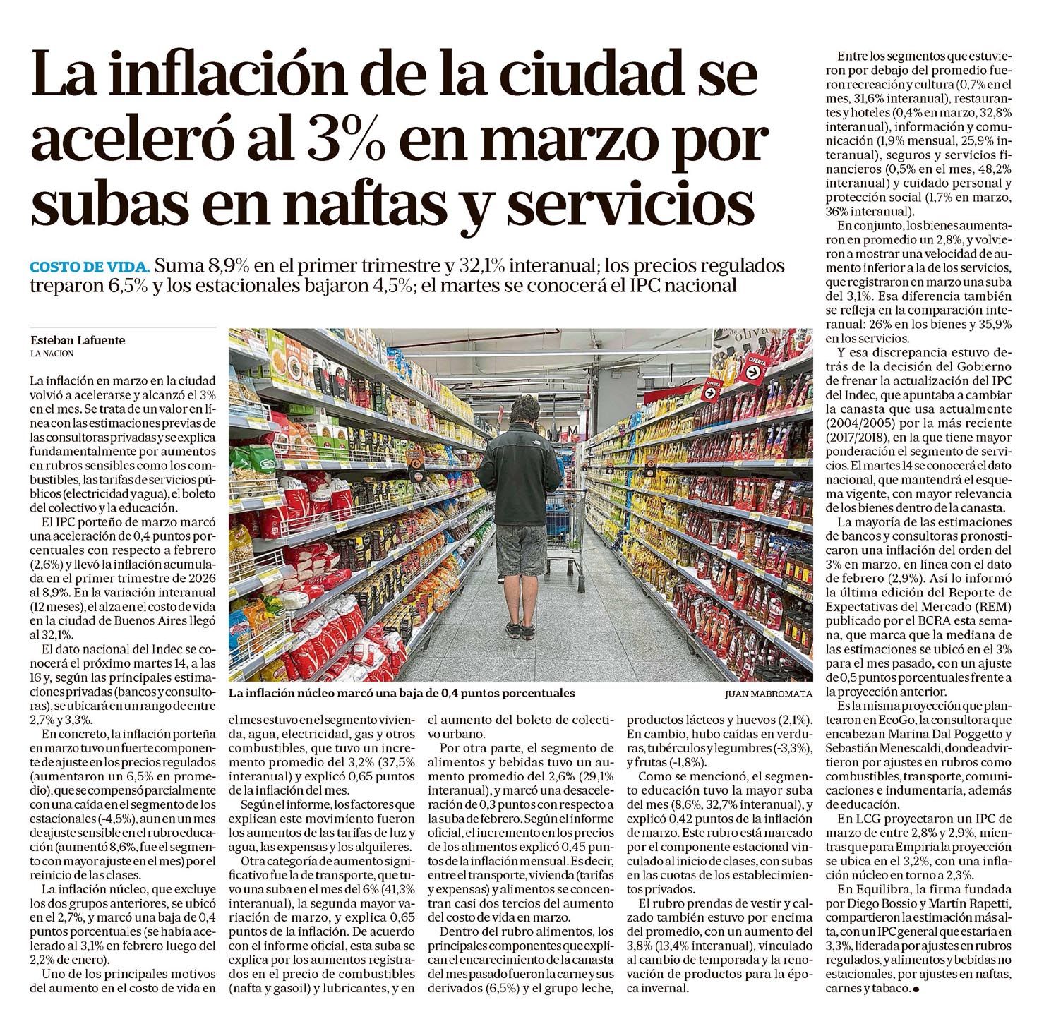 La inflación de la ciudad se aceleró al 3% en marzo por subas en naftas y servicios Esteban Lafuente La inflación en marzo en la ciudad volvió a acelerarse y alcanzó el 3% en el mes. Se trata de un valor en línea con las estimaciones previas de las consultoras privadas y se explica fundamentalmente por aumentos en rubros sensibles como los combustibles, las tarifas de servicios públicos (electricidad y agua), el boleto del colectivo y la educación. El IPC porteño de marzo marcó una aceleración de 0,4 puntos porcentuales con respecto a febrero (2,6%) y llevó la inflación acumulada en el primer trimestre de 2026 al 8,9%. En la variación interanual (12 meses), el alza en el costo de vida en la ciudad de Buenos Aires llegó al 32,1%. El dato nacional del Indec se conocerá el próximo martes 14, a las 16 y, según las principales estimaciones privadas (bancos y consultoras), se ubicará en un rango de entre 2,7% y 3,3%. En concreto, la inflación porteña en marzo tuvo un fuerte componente de ajuste en los precios regulados (aumentaron un 6,5% en promedio), que se compensó parcialmente con una caída en el segmento de los estacionales (-4,5%), aun en un mes de ajuste sensible en el rubro educación (aumentó 8,6%, fue el segmento con mayor ajuste en el mes) por el inicio de las clases. La inflación núcleo, que excluye los dos grupos anteriores, se ubicó en el 2,7%, y marcó una baja de 0,4 puntos porcentuales (se había acelerado al 3,1% en febrero luego del 2,2% de enero). Uno de los principales motivos del aumento en el costo de vida en el mes estuvo en el segmento vivienda, agua, electricidad, gas y otros combustibles, que tuvo un incremento promedio del 3,2% (37,5% interanual) y explicó 0,65 puntos de la inflación del mes. Según el informe, los factores que explican este movimiento fueron los aumentos de las tarifas de luz y agua, las expensas y los alquileres. Otra categoría de aumento significativo fue la de transporte, que tuvo una suba en el mes del 6% (41,3% interanual), la segunda mayor variación de marzo, y explica 0,65 puntos de la inflación. De acuerdo con el informe oficial, esta suba se explica por los aumentos registrados en el precio de combustibles (nafta y gasoil) y lubricantes, y en el aumento del boleto de colectivo urbano. Por otra parte, el segmento de alimentos y bebidas tuvo un aumento promedio del 2,6% (29,1% interanual), y marcó una desaceleración de 0,3 puntos con respecto a la suba de febrero. Según el informe oficial, el incremento en los precios de los alimentos explicó 0,45 puntos de la inflación mensual. Es decir, entre el transporte, vivienda (tarifas y expensas) y alimentos se concentran casi dos tercios del aumento del costo de vida en marzo. Dentro del rubro alimentos, los principales componentes que explican el encarecimiento de la canasta el mes pasado fueron la carne y sus derivados (6,5%) y el grupo leche, productos lácteos y huevos (2,1%). En cambio, hubo caídas en verduras, tubérculos y legumbres (-3,3%), y frutas (1,8%). Como se mencionó, el segmento educación tuvo la mayor suba el mes (8,6%, 32,7% interanual), y explicó 0,42 puntos de la inflación de marzo. Este rubro está marcado por el componente estacional vinculado al inicio de clases, con subas en las cuotas de los establecimientos privados. El rubro prendas de vestir y calzado también estuvo por encima del promedio, con un aumento del 3,8% (13,4% interanual), vinculado al cambio de temporada y la renovación de productos para la época invernal. Entre los segmentos que estuvieron por debajo del promedio fueron recreación y cultura (0,7% en el mes, 31,6% interanual), restaurantes y hoteles (0,4% en marzo, 32,8% interanual), información y comunicación (1,9% mensual, 25,9% interanual), seguros y servicios financieros (0,5% en el mes, 48,2% interanual) y cuidado personal y protección social (1,7% en marzo, 36% interanual). En conjunto, los bienes aumentaron en promedio un 2,8%, y volvieron a mostrar una velocidad de aumento inferior a la de los servicios, que registraron en marzo una suba del 3,1%. Esa diferencia también se refleja en la comparación interanual: 26% en los bienes y 35,9% en los servicios. Y esa discrepancia estuvo detrás de la decisión del Gobierno de frenar la actualización del IPC del Indec, que apuntaba a cambiar la canasta que usa actualmente (2004/2005) por la más reciente (2017/2018), en la que tiene mayor ponderación el segmento de servicios. El martes 14 se conocerá el dato nacional, que mantendrá el esquema vigente, con mayor relevancia de los bienes dentro de la canasta. La mayoría de las estimaciones de bancos y consultoras pronosticaron una inflación del orden del 3% en marzo, en línea con el dato de febrero (2,9%). Así lo informó la última edición del Reporte de Expectativas del Mercado (REM) publicado por el BCRA esta semana, que marca que la mediana de las estimaciones se ubicó en el 3% para el mes pasado, con un ajuste de 0,5 puntos porcentuales frente a la proyección anterior. Es la misma proyección que plantearon en EcoGo, la consultora que encabezan Marina Dal Poggetto y Sebastián Menescaldi, donde advirtieron por ajustes en rubros como combustibles, transporte, comunicaciones e indumentaria, además de educación. En LCG proyectaron un IPC de marzo de entre 2,8% y 2,9%, mientras que para Empiria la proyección se ubica en el 3,2%, con una inflación núcleo en torno a 2,3%. En Equilibra, la firma fundada por Diego Bossio y Martín Rapetti, compartieron la estimación más alta, con un IPC general que estaría en 3,3% liderada por ajustes en rubros regulados, y alimentos y bebidas no estacionales, por ajustes en naftas, carnes y tabaco. Menciones: Ceco1 cfinanE ejesapp cnot