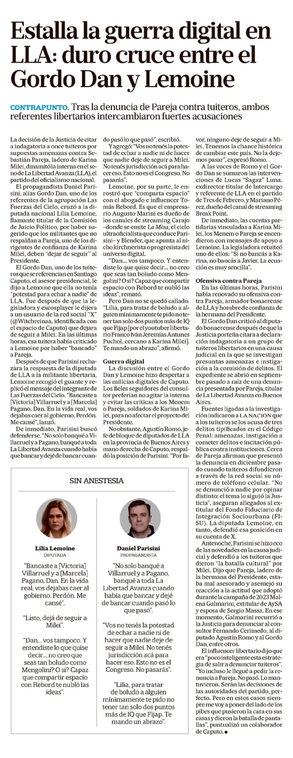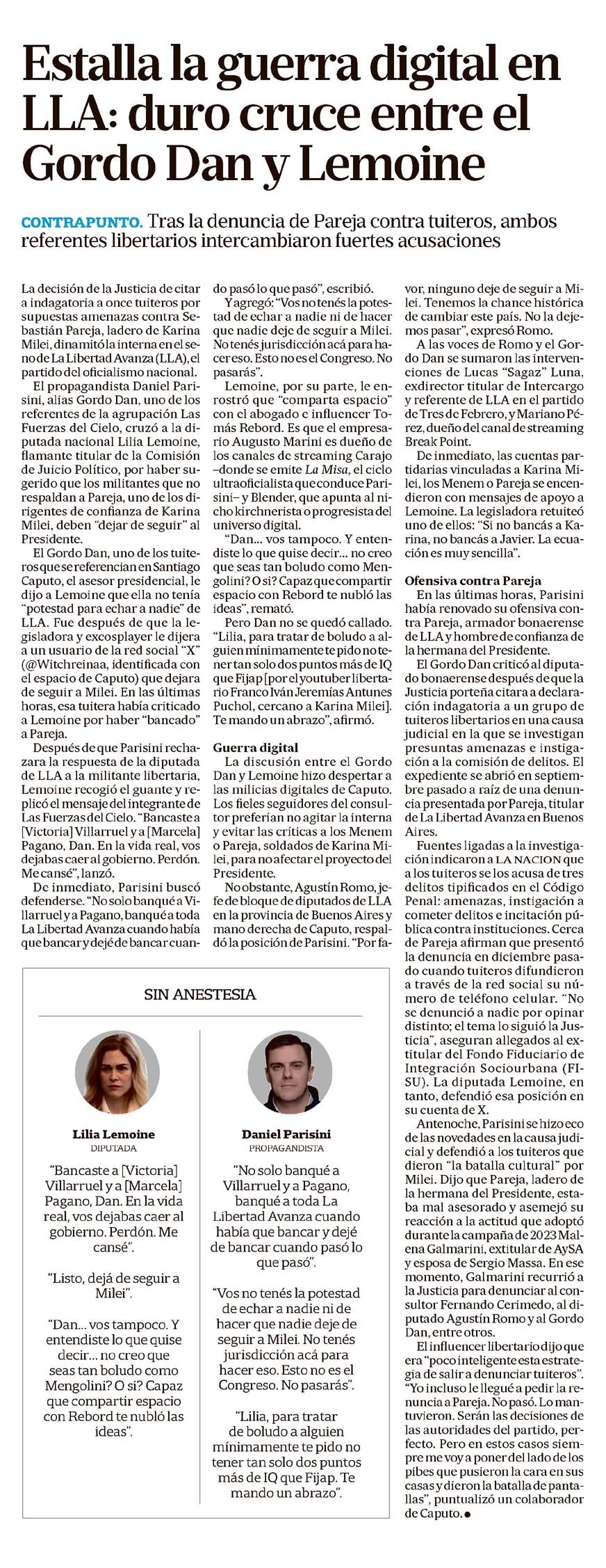 Estalla la guerra digital en LLA: duro cruce entre el Gordo Dan y Lemoine CONTRAPUNTO. Tras la denuncia de Pareja contra tuiteros, ambos referentes libertarios intercambiaron fuertes acusaciones. La decisión de la Justicia de citar a indagatoria a once tuiteros por supuestas amenazas contra Sebastián Pareja, ladero de Karina Milei, dinamitó la interna en el seno de La Libertad Avanza (LLA), el partido del oficialismo nacional. El propagandista Daniel Parisini, alias Gordo Dan, uno de los referentes de la agrupación Las Fuerzas del Cielo, cruzó a la diputada nacional Lilia Lemoine, flamante titular de la Comisión de Juicio Político, por haber sugerido que los militantes que no respaldan a Pareja, uno de los dirigentes de confianza de Karina Milei, deben “dejar de seguir” al Presidente. El Gordo Dan, uno de los tuiteros que se referencian en Santiago Caputo, el asesor presidencial, le dijo a Lemoine que ella no tenía “potestad para echar a nadie” de LLA. Fue después de que la legisladora y excosplayer le dijera a un usuario de la red social “X” (@Witchreinaa, identificada con el espacio de Caputo) que dejara de seguir a Milei. En las últimas horas, esa tuitera había criticado a Lemoine por haber “bancado” a Pareja. Después de que Parisini rechazara la respuesta de la diputada de LLA a la militante libertaria, Lemoine recogió el guante y replicó el mensaje del integrante de Las Fuerzas del Cielo. “Bancaste a [Victoria] Villarruel y a [Marcela] Pagano, Dan. En la vida real, vos dejabas caer al gobierno. Perdón. Me cansé”, lanzó. De inmediato, Parisini buscó defenderse. “No solo banqué a Villarruel y a Pagano, banqué a toda La Libertad Avanza cuando había que bancar y dejé de bancar cuando pasó lo que pasó”, escribió. Y agregó: "Vos no tenés la potestad de echar a nadie ni de hacer que nadie deje de seguir a Milei. No tenés jurisdicción acá para hacer eso. Esto no es el Congreso. No pasarás”. Lemoine, por su parte, le enrostró que “comparta espacio” con el abogado e influencer Tomás Rebord. Es que el empresario Augusto Marini es dueño de los canales de streaming Carajo -donde se emite La Misa, el ciclo ultraoficialista que conduce Parisini- y Blender, que apunta al nicho kirchnerista o progresista del universo digital. “Dan... vos tampoco. Y entendiste lo que quise decir... no creo que seas tan boludo como Mengolini? O si? Capaz que compartir espacio con Rebord te nubló las ideas”, remató. Pero Dan no se quedó callado. “Lilia, para tratar de boludo a alguien mínimamente te pido no tener tan solo dos puntos más de IQ que Fijap [por el youtuber libertario Franco Iván Jeremías Antunes Puchol, cercano a Karina Milei]. Te mando un abrazo”, afirmó. Guerra digital La discusión entre el Gordo Dan y Lemoine hizo despertar a las milicias digitales de Caputo. Los fieles seguidores del consultor preferían no agitar la interna y evitar las críticas a los Menem o Pareja, soldados de Karina Milei, para no afectar el proyecto del Presidente. No obstante, Agustín Romo, jefe de bloque de diputados de LLA en la provincia de Buenos Aires y mano derecha de Caputo, respaldó la posición de Parisini. “Por favor, ninguno deje de seguir a Milei. Tenemos la chance histórica de cambiar este país. No la dejemos pasar”, expresó Romo. Alas voces de Romo y el Gordo Dan se sumaron las intervenciones de Lucas “Sagaz” Luna, exdirector titular de Íntercargo y referente de LLA en el partido de Tres de Febrero, y Mariano Pérez, dueño del canal de streaming Break Point. De inmediato, las cuentas partidarias vinculadas a Karina Milei, los Menem o Pareja se encendieron con mensajes de apoyo a Lemoine. La legisladora retuiteó uno de ellos: “Si no bancás a Karina, no bancás a Javier. La ecuación es muy sencilla”. Ofensiva contra Pareja En las últimas horas, Parisini había renovado su ofensiva contra Pareja, armador bonaerense de LLA y hombre de confianza de la hermana del Presidente. El Gordo Dan criticó al diputado bonaerense después de que la Justicia porteña citara a declaración indagatoria a un grupo de tuiteros libertarios en una causa judicial en la que se investigan presuntas amenazas e instigación a la comisión de delitos. El expediente se abrió en septiembre pasado a raíz de una denuncia presentada por Pareja, titular de La Libertad Avanza en Buenos Aires. Fuentes ligadas a la investigación indicaron a LA NACION que a los tuiteros se los acusa de tres delitos tipificados en el Código Penal: amenazas, instigación a cometer delitos e incitación pública contra instituciones. Cerca de Pareja afirman que presentó la denuncia en diciembre pasado cuando tuiteros difundieron a través de la red social su número de teléfono celular. “No se denunció a nadie por opinar distinto; el tema lo siguió la Justicia”, aseguran allegados al extitular del Fondo Fiduciario de Integración Sociourbana (FISU). La diputada Lemoine, en tanto, defendió esa posición en su cuenta de X. Antenoche, Parisini se hizo eco de las novedades en la causa judicial y defendió a los tuiteros que dieron “la batalla cultural” por Milei. Dijo que Pareja, ladero de la hermana del Presidente, estaba mal asesorado y asemejó su reacción a la actitud que adoptó durante la campaña de 2023 Malena Galmarini, extitular de AySA y esposa de Sergio Massa. En ese momento, Galmarini recurrió a la Justicia para denunciar al consultor Fernando Cerimedo, al diputado Agustín Romo y al Gordo Dan, entre otros. El influencer libertario dijo que era “poco inteligente esta estrategia de salir a denunciar tuiteros”. “Yo incluso le llegué a pedir la renuncia a Pareja. No pasó. Lo mantuvieron. Serán las decisiones de las autoridades del partido, perfecto. Pero en estos casos siempre me voy a poner del lado de los pibes que pusieron la cara en sus casas y dieron la batalla de pantallas”, puntualizó un colaborador de Caputo. Menciones: cpol1