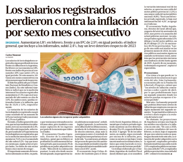 Los salarios registrados perdieron contra la inflación por sexto mes consecutivo Carlos Manzoni INGRESOS. Aumentaron 1,8% en febrero, frente a un IPC de 2,9% en igual período; el índice general, que incluye a los informales, subió 2,4%; hay un leve deterioro respecto de 2023. Carlos Manzoni LA NACION Los salarios de los trabajadores registrados siguen perdiendo terreno frente a la inflación en la Argentina. En febrero se incrementaron 1,8%, frente a un índice de precios al consumidor (IPC) que subió 2,9% en igual período. De esta manera, hilvanan seis meses consecutivos con alzas menores que las de los precios. El dato fue publicado por el Instituto Nacional de Estadística y Censos (Indec). En este informe también se indicó que en la medición interanual los salarios registrados aumentaron 27,5% y que en el acumulado del año suman un alza de 3,9%. En ambos casos, quedan retrasados frente a la inflación, que fue de 33,1% y 5,9%, respectivamente. La variación de los salarios de los trabajadores registrados surgió como resultado de un aumento de 1,6% en el sector privado y un avance de 2,3% en el público. En tanto, el índice general de salarios, que incluye también a los informales, tuvo un incremento de 2,4%. Esta cifra está impactada, sobre todo, por la suba de 4,6% que tuvieron los trabajadores no registrados, que en la medición interanual se incrementaron 75,1% y en el acumulado del año suben 9,2% —hay que tener en cuenta que, según aclara el propio Indec, los datos de este sector tienen cinco meses de rezago—. El importante aumento de los salarios informales se debe, en parte, a que venían muy retrasados en los últimos años, pero también a un mejor captación de los ingresos por parte de la encuesta que elaboró el Indec. El economista Claudio Caprarulo, director de la consultora Analytica, opinó que en febrero se profundizó la caída mensual del salario privado, que ya acumula 2% de pérdida en su poder adquisitivo en el año. "Más allá de la contracción puntual, la más alta desde marzo del año pasado, las perspectivas hacia adelante no mejoraron", señaló. Según Caprarulo, la aceleración de la inflación de los últimos meses, producto de la dinámica interna de shocks externos, aleja más la convergencia entre el resultado de las negociaciones paritarias y el costo de vida. "La contracara, producto del proceso de apreciación cambiaria, es que desde noviembre el poder de compra del salario medido en dólares creció 11%", acotó. El economista Jorge Colina, director del Instituto para el Desarrollo Social Argentino (Idesa), comentó que el salario privado registrado mantiene un leve deterioro, de entre 3% y 4%, respecto de finales de 2023. Y agregó: "El de los informales, en cambio, sigue creciendo por encima de la inflación, pero, como su salario es tan bajo y venían tan retrasado en los últimos años, lo único que están haciendo es recuperar un poco del terreno perdido". Un trabajo elaborado por el Instituto Argentino de Análisis Fiscal (Iaraf) destacó que, si se considera la variación interanual real de los salarios, se aprecian una caída del sector público provincial (-2,1%) y una mayor caída del sector público nacional (-8,8%). "En el caso del sector privado registrado, la baja real interanual fue del -4,1%", se agregó en el informe. El economista Nadin Argañaraz, director del Iaraf, afirmó que, respecto del nivel de noviembre de 2023, mes previo a la asunción del actual gobierno nacional, los salarios privados registrados están 3,5% debajo y los del sector público, un 18,3% debajo (37,2% los nacionales y 10,3% los provinciales). "Luego de una caída real similar en los primeros meses de 2024, los salarios públicos nacionales siguieron cayendo en términos reales, mientras que los provinciales iniciaron una tendencia alcista hasta agosto de 2025. A partir de ese momento, la desmejora es general", explicó el especialista. Proyecciones Con vistas a lo que puede ser la evolución de los salarios en lo que resta del año, Iván Cachanosky, economista jefe en la Fundación Libertad y Progreso, estimó que "los niveles de inflación comenzarían a ceder a partir de abril, por lo que probablemente haya un segundo semestre donde los salarios puedan recuperar el terreno perdido". Más aún, Cachanosky proyectó que podrían observarse niveles de inflación que empiecen con uno en algún momento del segundo semestre, "lo que también colaboraría a volver a darle respiro a la evolución del salario real". No obstante, las proyecciones de Argañaraz arrojan una baja de los sueldos con relación a la inflación en este año. "De cara a 2026, el arrastre estadístico del mes de febrero, es decir, bajo el supuesto de que esos salarios reales se mantengan durante todo este año, la situación del poder adquisitivo sería la siguiente: empleados privados formales tendrían una caída real de 2,9%; empleados públicos nacionales, una caída del 7,0%, y empleados públicos provinciales, una caída del 2,8%", estimó el economista. Menciones: Ceco1 cfinanE ejesapp cnot