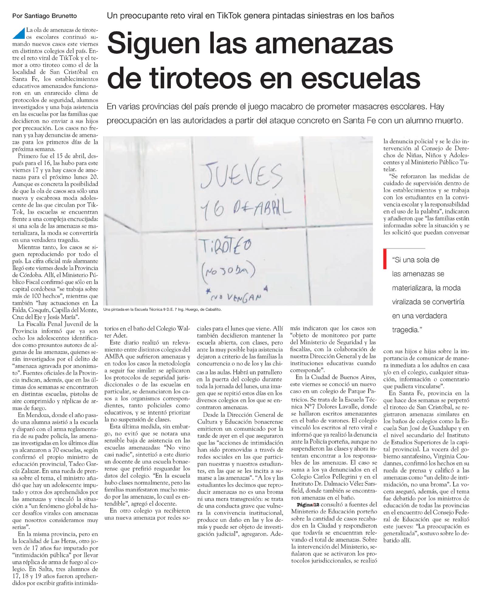 Siguen las amenazas de tiroteos en escuelas Santiago Brunetto Por Santiago Brunetto La ola de amenazas de tiroteos escolares continuó sumando nuevos casos este viernes en distintos colegios del país. Entre el reto viral de TikTok y el temor a otro tiroteo como el de la localidad de San Cristóbal en Santa Fe, los establecimientos educativos amenazados funcionaron en un enrarecido clima de protocolos de seguridad, alumnos investigados y una baja asistencia en las escuelas por las familias que decidieron no enviar a sus hijos por precaución. Los casos no frenan y ya hay denuncias de amenazas para los primeros días de la próxima semana. Primero fue el 15 de abril, después para el 16, las hubo para este viernes 17 y ya hay casos de amenazas para el próximo lunes 20. Aunque es concreta la posibilidad de que la ola de casos sea sólo una nueva y escabrosa moda adolescente de las que circulan por TikTok, las escuelas se encuentran frente a una compleja encrucijada: si una sola de las amenazas se materializara, la moda se convertiría en una verdadera tragedia. Mientras tanto, los casos se siguen reproduciendo por todo el país. La cifra oficial más alarmante llegó este viernes desde la Provincia de Córdoba. Allí, el Ministerio Público Fiscal confirmó que sólo en la capital cordobesa “se trabaja sobre más de 100 hechos”, mientras que también “hay actuaciones en La Falda, Cosquín, Capilla del Monte, Cruz del Eje y Jesús Marta”. La Fiscalía Penal Juvenil de la Provincia informó que ya son ocho los adolescentes identificados como presuntos autores de algunas de las amenazas, quienes serán investigados por el delito de “amenaza agravada por anonimato”. Fuentes oficiales de la Provincia indican, además, que en las últimas dos semanas se encontraron en distintas escuelas, pistolas de aire comprimido y réplicas de armas de fuego. En Mendoza, donde el año pasado una alumna asistió a la escuela y disparó con el arma reglamentaria de su padre policía, las amenazas investigadas en los últimos días alcanzaron a 70 escuelas, según confirmó el propio ministro de educación provincial, Tadeo García Zalazar. En una rueda de prensa sobre el tema, el ministro añadió que hay un adolescente imputado y otros dos aprehendidos por las amenazas y vinculó la situación a “un fenómeno global de hacer desafíos virales con amenazas que nosotros consideramos muy serias”. En la misma provincia, pero en la localidad de Las Heras, otro joven de 17 años fue imputado por “intimidación pública” por llevar una réplica de arma de fuego al colegio. En Salta, tres alumnos de 17, 18 y 19 años fueron aprehendidos por escribir grafitis intimida- torios en el baño del Colegio Walter Adet. Este diario realizó un relevamiento entre distintos colegios del AMBA que sufrieron amenazas y en todos los casos la metodología a seguir fue similar: se aplicaron los protocolos de seguridad jurisdiccionales o de las escuelas en particular, se denunciaron los casos a los organismos correspondientes, tanto policiales como educativos, y se intentó priorizar la no suspensión de clases. Esta última medida, sin embargo, no evitó que se notara una sensible baja de asistencia en las escuelas amenazadas: “No vino casi nadie”, sintetizó a este diario un docente de una escuela bonaerense que prefirió resguardar los datos del colegio. “En la escuela hubo clases normalmente, pero las familias manifestaron mucho miedo por las amenazas, lo cual es entendible”, agregó el docente. En otro colegio ya recibieron una nueva amenaza por redes sociales para el lunes que viene. Allí también decidieron mantener la escuela abierta, con clases, pero ante la muy posible baja asistencia dejaron a criterio de los familias la concurrencia o no de los y las chicas a las aulas. Habrá un patrullero en la puerta del colegio durante toda la jornada del lunes, una imagen que se repitió estos días en los diversos colegios en los que se encontraron amenazas. Desde la Dirección General de Cultura y Educación bonaerense emitieron un comunicado por la tarde de ayer en el que aseguraron que las “acciones de intimidación han sido promovidas a través de redes sociales en las que participan nuestras y nuestros estudiantes, en las que se les incita a sumarse a las amenazas”. “A los y las estudiantes les decimos que reproducir amenazas no es una broma ni una mera transgresión: se trata de una conducta grave que vulnera la convivencia institucional, produce un daño en las y los demás y puede ser objeto de investigación judicial”, agregaron. Ade- más indicaron que los casos son “objeto de monitoreo por parte del Ministerio de Seguridad y las fiscalías, con la colaboración de nuestra Dirección General y de las instituciones educativas cuando corresponde”. En la Ciudad de Buenos Aires, este viernes se conoció un nuevo caso en un colegio de Parque Patricios. Se trata de la Escuela Técnica N°7 Dolores Lavalle, donde se hallaron escritos amenazantes en el baño de varones. El colegio vinculó los escritos al reto viral e informó que ya realizó la denuncia ante la Policía porteña, aunque no suspendieron las clases y ahora intentan encontrar a los responsables de las amenazas. El caso se suma a los ya denunciados en el Colegio Carlos Pellegrini y en el Instituto Dr. Dalmacio Vélez Sarsfield, donde también se encontraron amenazas en el baño. Página 12 consultó a fuentes del Ministerio de Educación porteño sobre la cantidad de casos recabados en la Ciudad y respondieron que todavía se encuentran relevando el total de amenazas. Sobre la intervención del Ministerio, señalaron que se activaron los protocolos jurisdiccionales, se realizó la denuncia policial y se le dio intervención al Consejo de Derechos de Niñas, Niños y Adolescentes y al Ministerio Público Tutelar. “Se reforzaron las medidas de cuidado de supervisión dentro de los establecimientos y se trabaja con los estudiant