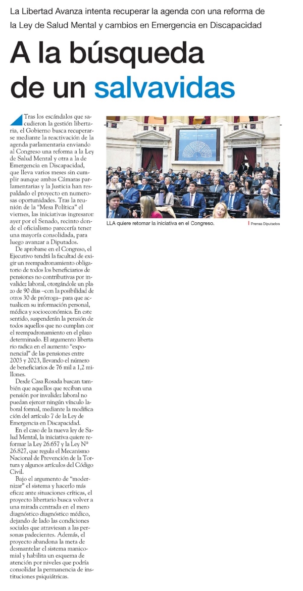 A la búsqueda de un salvavidas La Libertad Avanza intenta recuperar la agenda con una reforma de la Ley de Salud Mental y cambios en Emergencia en Discapacidad. Tras los escándalos que sacudieron la gestión libertaria, el Gobierno busca recuperarse mediante la reactivación de la agenda parlamentaria enviando al Congreso una reforma a la Ley de Salud Mental y otra a la de Emergencia en Discapacidad, que lleva varios meses sin cumplir aunque ambas Cámaras parlamentarias y la Justicia han respaldado el proyecto en numerosas oportunidades. Tras la reunión de la "Mesa Política" el viernes, las iniciativas ingresaron ayer por el Senado, recinto donde el oficialismo parecería tener una mayoría consolidada, para luego avanzar a Diputados. De aprobarse en el Congreso, el Ejecutivo tendrá la facultad de exigir un reempadronamiento obligatorio de todos los beneficiarios de pensiones no contributivas por invalidez laboral, otorgándole un plazo de 90 días -con la posibilidad de otros 30 de prórroga- para que actualicen su información personal, médica y socioeconómica. En este sentido, suspenderán la pensión de todos aquellos que no cumplan con el reempadronamiento en el plazo determinado. El argumento libertario radica en el aumento "exponencial" de las pensiones entre 2003 y 2023, llevando el número de beneficiarios de 76 mil a 1,2 millones. Desde Casa Rosada buscan también que aquellos que reciban una pensión por invalidez laboral no puedan ejercer ningún vínculo laboral formal, mediante la modificación del artículo 7 de la Ley de Emergencia en Discapacidad. En el caso de la nueva ley de Salud Mental, la iniciativa quiere reformar la Ley 26.657 y la Ley N° 26.827, que regula el Mecanismo Nacional de Prevención de la Tortura y algunos artículos del Código Civil. Bajo el argumento de "modernizar" el sistema y hacerlo más eficaz ante situaciones críticas, el proyecto libertario busca volver a una mirada centrada en el mero diagnóstico médico, dejando de lado las condiciones sociales que atraviesan a las personas padecientes. Además, el proyecto abandona la meta de desmantelar el sistema manicomial y habilita un esquema de atención por niveles que podría consolidar la permanencia de instituciones psiquiátricas. LLA quiere retomar la iniciativa en el Congreso. Prensa Diputados Menciones: cpol2