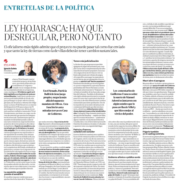 LEY HOJARASCA: HAY QUE DESREGULAR, PERO NO TANTO Ignacio Zuleta El oficialismo más rígido admite que el proyecto no puede pasar tal como fue enviado y que tanto la ley de tierras como la de villas deberán tener cambios sustanciales. EN LA MIRA Ignacio Zuleta Periodista Consultor político La banca 73 del Senado tomó el control del proyecto de ley Hojarasca, que envió el Ejecutivo para entretener al Congreso y cumplir con la consigna de blindar la propiedad privada en la Argentina, como si peligrase. El Gobierno agotó su libido legislativa en el período de sesiones extraordinarias. Logró hacer aprobar proyectos que le había pedido el círculo rojo para prolongar su apoyo: reforma laboral, glaciares, ley de tierras y reforma del código penal. La banca 73 del Senado es un invento del bloque de la UCR para sumar a las 72 que integran la cámara, una oficina de asesoría que han confiado al exsenador Víctor Zimmermann, que tiene a su cargo una docena de asesores que aportan los integrantes de la bancada. Zimmermann agotó su mandato en diciembre pasado y ejerció una tarea central en la negociación de los proyectos de los dos primeros años del actual gobierno. Experto en "semáforos", fue escuchado por el oficialismo y la oposición amigable. Por su "cazo" pasaron iniciativas que lograron ser sancionadas como expresión de acuerdos. Esta semana encabezó reuniones en el "think tank" para elaborar el semáforo de la "ley Hojarasca", que la cámara espera dictaminar antes de fin de mes. Ese proyecto ómnibus cumple el objetivo del oficialismo que es desbaratar la arquitectura del Estado, aboliendo regulaciones y normas con el argumento de que detrás de cada regulación hay un negocio. Los adversarios del cerebro de esa iniciativa, Federico Sturzenegger, entienden que, por el contrario, detrás de cada desregulación también hay un negocio. La banca 73 identifica con luz verde lo que los aliados pueden admitir sin discusión, con luz roja las que no van a dejar pasar y con "amarillas", los temas que se pueden discutir. La oposición amigable prende el semáforo El semáforo impone condiciones para aprobar dos de las leyes de la "Hojarasca". Temen más judicialización La limitación que proponen es que debe agregarse el origen de los fondos para cumplir con las obras complementarias de urbanización de los barrios populares. En la sanción original de la ley de villas se creó un fondo alimentado por tributos de asignación específica para pagar las expropiaciones de tierras, que se entregarían a los ocupantes en más de 6 mil "barrios populares". Este fondo fue abolido por el actual gobierno, que se comprometió a que esos dineros provendrían del Tesoro Nacional. La tarea del Senado sobre el proyecto "Hojarasca" no se limita al semáforo de las bancadas amigables del Gobierno. También el oficialismo más rígido admite que el proyecto no puede pasar tal como vino y que tanto la ley de tierras como la de villas deberán tener cambios sustanciales para tener aprobación. Uno de los expositores en la sesión del plenario de comisiones del Senado que discute el proyecto, advirtió que deben hacerse correcciones al proyecto para evitar la judicialización. El abogado Diego Armesto prevé que la derogación del Renabap —registro de villas, que es la matriz del proyecto— puede tener alguna cuestión con el artículo 14 bis de la Constitución y con el Pacto Internacional de Derechos Económicos, Sociales y Culturales y aparecer como una regresividad ilegal. Patricia y Francos, outsiders del outsider Patricia Bullrich tramitará esos cambios. En su rol de comisaria política de Olivos en el Congreso, envió a uno de sus asesores a la reunión de la banca 73 y tomó nota de los argumentos de la decena de asesores de la UCR sobre los cambios que es oportuno hacer. La senadora ejerce una coordinación de los senadores de su bloque, pero su larga experiencia le facilita el diálogo con los opositores. Con todos los bloques alguno tuvo algún negocio (político). Maneja el bloque del oficialismo con la misma función que cumple para la Libertad Avanza en Diputados Silvana Giudici, ex-UCR y exPRO. Tiene juego propio y negocia más allá del supuesto mandato de Olivos. Por ejemplo, ha prometido a la bancada del peronismo de la Cámara Alta que atenderá los reclamos de que les reconozcan una mayor representación en las comisiones. Esta función de Bullrich levanta miradas torvas en Casa de Gobierno. Filtran informa- En el Senado, Patricia Bullrich tiene juego propio y negocia más allá del supuesto mandato de Olivos. Esta función levanta miradas torvas en Casa de Gobierno. ción sobre ella como la predilecta del círculo rojo, aun por encima del apoyo que el mundo de los negocios le presta a Milei. En la reunión de AmCham se escucharon comentarios sobre la efusividad de los saludos de los empresarios hacia ella, que pudieron molestar a los "loyalists" de Milei. La temperatura que levantan estos gestos cuentapropistas —algo inexorable en un partido de cuentapropistas como la Libertad Avanza— es como la que levantó la aparición de Guillermo Francos pontificando sobre la virtud ajena. Sus comentarios sobre la suerte de Manuel Adorni se juntaron con algún sondeo que lo puso arriba de Milei y que hizo enojar al vértice del poder. Gobierno afónico o público sordo Estas palabras resbalan a quien aqueja una situación por la que han pasado otros gobiernos, que es la intrascendencia de lo que dicen. Nunca es importante lo que dice un político, y menos un presidente. Pero esto cambia en el caso de Milei: esta semana en AmCham, denunció nada menos que un golpe de Estado. "Se quejó "del ataque especulativo y el intento de la política de generar un golpe de Estado". O es un presidente afó- que serán reescritas. Una es la ley de tierras. El proyecto oficial desregula la inhibición para que extranjeros compren tierras en zonas de frontera. La propuesta de la oposición amigable es