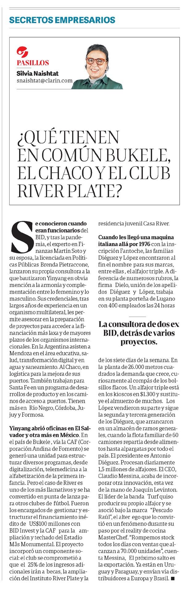 ¿QUÉ TIENEN EN COMÚN BUKELE, EL CHACO Y EL CLUB RIVER PLATE? Silvia Naishtat SECRETOS EMPRESARIOS PASILLOS Silvia Naishtat snaishtat@clarin.com ¿QUÉ TIENEN EN COMÚN BUKELE, EL CHACO Y EL CLUB RIVER PLATE? Se conocieron cuando eran funcionarios del BID, y tras la pandemia, el experto en Finanzas Martín Soto y su esposa, la licenciada en Políticas Públicas Brenda Pietraccone, lanzaron su propia consultora a la que bautizaron Yinyang en obvia mención a la armonía y complementación entre lo femenino y lo masculino. Sus credenciales, tras largos años de experiencia en un organismo multilateral, les permiten asesorar en la preparación de proyectos para acceder a la financiación más laxa y de mayores plazos de los organismos internacionales. En la Argentina asisten a Mendoza en el área educativa, salud, transformación digital y en agua y saneamiento. Al Chaco, en logística para la mejora de sus puertos. También trabajan para Santa Fe en un programa de desarrollos de producto y en los caminos de acceso a puertos. Tienen más en Río Negro, Córdoba, Jujuy y Formosa. Yinyang abrió oficinas en El Salvador y otra más en México. En el país de Bukele, vía la CAF (Corporación Andina de Fomento) se generó una unidad para estructurar diversos programas, desde digitalización, telemedicina a la alfabetización de la primera infancia. Pero el caso de River es uno de los más llamativos y se ha convertido en punta de lanza para otros clubes de fútbol. Fueron los encargados de gestionar y estructurar el financiamiento inédito de US$100 millones con BID Invest y la CAF para la ampliación y techado del Estadio Más Monumental. El proyecto incorporó un componente social: el club se comprometió a que el 25% de los ingresos adicionales irán a becas, la ampliación del Instituto River Plate y la residencia juvenil Casa River. Cuando les llegó una máquina italiana allá por 1976 con la inscripción Fantoche, las familias Diéguez y López encontraron al fin el nombre para sus marcas, entre ellas, el alfajor triple. A diferencia de numerosos rubros, la firma Dielo, unión de los apellidos Diéguez y López, trabaja en su planta porteña de Lugano con 400 empleados las 24 horas. La consultora de dos ex BID, detrás de varios proyectos. De los siete días de la semana. En la planta de 26.000 metros cuadrados la demanda que crece, curiosamente al compás de los bolsillos flacos. Un alfajor triple está en los kioscos en $1.300 y sustituye el almuerzo de muchos. Los López vendieron su parte y sigue la segunda y tercera generación de los Diéguez, que arrancaron en un almacén de ramos generales, cuando la flota familiar de 60 camiones repartía desde alimentos hasta alpargatas por todo el país. El presidente es Antonio Diéguez. Procesan diariamente 1,5 millones de alfajores. El CEO, Claudio Messina, acaba de incorporar otra innovación, esta vez de la mano de Joaquín Levinton. El líder de la banda Turf quiso producir su propio alfajor y se asoció bajo la marca “Pescado Raúl”, el alter ego que lo convirtió en un fenómeno durante su paso por el reality de cocina MasterChef. "Rompemos stock todos los días con ventas que alcanzan a 70.000 unidades", cuenta Messina. El próximo salto es la exportación. Ya están en Uruguay y Paraguay, y envían vía distribuidores a Europa y Brasil. Menciones: BID, CAF, Bukele, River Plate, Martín Soto, Brenda Pietraccone, Yinyang, Mendoza, Chaco, Santa Fe, Río Negro, Córdoba, Jujuy, Formosa, El Salvador, México, El Chaco, Diéguez, López, Fantoche, Dielo, Lugano, Antonio Diéguez, Claudio Messina, Joaquín Levinton, Turf, Pescado Raúl, MasterChef, Uruguay, Paraguay, Brasil