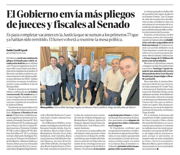 El Gobierno envía más pliegos de jueces y fiscales al Senado Guido Carelli Lynch Es para completar vacantes en la Justicia que se suman a los primeros 77 que ya habían sido remitido. El lunes volverá a reunirse la mesa política. Guido Carelli Lynch gcarelli@clarin.com El Gobierno envió una veintena de pliegos al Senado para cubrir vacantes en la Justicia que se añaden a los 77 que ya ingresaron en la Cámara Alta y que tienen que discutirse en la comisión de acuerdos. El Ejecutivo también remitió esta semana el proyecto de reforma política para eliminar las PASO. Ambas iniciativas se suman al polémico proyecto para modificar la ley de discapacidad. Desde el ministerio de Justicia habían confirmado que se habían consensuado 26 nombres para ocupar juzgados, fiscalías y continuar con el proceso de nominaciones para completar las vacantes en la Justicia Federal. Finalmente se trascendieron las propuestas del Gobierno para nombrar a 11 jueces, 4 fiscales y 6 conjueces. El Ejecutivo candidatea para los juzgados nacionales en lo criminal a Fernando Pascual (Nº 41) y Javier Pereyra (Nº 3), mientras que para el fuero civil de la Capital Federal postula a Florencia Córdoba (Nº 66), Lucila Califano (Nº 9) y Bárbara Rastellino (Nº 27). La nómina incluye a Bernardo Rodríguez Palma para el Tribunal Oral Federal 2 de San Martín, a Mariana Salduna y Vanesa Alfaro para los tribunales orales criminales 25 y 16, y a las vocales Alicia Braghini (Seguridad Social) y Matilde Ballerini (Comercial), junto al juez comercial Gustavo Cultraro. En el Ministerio Público, se impulsan las designaciones de los defensores Germán Artola, Ana Galán Muñoz, María Esther Pinos, Maximiliano Nicolás, Nuria Saba Sardañons, José Chumbita, María Laura Irastorza, Sofía Martín y Hernán Figueroa, así como de los fiscales Pedro Rebollo, Santiago Roldán, María Ángeles Ramos y Natalia Crede, cerrando el conjunto con la lista de conjueces para la jurisdicción de Córdoba integrada por Maximiliano Chávez, Andrea Di Gregorio, Agustín García Faure, Gabriel Marnich, José Villena y Fernando Zarabozo. Mesa política. Karina Milei, Santiago Caputo, los Menem, Patricia Bullirch, Diego Santilli y Manuel Adorni. En ese marco, la mesa política del oficialismo tenía planeado volver a reunirse en el despacho de Manuel Adorni, que el miércoles brindará su informe en Diputados por medio de las investigaciones por presunto enriquecimiento ilícito y el encuentro se postergó para el lunes. La Libertad Avanza busca retomar la iniciativa, pero hasta ahora ninguno de sus proyectos reúne voluntades en el Congreso. El Presidente confirmó que acompañará al ministro coordinador durante su exposición en Diputados, en una sesión que promete ser escandalosa. El resto de los ministros podrían asistir a la sesión en la Cámara Baja. El ministro coordinador pretende evitar las preguntas sobre su patrimonio. La semana pasada no había sido de la partida Luis Caputo, de gira en los Estados Unidos. Tras 10 meses de caída de recaudación y de inflación en alza, el Gobierno mira con entusiasmo el crecimiento de la recaudación de ingresos brutos en algunos distritos para justificar el fervor del ministro de Economía. El jueves, el oficialismo recibió una buena noticia de tribunales, cuando la Cámara Laboral rehabilitó los artículos suspendidos de la Reforma laboral. El Gobierno insiste con un fallo definitivo en la Corte Suprema a través de un per saltum y con un recurso extraordinario ante el máximo Tribunal para frenar el pago de 2.5 billones de pesos a las universidades. Mientras el oficialismo intenta conseguir un fallo favorable de los supremos, Santiago Caputo denunció una maniobra del vocero del presidente de la Corte Horacio Rosatti para desprestigiar a Ricardo Lorenzetti. Hace siete días, la interna libertaria recrudeció por un cruce entre Lilia Lemoine y el “Gordo” Dan, y el avance en la Justicia de una denuncia de Sebastián Pareja contra militantes en redes. Javier Milei saldó la discusión a favor de Lemoine y su hermana en detrimento de las Fuerzas del Cielo, que se referenciarse en Caputo. Hoy, Karina encabezará un acto en la localidad bonaerense de Suipacha con Pareja y Diego Santilli. Por la mañana, la hermana del mandatario recibió al gobernador de Chaco Leandro Zdero, aliado electoral del oficialismo, en un encuentro para empezar a conversar la confluencia en los comicios provinciales y nacionales de 2027. Zdero, de origen radical, está preocupado porque el peronismo se muestra cada vez más competitivo en Chaco. Así se lo transmitió a Mauricio Macri, que lo visitó la semana pasada en un acto partidario en su provincia. Menciones: cpol1