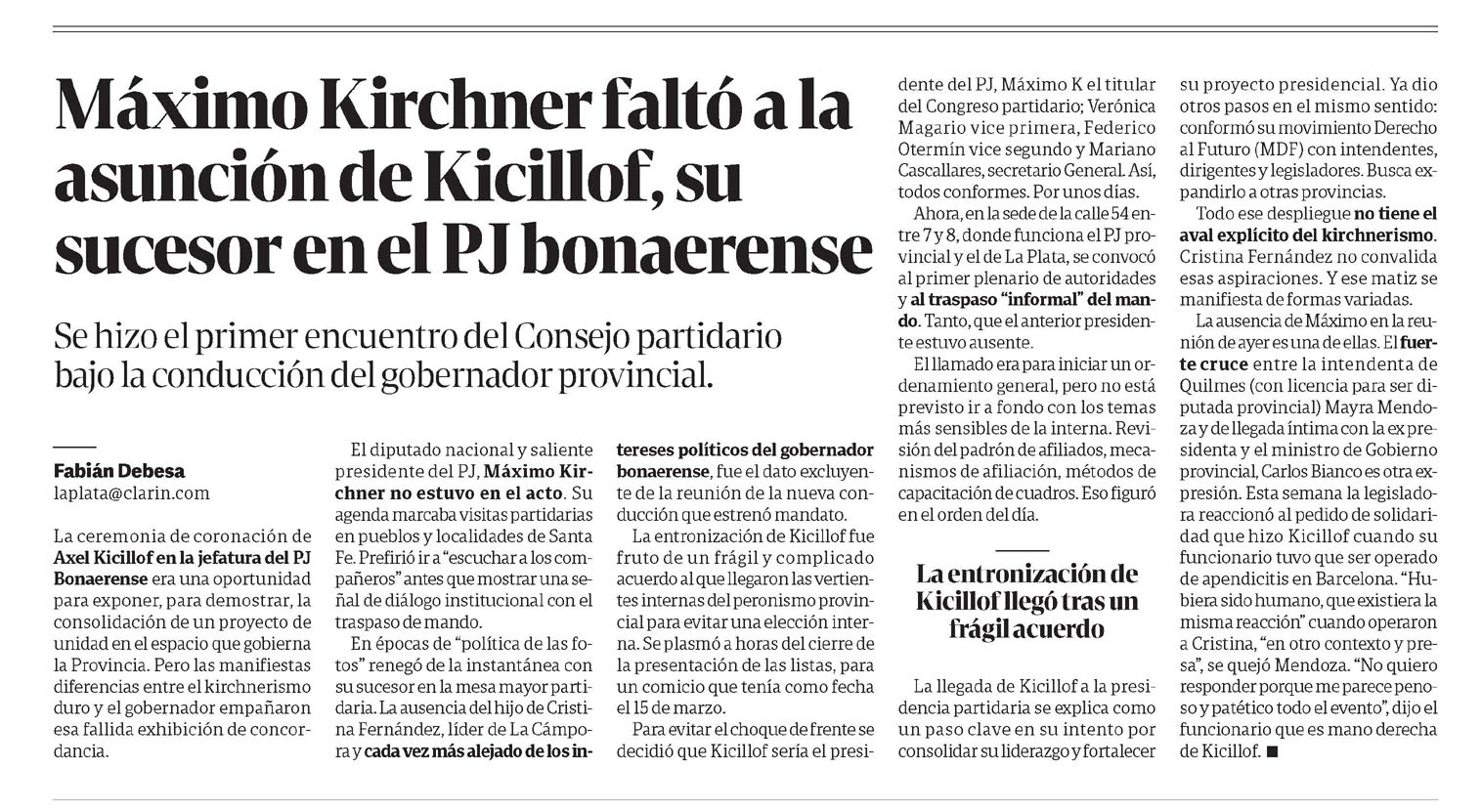 Máximo Kirchner faltó a la asunción de Kicillof, su sucesor en el PJ bonaerense Fabián Debesa Se hizo el primer encuentro del Consejo partidario bajo la conducción del gobernador provincial. La ceremonia de coronación de Axel Kicillof en la jefatura del PJ Bonaerense era una oportunidad para exponer, para demostrar, la consolidación de un proyecto de unidad en el espacio que gobierna la Provincia. Pero las manifiestas diferencias entre el kirchnerismo duro y el gobernador empañaron esa fallida exhibición de concordancia. El diputado nacional y saliente presidente del PJ, Máximo Kirchner no estuvo en el acto. Su agenda marcaba visitas partidarias en pueblos y localidades de Santa Fe. Prefirió ir a "escuchar a los compañeros" antes que mostrar una señal de diálogo institucional con el traspaso de mando. En épocas de "política de las fotos" renegó de la instantánea con su sucesor en la mesa mayor partidaria. La ausencia del hijo de Cristina Fernández, líder de La Cámpora y cada vez más alejado de los intereses políticos del gobernador bonaerense, fue el dato excluyente de la reunión de la nueva conducción que estrenó mandato. La entronización de Kicillof fue fruto de un frágil y complicado acuerdo al que llegaron las vertientes internas del peronismo provincial para evitar una elección interna. Se plasmó a horas del cierre de la presentación de las listas, para un comicio que tenía como fecha el 15 de marzo. Para evitar el choque de frente se decidió que Kicillof sería el presidente del PJ, Máximo K el titular del Congreso partidario; Verónica Magario vice primera, Federico Otermín vice segundo y Mariano Cascallares, secretario General. Así, todos conformes. Por unos días. Ahora, en la sede de la calle 54 entre 7 y 8, donde funciona el PJ provincial y el de La Plata, se convocó al primer plenario de autoridades y al traspaso "informal" del mando. Tanto, que el anterior presidente estuvo ausente. El llamado era para iniciar un ordenamiento general, pero no está previsto ir a fondo con los temas más sensibles de la interna. Revisión del padrón de afiliados, mecanismos de afiliación, métodos de capacitación de cuadros. Eso figuró en el orden del día. La entronización de Kicillof llegó tras un frágil acuerdo. La llegada de Kicillof a la presidencia partidaria se explica como un paso clave en su intento por consolidar su liderazgo y fortalecer su proyecto presidencial. Ya dio otros pasos en el mismo sentido: conformó su movimiento Derecho al Futuro (MDF) con intendentes, dirigentes y legisladores. Busca expandirlo a otras provincias. Todo ese despliegue no tiene el aval explícito del kirchnerismo. Cristina Fernández no convalida esas aspiraciones. Y ese matiz se manifiesta de formas variadas. La ausencia de Máximo en la reunión de ayer es una de ellas. El fuerte cruce entre la intendenta de Quilmes (con licencia para ser diputada provincial) Mayra Mendoza y de llegada íntima con la ex presidenta y el ministro de Gobierno provincial, Carlos Bianco es otra expresión. Esta semana la legisladora reaccionó al pedido de solidaridad que hizo Kicillof cuando su funcionario tuvo que ser operado de apendicitis en Barcelona. "Hubiera sido humano, que existiera la misma reacción" cuando operaron a Cristina, "en otro contexto y presa", se quejó Mendoza. "No quiero responder porque me parece penoso y patético todo el evento", dijo el funcionario que es mano derecha de Kicillof. Menciones: cpol1 cnot