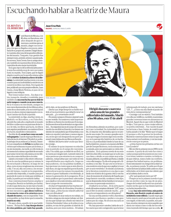 Escuchando hablar a Beatriz de Maura Juan Cruz Ruíz urió Beatriz de Moura, a los 86 años, en Barcelona, seis años después de que comenzara a sentirse ajena al mundo, alegre con los suyos, a los que no llegaba a reconocer, extrañada de su propio ser, ausente. Dirigió durante cuarenta años una de las grandes editoriales del mundo, Tusquets, cuya gestión fue siempre suya, potente, severa y apasionada. Su sucesor, Juan Cerezo, fue su amigo siempre, también en la penumbra de los años oscurecidos de esta mujer inolvidable. En la gran época de la editorial plenamente suya fue asistida muy de cerca por quien fuera su marido, Toni López, que le regaló alegría y pasión por lo que ella misma sabía hacer: revolver la historia a favor de la literatura. La entrevisté muchas veces, y en una ocasión para mi inolvidable la entrevista se convirtió en libro cuyo título, Por el gusto de leer, publicado por sus propios editores, Juan Cerezo, Josep María Ventosa, es para mí un legado y una reliquia. Nos vimos tantas veces... Era dura y sabia, tranquila, risueña y condolida, pero también era una muchacha que no dejó de serlo tampoco cuando ya no nos conocía. No la vi nunca en ese estado, aunque en esos raros duermevelas de los últimos años, antes de su derrumbe, sí la encontré (quizá como yo ahora mismo) expresando con rabia el camino sin fin de la partida. La entrevisté, ya digo, muchas veces, en Madrid o en Barcelona, o en Fráncfort, adonde iba cada año a explicarle al mundo el libro cuáles eran sus pasiones de lectura y de vida, los libros que hacía, los libros que seguían pendientes, sus mejores libros por hacer, españoles o extranjeros. Escribir de ella se me hace como un nudo en la garganta. Cuando supe que Beatriz acababa de morir, el viernes 17 de abril, yo acababa de bajar de un avión en La Orotava, Tenerife. Los compañeros de El País me pedían una crónica que subrayara su paso por la tierra, y en ese momento, esa tarde, yo sólo tenía en mi memoria la misma capacidad de recuerdo que tantas veces tuvo ella misma en los últimos años antes del final de su lucidez. Llamé a mi mujer y ella estuvo rebuscando en la casa las palabras que yo mismo le fui escuchando a Beatriz a lo largo de los años, como si esos renglones me acercaran a ella. Y es así, ella me acerca a los recuerdos del tiempo, cuando yo le preguntaba, cuando ella respondía, y cuando para preguntarle de nuevo yo tenía que redoblar, si podía, la pasión por escucharla hablar. Esas conversaciones fueron amplias y tranquilas; Beatriz no hablaba por hablar, y todo lo que decía era a la vez claro y hondo como un testamento. Aquí recojo algunos de esos encuentros, que ahora vuelven a mi memoria como si la estuviera escuchando de nuevo, y eso es imposible. Y es imposible, no hay dolor que lo remedie, Beatriz no está. He aquí, ahora, aquello de lo que hablábamos... No hay fecha, hay tiempo dentro de estas palabras, por tanto hay pasado, ahí lo dejo, en las palabras de Beatriz. —Decías que Jorge Semprún no había recibido el reconocimiento que debería tener este país.. ¿Lo comentaste con él? —No, jamás, tampoco él nunca expresó nada en ese sentido. Sus mejores y más importantes libros no fueron los escritos por él en español; los escritos en francés tenían un rigor absoluto... Sus experiencias en el campo de concentración los escribió en francés y no tienen ese intento de camaradería que él imprimía a sus textos en español, más laxos y menos rigurosos, en los que casi desaparecía esa parte personal y muy íntima de sus libros en francés... —Hablas del fuerte dolor oculto que llevaba consigo... —El mismo lo quiso imponer en relación con su periodo en el campo de concentración. Y su salida, que no debió de ser fácil, no la cuenta por ningún lado. Leyendo textos de otras personas que estuvieron en campos y salieron, compruebas que casi todos se ven imposibilitados para explicarlo. Jorge era muy pudoroso, con las palabras también, y hay que tener en cuenta que es más directo, más duro, oí algo en español que en francés, el francés se va por las ramas y los españoles vamos al grano hablando y escribiendo, al menos la generación de la posguerra. Él no tenía palabras que le parecieran adecuadas para explicar ni la más mínima anécdota sobre el campo de concentración. —En [tu] correspondencia hay muchas cartas de intercambio de Almudena Grandes y Toni López. ¿Cómo fue esa relación editorial suya con Almudena? —Almudena es muy seria en su trabajo, no he visto a ninguna otra mujer trabajar así. Quizá otra que trabaje tan a fondo sus textos es Cristina Fernández Cubas, no le sobra ni una palabra, es una de las grandes al nivel de Almudena, pero por otros motivos... El trabajo de Almudena además es profuso, por carácter y por curiosidad. Su curiosidad no tiene fin, se impone esta disciplina que no es propia de una mujer. No conozco grandes escritoras que tengan el mismo rigor en la escritura y en la percepción histórica de un hecho. Ella va a la profundidad desde la base de un hecho histórico, un poco a la manera del Maigret de Georges Simenon, con la misma severa mirada, pero sus personajes no están desquiciados... En la primera novela de su serie histórica describe a la mujer que se va de una casa bien a caballo; es una mujer muy echada para adelante, es posible que fuera a caballo como ella imagina. Un día se lo pregunté a Almudena y me dijo: Es que una no se lanza a una aventura como la que voy a explicar sino es por un acto romántico. Se remite a la historia de la literatura romántica en una época que linda con el inicio de la guerra civil y con esa clase de mujeres de la historia de España que luego hemos conocido, condesas y este tipo, que se desprenden de las familias y se van por ahí como un personaje romántico... —El esfuerzo es curioso.. En la carta que te envía Almudena empieza diciendo ¡Uf!, como si el libro le es