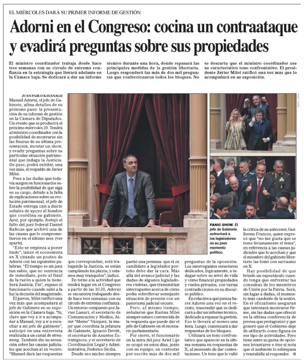 Adorni en el Congreso: cocina un contraataque y evadirá preguntas sobre sus propiedades JUAN PABLO KAVANAGH EL MIÉRCOLES DARÁ SU PRIMER INFORME DE GESTIÓN Manuel Adorni, el jefe de Gabinete, afina detalles de su próximo paso: la presentación de su informe de gestión en la Cámara de Diputados. Un evento que se producirá el próximo miércoles 29. Tendrá al ministro coordinador con la posibilidad de mostrarse sin las fisuras de su última presentación, montar un show, y evadir preguntas sobre su particular situación patrimonial que indaga la Justicia. De paso, podrá exhibir, una vez más, el respaldo de Javier Milei. Pese a las dudas que todavía surgen en funcionarios sobre la posibilidad de que siga en su cargo, debido a la falta de explicaciones sobre su evolución patrimonial, el jefe de Estado entrega casi a diario señales de apoyo al hombre que coordina su gabinete. Ayer, por ejemplo, festejó el fallo del juez federal Daniel Rafecas que archivó una de las causas que lo comprometieron en el último mes (ver aparte). “Esto se empieza a poner lindo”, lanzó el economista en X citando un posteo de Adorni con las siguientes palabras: “El tiempo es un juez tan sabio, que no sentencia de inmediato, pero al final da la razón a quien la tiene. Será Justicia. Fin”, expuso el funcionario cuando salió a la luz la decisión del magistrado. El jueves, Milei ratificó una vez más que acompañará al jefe de Gabinete en su exposición en la Cámara baja. “Sí, claro que voy a ir a acompañar a Manuel, voy a ir a escuchar a mi jefe de gabinete”, anticipó en una entrevista realizada a un canal de streaming. También dio su sensación sobre las causas judiciales que acechan al ex vocero. “Manuel dará las respuestas que correspondan, está trabajando la Justicia, se está cumpliendo los plazos, y estamos muy tranquilos”, indicó. En torno a la actividad que tendrá lugar en el Congreso a partir de las 10.30, Adorni se encuentra trabajando desde hace tres semanas con su círculo de extrema confianza. Un entorno compuesto por Javier Lanari, el secretario de Comunicación y Medios, Aimé “Meme” Vázquez, la mujer que coordina la jefatura de Gabinete, Ignacio Devitt, el secretario de Asuntos Estratégicos; y el secretario de Coordinación Legal y Administrativa, Federico Sicilia. Desde ese núcleo siempre partió una premisa: que el candidato a legislador porteño debe dar la cara. Más allá del avance judicial y las dudas de algunos legisladores violetas, que transmitían interrogantes acerca de cómo podía sobrellevar semejante situación de presión con un panorama judicial oscuro. Pero, al mismo tiempo, señalaron que Karina Milei siempre estuvo convencida de la respuesta que puede dar el jefe de Gabinete en el escenario parlamentario. Por cierto, el funcionario, en la mira del juez Ariel Lijo, se ocupó en estos días, junto con su equipo, en contestar por escrito más de dos mil preguntas de la oposición. Los interrogantes estuvieron dedicados, lógicamente, a indagar sobre su nivel de vida y cómo financió propiedades y vuelos privados, con varias contradicciones en su discurso público. En relación a qué piensa hacer Adorni una vez en el recinto, trascendió que se dedicará a dar un informe técnico, dedicado a repasar la gestión. Eso le llevará al menos una hora. Luego, comenzará a dar respuestas de los bloques. Utilizará un tono confrontativo que apareció en la última semana en respuestas de X, al momento de dar contestaciones. Un tono que le valió la crítica de su antecesor, Guillermo Francos, quien expresó que “no me gusta que se tome livianamente el tema”, en referencia a las causas judiciales que lo acechan y que el miembro del gabinete libertario las tomó con sarcasmo en X. Hay posibilidad de que brinde un espectáculo cuando tenga que enfrentar las consultas de los miembros de Unión por la Patria. Será, sin lugar a dudas, el momento más candente de la sesión. En el oficialismo aseguran que intentará mostrarse firme, sin las dudas que ofreció en la última conferencia de prensa que protagonizó y que generó que el Gobierno dejara de utilizarlo como figura en ese tipo de actividades. Pero tiene entre su gama de opciones levantarse e irse si nota que el ambiente lo sobrepasa y trastabilla al responder. El ministro coordinador trabaja desde hace tres semanas con su círculo de extrema confianza en la estrategia que llevará adelante en la Cámara baja. Se dedicará a dar un informe técnico durante una hora, donde repasará las principales medidas de la gestión libertaria. Luego responderá las más de dos mil preguntas que confeccionaron todos los bloques. No se descarta que el ministro coordinador use su característico tono confrontativo. El presidente Javier Milei ratificó una vez más que lo acompañará en su exposición. PANIC SHOW. El jefe de Gabinete enfrentará a los legisladores en su peor momento político. Menciones: cpol1 cnot
