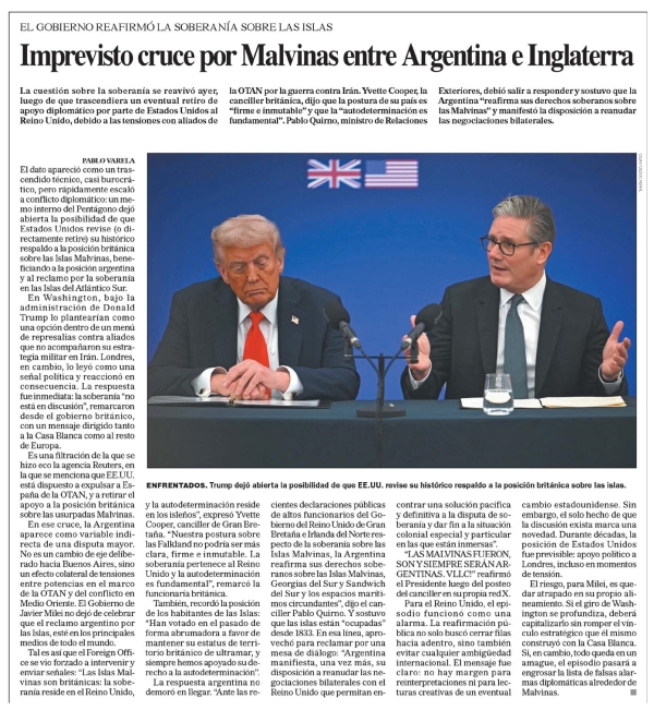 Imprevisto cruce por Malvinas entre Argentina e Inglaterra PABLO VARELA EL GOBIERNO REAFIRMÓ LA SOBERANÍA SOBRE LAS ISLAS La cuestión sobre la soberanía se reavivó ayer, luego de que trascendiera un eventual retiro de apoyo diplomático por parte de Estados Unidos al Reino Unido, debido a las tensiones con aliados de la OTAN por la guerra contra Irán. Yvette Cooper, la canciller británica, dijo que la postura de su país es “firme e inmutable” y que la “autodeterminación es fundamental”. Pablo Quirno, ministro de Relaciones Exteriores, debió salir a responder y sostuvo que la Argentina “reafirma sus derechos soberanos sobre las Malvinas” y manifestó la disposición a reanudar las negociaciones bilaterales. PABLO VARELA El dato apareció como un trascendido técnico, casi burocrático, pero rápidamente escaló a conflicto diplomático: un memo interno del Pentágono dejó abierta la posibilidad de que Estados Unidos revise (o directamente retire) su histórico respaldo a la posición británica sobre las Islas Malvinas, beneficiando a la posición argentina al reclamo por la soberanía en las Islas del Atlántico Sur. En Washington, bajo la administración de Donald Trump lo plantearían como una opción dentro de un menú de represalias contra aliados que no acompañaron su estrategia militar en Irán. Londres, en cambio, lo leyó como una señal política y reaccionó en consecuencia. La respuesta fue inmediata: la soberanía “no está en discusión”, remarcaron desde el gobierno británico, con un mensaje dirigido tanto a la Casa Blanca como al resto de Europa. Es una filtración de la que se hizo eco la agencia Reuters, en la que se menciona que EE.UU. está dispuesto a expulsar a España de la OTAN, y a retirar el apoyo a la posición británica sobre las usurpadas Malvinas. En ese cruce, la Argentina parece como variable indirecta de una disputa mayor. No es un cambio de eje deliberado hacia Buenos Aires, sino un efecto colateral de tensiones entre potencias en el marco de la OTAN y del conflicto en Medio Oriente. El Gobierno de Javier Milei no dejó de celebrar que el reclamo argentino por las Islas, esté en los principales medios de todo el mundo. Tal es así que el Foreign Office se vio forzado a intervenir y enviar señales: “Las Islas Malvinas son británicas: la soberanía reside en el Reino Unido, y la autodeterminación reside en los isleños”, expresó Yvette Cooper, canciller de Gran Bretaña. “Nuestra postura sobre las Falkland no podría ser más clara, firme e inmutable. La soberanía pertenece al Reino Unido y la autodeterminación es fundamental”, remarcó la funcionaria británica. También, recordó la posición de los habitantes de las Islas: “Han votado en el pasado de forma abrumadora a favor de mantener su estatus de territorio británico de ultramar, y siempre hemos apoyado su derecho a la autodeterminación”. La respuesta argentina no demoró en llegar. “Ante las recientes declaraciones públicas de altos funcionarios del Gobierno del Reino Unido de Gran Bretaña e Irlanda del Norte respecto de la soberanía sobre las Islas Malvinas, la Argentina reafirma sus derechos soberanos sobre las Islas Malvinas, Georgias del Sur y Sandwic el Sur y los espacios marítimos circundantes”, dijo el canciller Pablo Quirno. Y sostuvo que las islas están “ocupadas” desde 1833. En esa línea, aprovechó para reclamar por una mesa de diálogo: “Argentina manifiesta, una vez más, su disposición a reanudar las negociaciones bilaterales con el Reino Unido que permitan encontrar una solución pacífica y definitiva a la disputa de soberanía y dar fin a la situación colonial especial y particular en las que están inmersas”. “LAS MALVINAS FUERON, SON Y SIEMPRE SERÁN ARGENTINAS. VLLC” reafirmó el Presidente luego del posteo del canciller en su propia red X. Para el Reino Unido, el episodio funcionó como una alarma. La reafirmación pública no solo buscó cerrar filas hacia adentro, sino también evitar cualquier ambigüedad internacional. El mensaje fue claro: no hay margen para reinterpretaciones ni para lecturas creativas de un eventual cambio estadounidense. Sin embargo, el solo hecho de que la discusión exista marca una novedad. Durante décadas, la posición de Estados Unidos fue previsible: apoyo político a Londres, incluso en momentos de tensión. El riesgo, para Milei, es quedar atrapado en su propio alineamiento. Si el giro de Washington se profundiza, deberá capitalizarlo sin romper el vínculo estratégico que él mismo construyó con la Casa Blanca. Si, en cambio, todo queda en un amague, el episodio pasará a engrosar la lista de falsas alarmas diplomáticas alrededor de Malvinas. Menciones: cpol1 cnot