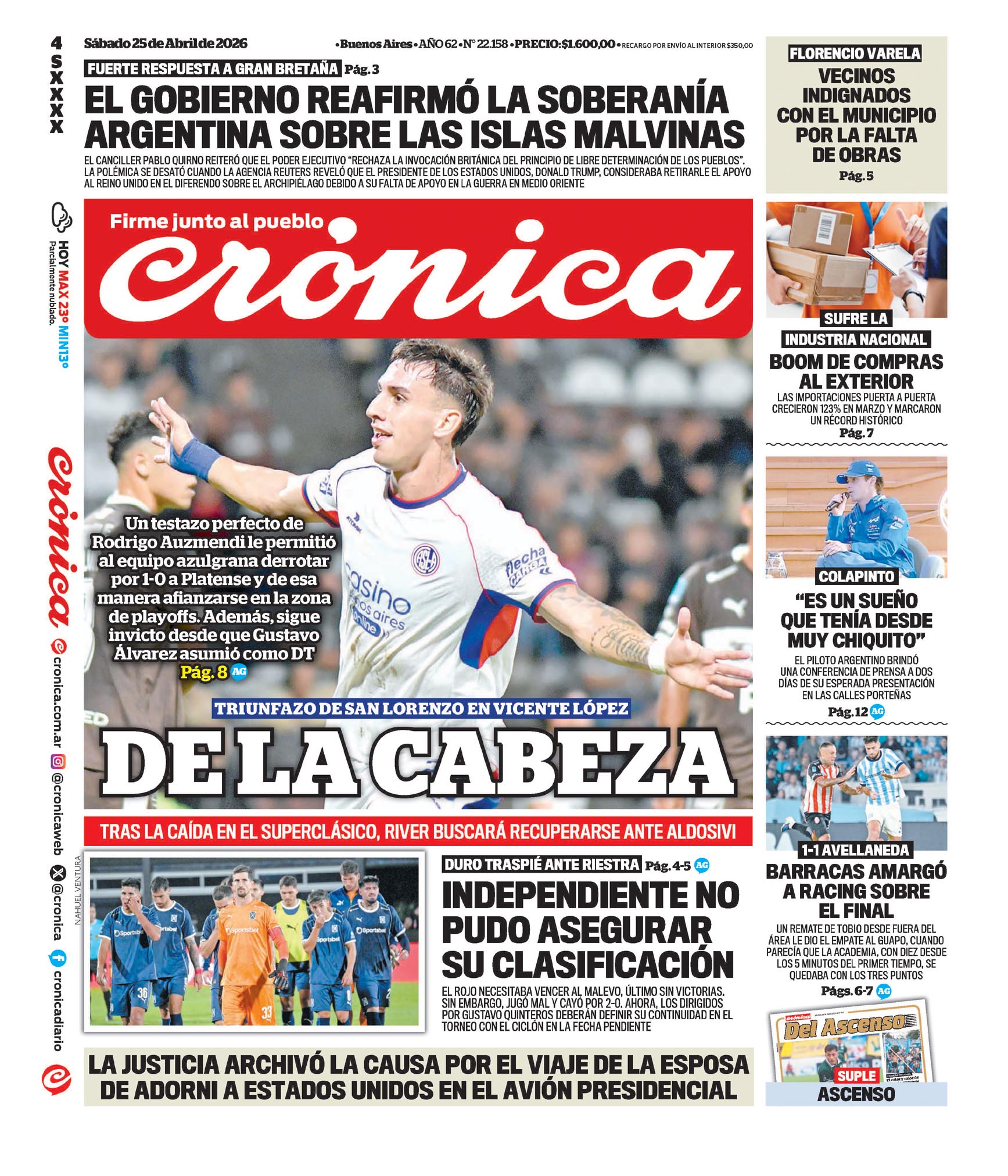 Crónica Tapa FUERTE RESPUESTA A GRAN BRETAÑA Pág. 3 EL GOBIERNO REAFIRMÓ LA SOBERANÍA ARGENTINA SOBRE LAS ISLAS MALVINAS EL CANCILLER PABLO QUIRNO REITERÓ QUE EL PODER EJECUTIVO "RECHAZA LA INVOCACIÓN BRITÁNICA DEL PRINCIPIO DE LIBRE DETERMINACIÓN DE LOS PUEBLOS". LA POLÉMICA SE DESATÓ CUANDO LA AGENCIA REUTERS REVELÓ QUE EL PRESIDENTE DE LOS ESTADOS UNIDOS, DONALD TRUMP, CONSIDERABA RETIRARLE EL APOYO AL REINO UNIDO EN EL DIFERENDO SOBRE EL ARCHIPIÉLAGO DEBIDO A SU FALTA DE APOYO EN LA GUERRA EN MEDIO ORIENTE FLORENCIO VARELA VECINOS INDIGNADOS CON EL MUNICIPIO POR LA FALTA DE OBRAS Pág. 5 SUFRE LA INDUSTRIA NACIONAL BOOM DE COMPRAS AL EXTERIOR LAS IMPORTACIONES PUERTA A PUERTA CRECIERON 123% EN MARZO Y MARCARON UN RÉCORD HISTÓRICO Pág. 7 COLAPINTO "ES UN SUEÑO QUE TENÍA DESDE MUY CHIQUITO" EL PILOTO ARGENTINO BRINDÓ UNA CONFERENCIA DE PRENSA A DOS DÍAS DE SU ESPERADA PRESENTACIÓN EN LAS CALLES PORTEÑAS Pág. 12 AG AVELLANEDA BARRACAS AMARGÓ A RACING SOBRE EL FINAL UN REMATE DE TOBIO DESDE FUERA DEL ÁREA LE DIO EL EMPATE AL GUAPO, CUANDO PARECÍA QUE LA ACADEMIA, CON DIEZ DESDE LOS 5 MINUTOS DEL PRIMER TIEMPO, SE QUEDABA CON LOS TRES PUNTOS Págs. 6-7 AG TRIUNFAZO DE SAN LORENZO EN VICENTE LÓPEZ DE LA CABEZA Un testazo perfecto de Rodrigo Auzmendi le permitió al equipo azulgrana derrotar por 1-0 a Platense y de esa manera afianzarse en la zona de playoffs. Además, sigue invicto desde que Gustavo Álvarez asumió como DT Pág. 8 AG TRAS LA caída EN EL SUPERCLÁSICO, RIVER BUSCARÁ RECUPERARSE ANTE ALDOSIVI DURo traspié ANTE RIESTRA Pág. 4-5 A INDEPENDIENTE NO PUDO ASEGURAR SU CLASIFICACIÓN EL ROJO NECESITABA VENCER AL MALEVO, ÚLTIMO SIN victorias . SIN EMBARGO, JUGÓ MAL Y CAYÓ POR 2-0. AHORA, los dirigi dos por gustavo quinteros DEBERÁn DEFINIR SU CONTINUIDAD EN EL TORNEO CON el ciclón EN LA FECHA PENDIENTE LA JUSTICIA ARCHIVÓ LA CAUSA POR EL VIAJE DE LA ESPOSA DE ADORNI A ESTADOS UNIDOS EN EL AVIÓN PRESIDENCIAL