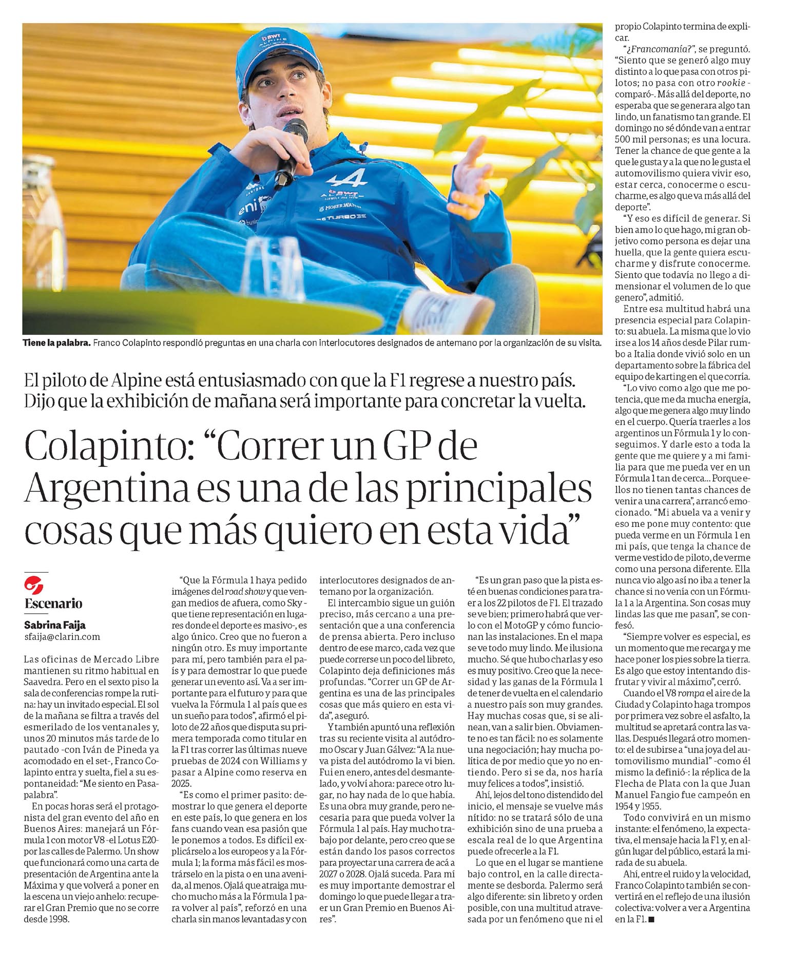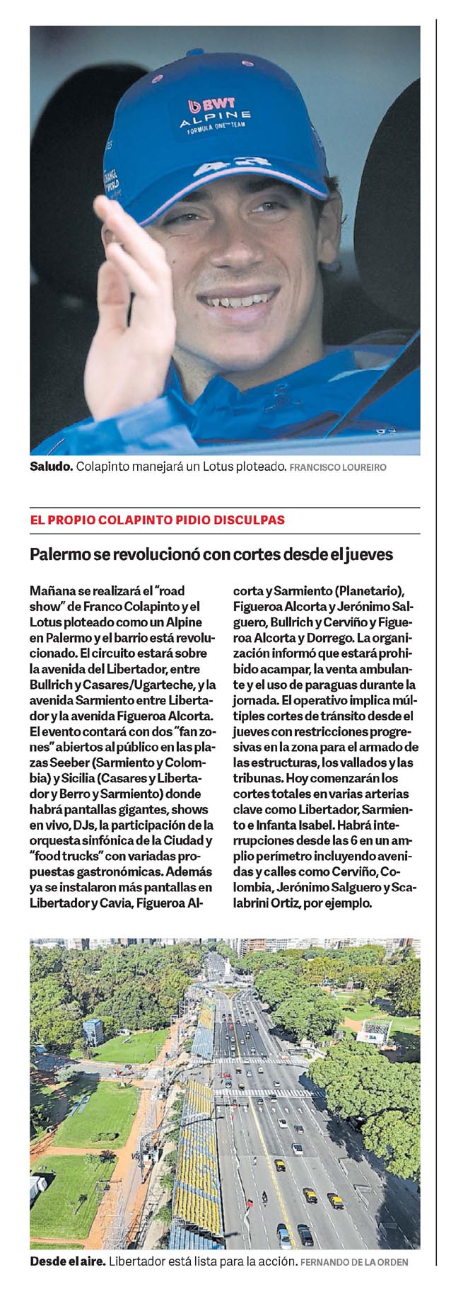 Colapinto: "Correr un GP de Argentina es una de las principales cosas que más quiero en esta vida" Sabrina Faija El piloto de Alpine está entusiasmado con que la F1 regrese a nuestro país. Dijo que la exhibición de mañana será importante para concretar la vuelta. Escenario Sabrina Faija sfaija@clarin.com Las oficinas de Mercado Libre mantienen su ritmo habitual en Saavedra. Pero en el sexto piso la sala de conferencias rompe la rutina: hay un invitado especial. El sol de la mañana se filtra a través de esmerilado de los ventanales y, unos 20 minutos más tarde del autado, con Iván de Pineda comodado en el set, Franco Colapinto entra y suelta, fiel a su espontaneidad: “Me siento en Pasapalabra”. En pocas horas será el protagonista del gran evento del año en Buenos Aires: manejará un Fórmula 1 con motor V8 -el Lotus E20- por las calles de Palermo. Un show que funcionará como una carta de presentación de Argentina ante la Máxima y que volverá a poner en la escena un viejo anhelo: recuperar el Gran Premio que no se corre desde 1998. “Que la Fórmula 1 haya pedido imágenes del road show y que vengan medios de afuera, como Sky -que tiene representación en lugares donde el deporte es masivo-, es algo único. Creo que no fueron a ningún otro. Es muy importante para mí, pero también para el país y para demostrar lo que puede generar un evento así. Va a ser importante para el futuro y para que vuelva la Fórmula 1 al país que es un sueño para todos”, afirmó el piloto de 22 años que disputa su primera temporada como titular en la F1 tras correr las últimas nueve pruebas de 2024 con Williams y pasar a Alpine como reserva en 2025. “Es como el primer pasito: demostrar lo que genera el deporte en este país, lo que genera en los fans cuando vean esa pasión que le ponemos a todos. Es difícil explicárselo a los europeos y a la Fórmula 1; la forma más fácil es mostrárselo en la pista o en una avenida, al menos. Ojalá que atraiga mucho mucho más a la Fórmula 1 para volver al país”, reforzó en una charla sin manos levantadas y con interlocutores designados de antemano por la organización. El intercambio sigue un guión preciso, más cercano a una presentación que a una conferencia de prensa abierta. Pero incluso dentro de ese marco, cada vez que puede correrse un poco del libreto, Colapinto deja definiciones más profundas. “Correr un GP de Argentina es una de las principales cosas que más quiero en esta vida”, aseguró. Y también apuntó una reflexión tras su reciente visita al autódromo Oscar y Juan Gálvez: “A la nueva pista del autódromo la vi bien. Fui en enero, antes del desmantelado, y volví ahora: parece otro lugar, no hay nada de lo que había. Es una obra muy grande, pero necesaria para que pueda volver la Fórmula 1 al país. Hay mucho trabajo por delante, pero creo que se están dando los pasos correctos para proyectar una carrera de acá a 2027 o 2028. Ojalá suceda. Para mí es muy importante demostrar el domingo lo que puede llegar a traer un Gran Premio en Buenos Aires”. “Es un gran paso que la pista esté en buenas condiciones para traer a los 22 pilotos de F1. El trazado se ve bien; primero habrá que verlo con el MotoGP y cómo funcionan las instalaciones. En el mapa se ve todo muy lindo. Me ilusiona mucho. Sé que hubo charlas y es muy positivo. Creo que la necesidad y las ganas de la Fórmula 1 de tener de vuelta en el calendario a nuestro país son muy grandes. Hay muchas cosas que, si se alinean, van a salir bien. Obviamente, no es tan fácil: no es solamente una negociación; hay mucha política de por medio que yo no entiendo. Pero si se da, nos haría muy felices a todos”, insistió. Ahí, lejos del tono distendido del inicio, el mensaje se vuelve más nítido: no se tratará sólo de una exhibición sino de una prueba a escala real de lo que Argentina puede ofrecerle a la F1. Lo que en el lugar se mantiene bajo control, en la calle directamente se desborda. Palermo se.sólo diferente: sin libreto y orden posible, con una multitud atravesada por un fenómeno que ni el propio Colapinto termina de explicar. "¿Francomanía?", se preguntó. "Siento que se generó algo muy distinto a lo que pasa con otros pilotos; no pasa con otro rookie -comparó-. Más allá del deporte, no esperaba que se generara algo tan lindo, un fanatismo tan grande. El domingo no sé dónde van a entrar 500 mil personas; es una locura. Tener la chance de que gente a la que le gusta y a la que no le gusta el automovilismo quiera vivir eso, estar cerca, conocerme o escucharme, es algo que va más allá del deporte". "Y eso es difícil de generar. Si bien amo lo que hago, mi gran objetivo como persona es dejar una huella, que la gente quiera escucharme y disfrute conocerme. Siento que todavía no llego a dimensionar el volumen de lo que generó", admitió. Entre esa multitud habrá una presencia especial para Colapinto: su abuela. La misma que lo vio irse a los 14 años desde Pilar rumbo a Italia donde vivió solo en un departamento sobre la fábrica de equipo de karting en el que corría. "Lo vivo como algo que me potencia, que me da mucha energía, algo que me genera algo muy lindo en el cuerpo. Quería traerles a los argentinos un Fórmula 1 y lo conseguimos. Y darle esto a toda la gente que me quiere y a mi familia para que me pueda ver en un Fórmula 1 tan de cerca... Porque ellos no tienen tantas chances de venir a una carrera", arrancó emocionado. "Mi abuela va a venir y eso me pone muy contento: que pueda verme en un Fórmula 1 en mi país, que tenga la chance de verme vestido de piloto, de verme como una persona diferente. Ella nunca vio algo así no iba a tener la chance si no venía con un Fórmula 1 a la Argentina. Son cosas muy lindas las que me pasan", se confesó. "Siempre volver es especial, es un momento que me recarga y me hace poner los pies sobre la tierra. Es algo que estoy intentando disfrutar y vivir al máximo", cerr