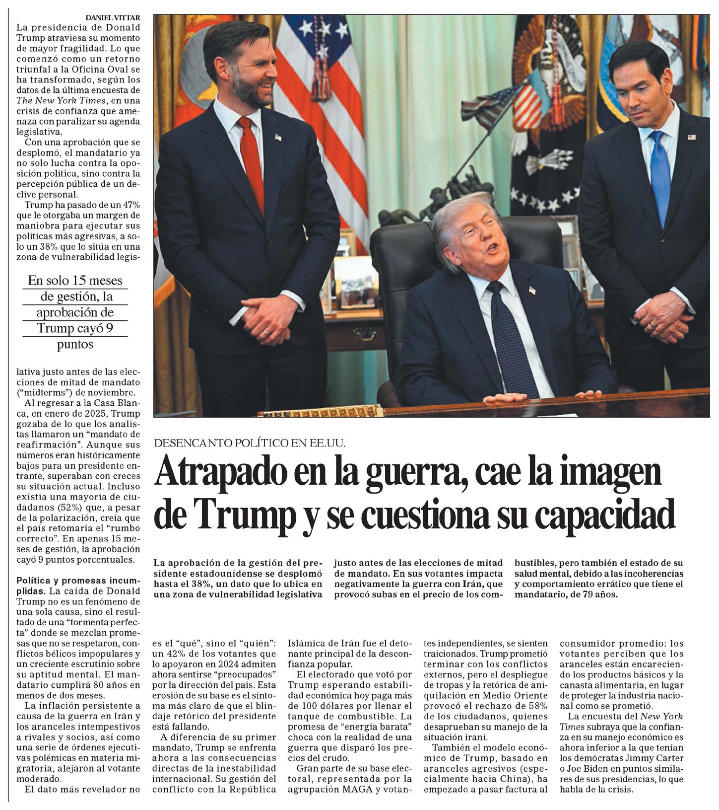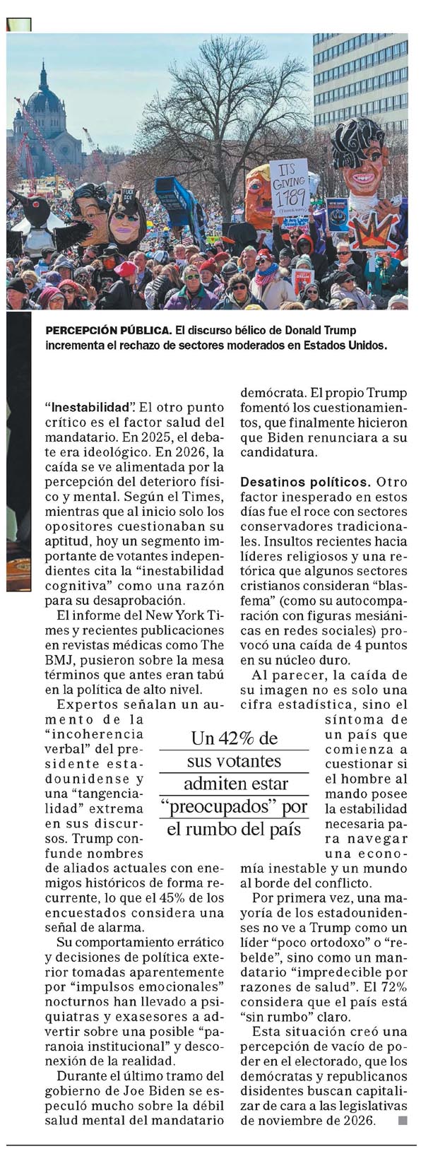 Atrapado en la guerra, cae la imagen de Trump y se cuestiona su capacidad DANIEL VITTAR La presidencia de Donald Trump atraviesa su momento de mayor fragilidad. Lo que comenzó como un retorno triunfal a la Oficina Oval se ha transformado, según los datos de la última encuesta de The New York Times, en una crisis de confianza que amenaza con paralizar su agenda legislativa. Con una aprobación que se desplomó, el mandatario ya no solo lucha contra la oposición política, sino contra la percepción pública de un declive personal. Trump ha pasado de un 47% que le otorgaba un margen de maniobra para ejecutar sus políticas más agresivas, a solo un 38% que lo sitúa en una zona de vulnerabilidad legislativa. En solo 15 meses de gestión, la aprobación de Trump cayó 9 puntos La aprobación de la gestión del presidente estadounidense se desplomó hasta el 38%, un dato que lo ubica en una zona de vulnerabilidad legislativa. La narrativa de la campaña electoral de Trump, "Make America Great Again", se diluye ante la complejidad de los desafíos globales. La inflación persistente, causa de la guerra en Irán y los aranceles intempestivos a rivales y socios, así como una serie de órdenes ejecutivas polémicas en materia migratoria, alejaron al votante moderado. El dato más revelador no es el "qué", sino el "quién": un 42% de los votantes que lo apoyaron en 2024 admiten ahora sentirse "preocupados" por la dirección del país. Esta erosión de su base es el síntoma más claro de que el blindaje retórico del presidente está fallando. A diferencia de su primer mandato, Trump se enfrenta ahora a las consecuencias directas de la inestabilidad internacional. Su gestión del conflicto con la República Islámica de Irán fue el detonante principal de la desconfianza popular. El electorado que votó por Trump esperando estabilidad económica hoy paga más de 100 dólares por llenar el tanque de combustible. La promesa de "energía barata" choca con la realidad de una guerra que disparó los precios del crudo. Gran parte de su base electoral, representada por la agrupación MAGA y votantes independientes, se sienten traicionados. Trump prometió terminar con los conflictos externos, pero el despliegue de tropas y la retórica de aniquilación en Medio Oriente provocó el rechazo de 58% de los ciudadanos, quienes desaprueban su manejo de la situación iraní. También el modelo económico de Trump, basado en aranceles agresivos (especialmente hacia China), ha empezado a pasar factura al consumidor promedio: los votantes perciben que los aranceles están encareciendo los productos básicos y la canasta alimentaria, en lugar de proteger la industria nacional como se prometió. justo antes de las elecciones de mitad de mandato. En sus votantes impacta negativamente la guerra con Irán, que provocó subas en el precio de los combustibles, pero también el estado de su salud mental, debido a las incoherencias y comportamiento errático que tiene el mandatario, de 79 años. La encuesta del New York Times subraya que la confianza en su manejo económico es ahora inferior a la que tenían los demócratas Jimmy Carter o Joe Biden en puntos similares de sus presidencias, lo que habla de la crisis. PERCEPCIÓN PÚBLICA. El discurso bélico de Donald Trump incrementa el rechazo de sectores moderados en Estados Unidos. "Inestabilidad". El otro punto crítico es el factor salud del mandatario. En 2025, el debate era ideológico. En 2026, la caída se ve alimentada por la percepción del deterioro físico y mental. Según el Times, mientras que al inicio solo los opositores cuestionaban su aptitud, hoy un segmento importante de votantes independientes cita la "inestabilidad cognitiva" como una razón para su desaprobación. El informe del New York Times y recientes publicaciones en revistas médicas como The BMJ, pusieron sobre la mesa términos que antes eran tabú en la política de alto nivel. Expertos señalan un aumento de la "incoherencia verbal" del presidente estadounidense y una "tangencialidad" extrema en sus discursos. Trump confunde nombres de aliados actuales con enemigos históricos de forma recurrente, lo que el 45% de los encuestados considera una señal de alarma. Su comportamiento errático y decisiones de política exterior tomadas aparentemente por "impulsos emocionales" nocturnos han llevado a psiquiatras y exasesores a advertir sobre una posible "paranoia institucional" y desconexión de la realidad. Durante el último tramo de gobierno de Joe Biden se especuló mucho sobre la débil salud mental del mandatario demócrata. El propio Trump comentó los cuestionamientos, que finalmente hicieron que Biden renunciara a su candidatura. Desatinos políticos. Otro actor inesperado en estos días fue el roce con sectores conservadores tradicionales. Insultos recientes hacia líderes religiosos y una retórica que algunos sectores cristianos consideran "blasfema" (como su autocomparación con figuras mesiánicas en redes sociales) provocó una caída de 4 puntos en su núcleo duro. Al parecer, la caída de su imagen no es solo una cifra estadística, sino el síntoma de un país que comienza a cuestionar si el hombre a mando posee la estabilidad necesaria para navegar en una economía inestable y un mundo al borde del conflicto. Por primera vez, una mayoría de los estadounidenses no ve a Trump como un líder "poco ortodoxo" o "rebelde", sino como un mandatario "impredecible por razones de salud". El 72% considera que el país está "sin rumbo" claro. Esta situación creó una percepción de vacío de poder en el electorado, que los demócratas y republicanos disidentes buscan capitalizar de cara a las legislativas de noviembre de 2026. MH La aprobación de la gestión del presidente estadounidense se desplomó hasta el 38%, un dato que lo ubica en una zona de vulnerabilidad legislativa. Al regresar a la Casa Blanca, en enero de 2025, Trump gozaba de lo que los analistas llamaron un “mand