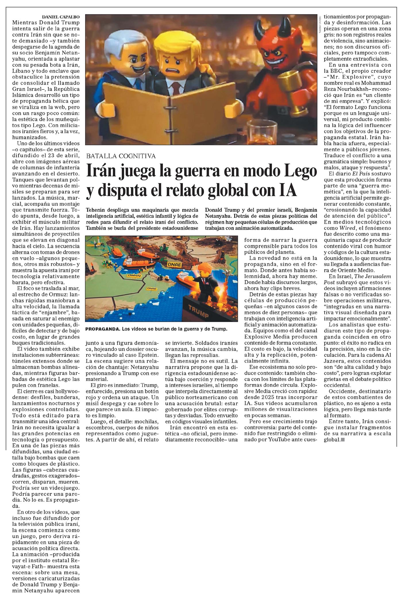 Irán juega la guerra en modo Lego y disputa el relato global con IA DANIEL CAPALBO Mientras Donald Trump intenta salir de la guerra contra Irán sin que se note demasiado -y también despegarse de la agenda de su socio Benjamín Netanyahu, orientada a aplastar con su pesada bota a Irán, Líbano y todo enclave que obstaculice la pretensión de consolidar el llamado "Gran Israel", la República Islámica desarrolló un tipo de propaganda bélica que se viraliza en la web, pero con un rasgo poco común: la estética de los muñequitos tipo Lego. Con milicianos iraníes fieros y, a la vez, humanizados. Uno de los últimos videos -o capítulos- de esta serie, difundido el 23 de abril, abre con imágenes aéreas de columnas de infantería avanzando en el desierto. Tanques que levantan polvo mientras decenas de misiles se preparan para ser lanzados. La música, marcial, acompaña un montaje que transmite fuerza. Todo apunta, desde luego, a exhibir el músculo militar de Irán. Hay lanzamientos simultáneos de proyectiles que se elevan en diagonal hacia el cielo. La secuencia alterna con tomas de drones en vuelo -algunos pequeños, otros más robustos- y muestra la apuesta iraní por tecnología relativamente barata, pero efectiva. El foco se traslada al mar, al estrecho de Ormuz: lanchas rápidas maniobran a alta velocidad, la llamada táctica de “enjambre”, basada en saturar al enemigo con unidades pequeñas, difíciles de detectar y de bajo costo, en lugar de grandes buques tradicionales. El video también exhibe instalaciones subterráneas: túneles extensos donde se almacenan bombas alineadas, mientras figuras barbadas de estética Lego las pulen con franelas. El cierre es casi hollywoodense: desfiles, banderas, lanzamientos nocturnos y explosiones controladas. Todo está editado para transmitir una idea central: Irán no necesita igualar a las grandes potencias en tecnología o presupuesto. En una de las piezas más difundidas, una ciudad estalla bajo bombas que caen como bloques de plástico. Las figuras —cabezas cuadradas, gestos exagerados— corren, disparan, mueren. Podría ser un videojuego. Podría parecer una parodia. No lo es. Es propaganda. En otro de los videos, que incluso fue difundido por la televisión pública iraní, la escena comienza como un juego, pero deriva rápidamente en una pieza de acusación política directa. La animación –producida por el instituto estatal Revayat-e Fath– muestra esta escena: sobre una mesa, versiones caricaturizadas de Donald Trump y Benjamín Netanyahu aparecen junto a una figura demoníaca, hojeando un dossier oscuro vinculado al caso Epstein. La escena sugiere una relación de chantaje: Netanyahu presionando a Trump con ese material. El giro es inmediato: Trump, enfurecido, presiona un botón rojo y ordena un ataque. Un misil despega y cae sobre lo que parece un aula. El impacto es limpio. Luego, el detalle: mochilas, escombros, cuerpos de niños representados como juguetes. A partir de ahí, el relato se invierte. Soldados iraníes avanzan, la música cambia, llegan las represalias. El mensaje no es sutil. La narrativa propone que la dirigencia estadounidense actúa bajo coerción y responde a intereses israelíes, al tiempo que interpela directamente al público norteamericano con una acusación brutal: está gobernado por elites corruptas y desviadas. Todo envuelto en códigos visuales infantiles. Irán encontró en esta estética –no oficial, pero inmediatamente reconocible– una forma de narrar la guerra comprensible para todos los públicos del planeta. La novedad no está en la propaganda, sino en el formato. Donde antes había solemnidad, ahora hay meme. Donde había discursos largos, ahora hay clips breves. Detrás de estas piezas hay células de producción pequeñas —en algunos casos de menos de diez personas— que trabajan con inteligencia artificial y animación automatizada. Equipos como el del canal Explosive Media producen contenido de forma constante. El costo es bajo, la velocidad alta y la replicación, potencialmente infinita. Ese ecosistema no solo produce contenido: también choca con los límites de las plataformas donde circula. Explosive Media creció con rapidez desde 2025 tras incorporar IA. Sus videos acumularon millones de visualizaciones en pocas semanas. Pero ese crecimiento trajo controversia: parte del contenido fue restringido o eliminado por YouTube ante cuestionamientos por propaganda y desinformación. Las piezas operan en una zona gris: no son registros reales de violencia, sino animaciones; no son discursos oficiales, pero tampoco completamente extraoficiales. En una entrevista con la BBC, el propio creador –“Mr. Explosive”, cuyo nombre real es Mohammad Reza Nourbakhsh– reconoció que Irán es “un cliente de mi empresa”. Y explicó: “El formato Lego funciona porque es un lenguaje universal, mi producto combina la lógica del influencer con los objetivos de la propaganda estatal. Irán habla hacia afuera, especialmente a públicos jóvenes. Traduce el conflicto a una gramática simple: buenos y malos, ataque y respuesta”. El diario El País sostuvo que esta producción forma parte de una “guerra memética”, en la que la inteligencia artificial permite generar contenido constante, “erosionando la capacidad de atención del público”. En medios tecnológicos como Wired, el fenómeno fue descrito como una maquinaria capaz de producir contenido viral con humor y códigos de la cultura estadounidense, lo que muestra su llegada a audiencias fuera de Oriente Medio. En Israel, The Jerusalem Post subrayó que estos videos incluyen afirmaciones falsas o no verificadas sobre operaciones militares, “integradas en una narrativa visual diseñada para impactar emocionalmente”. Los analistas que estudiaron este tipo de propaganda coinciden en otro punto: el éxito no radica en la precisión, sino en la circulación. Para la cadena Al Jazeera, estos contenidos son “de alt
